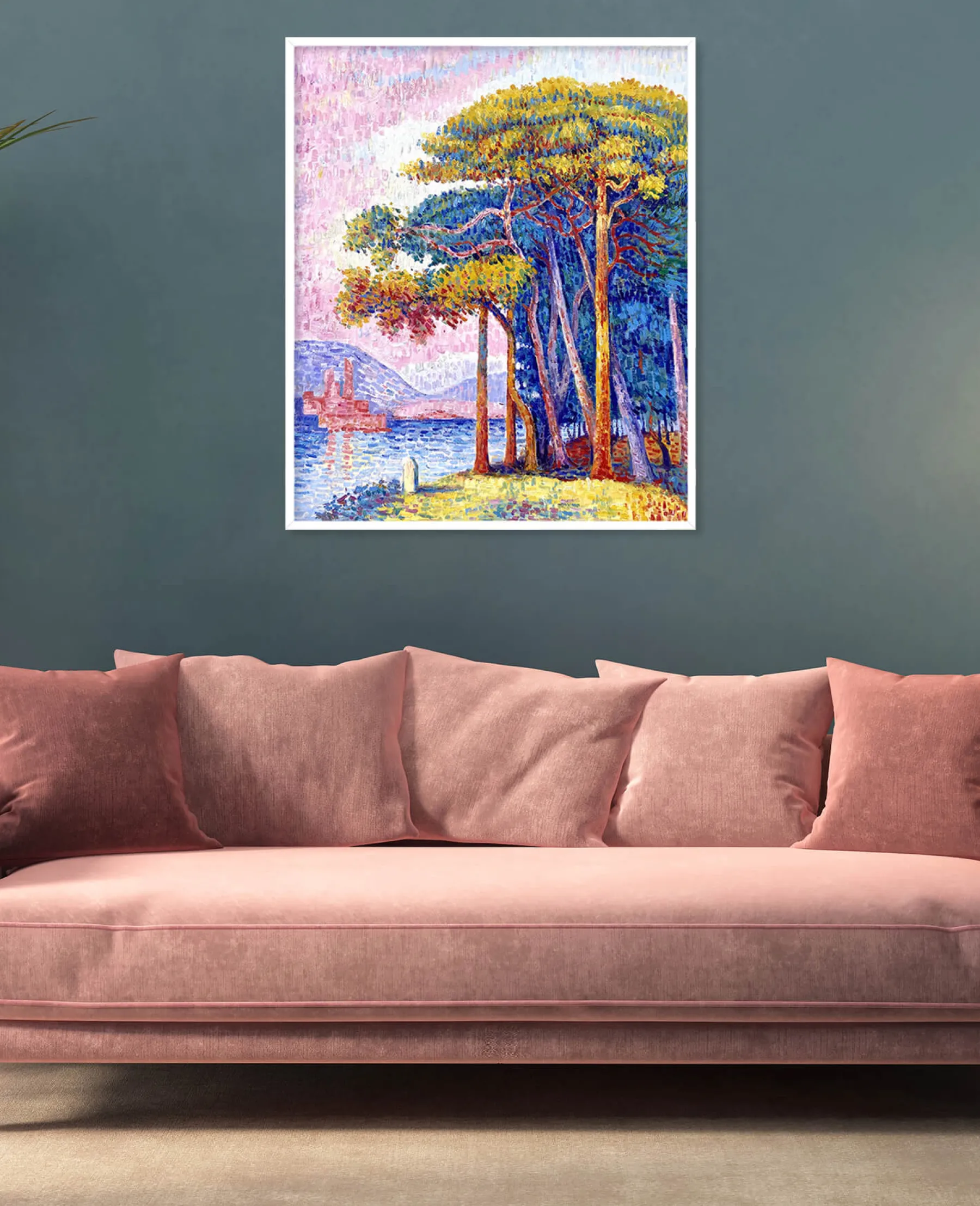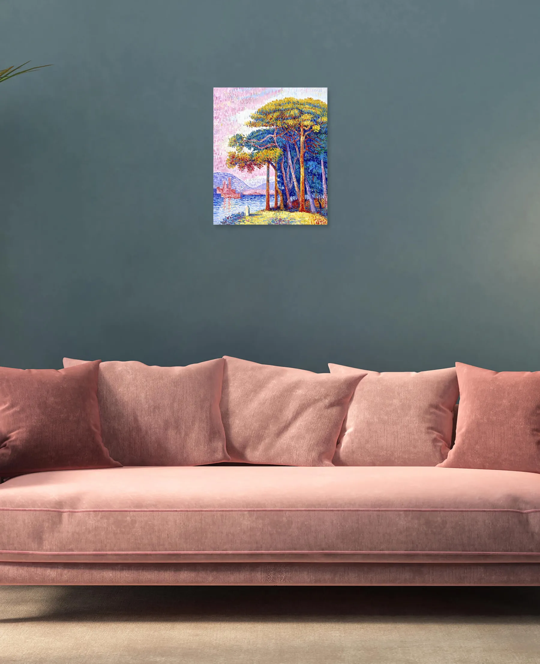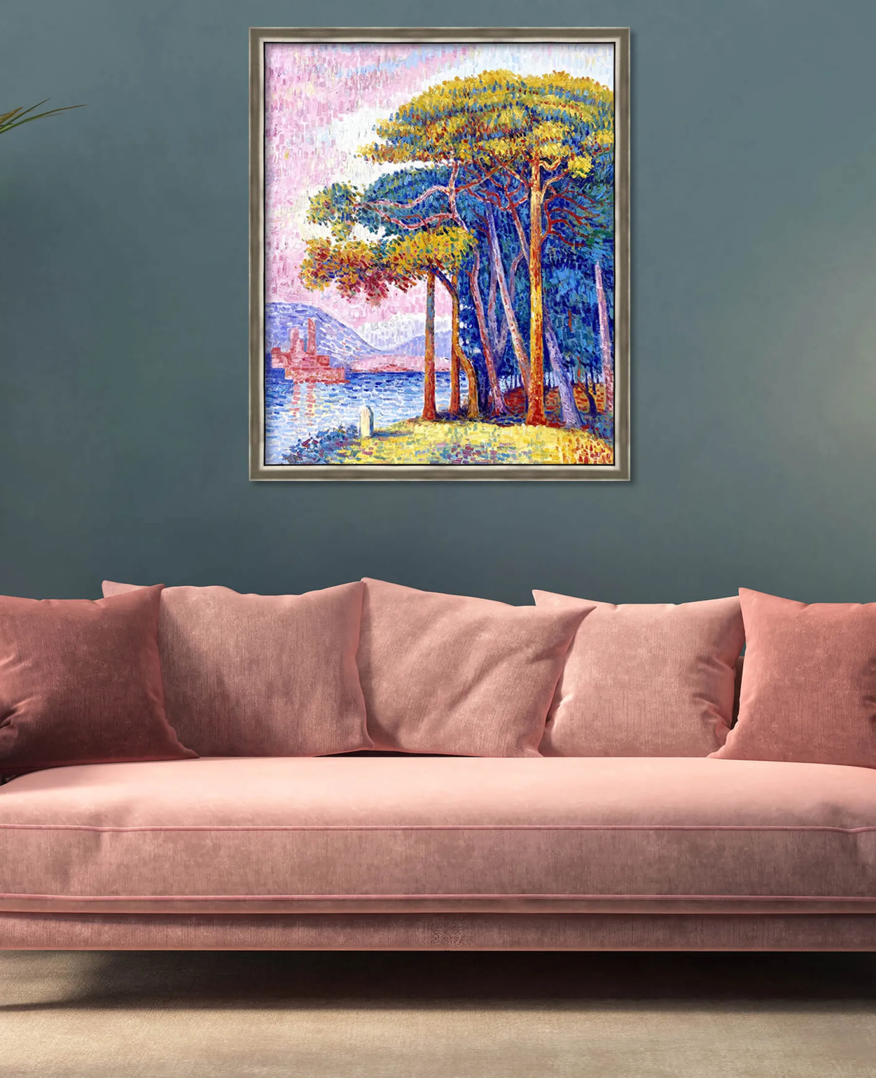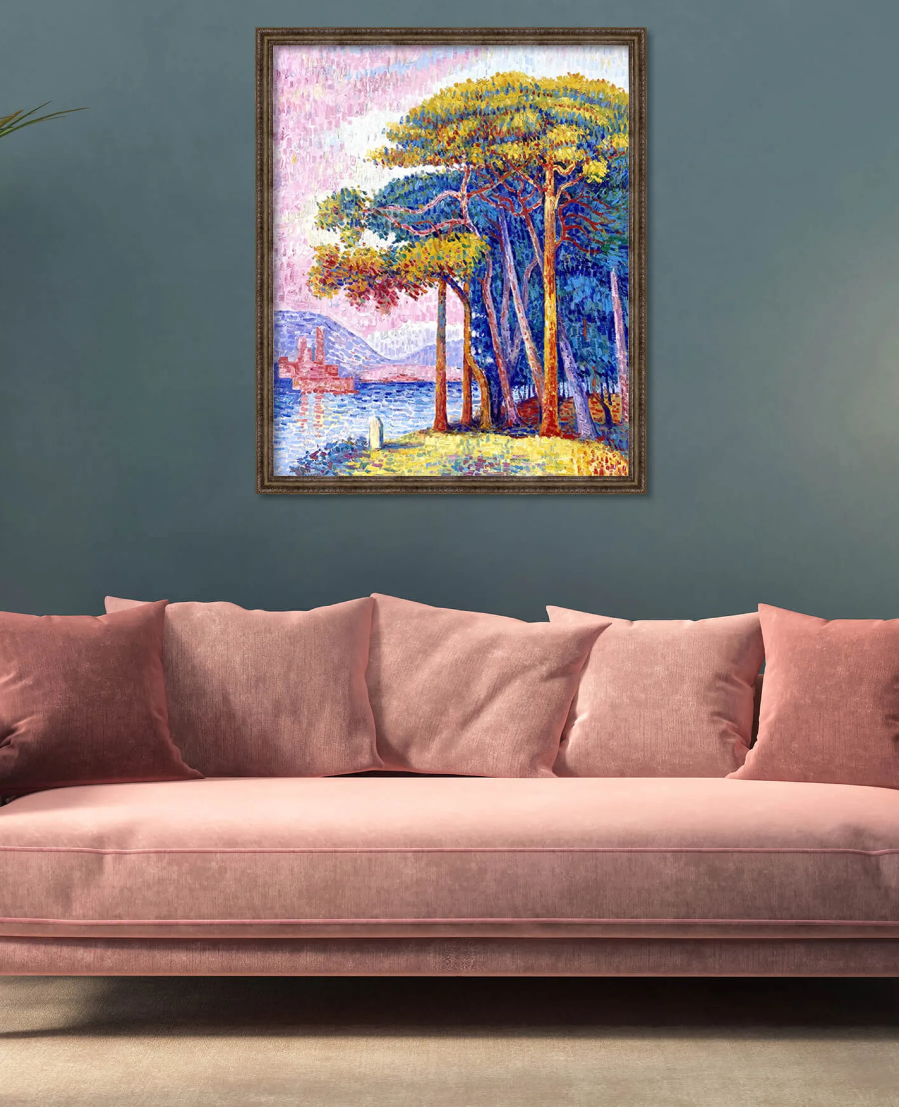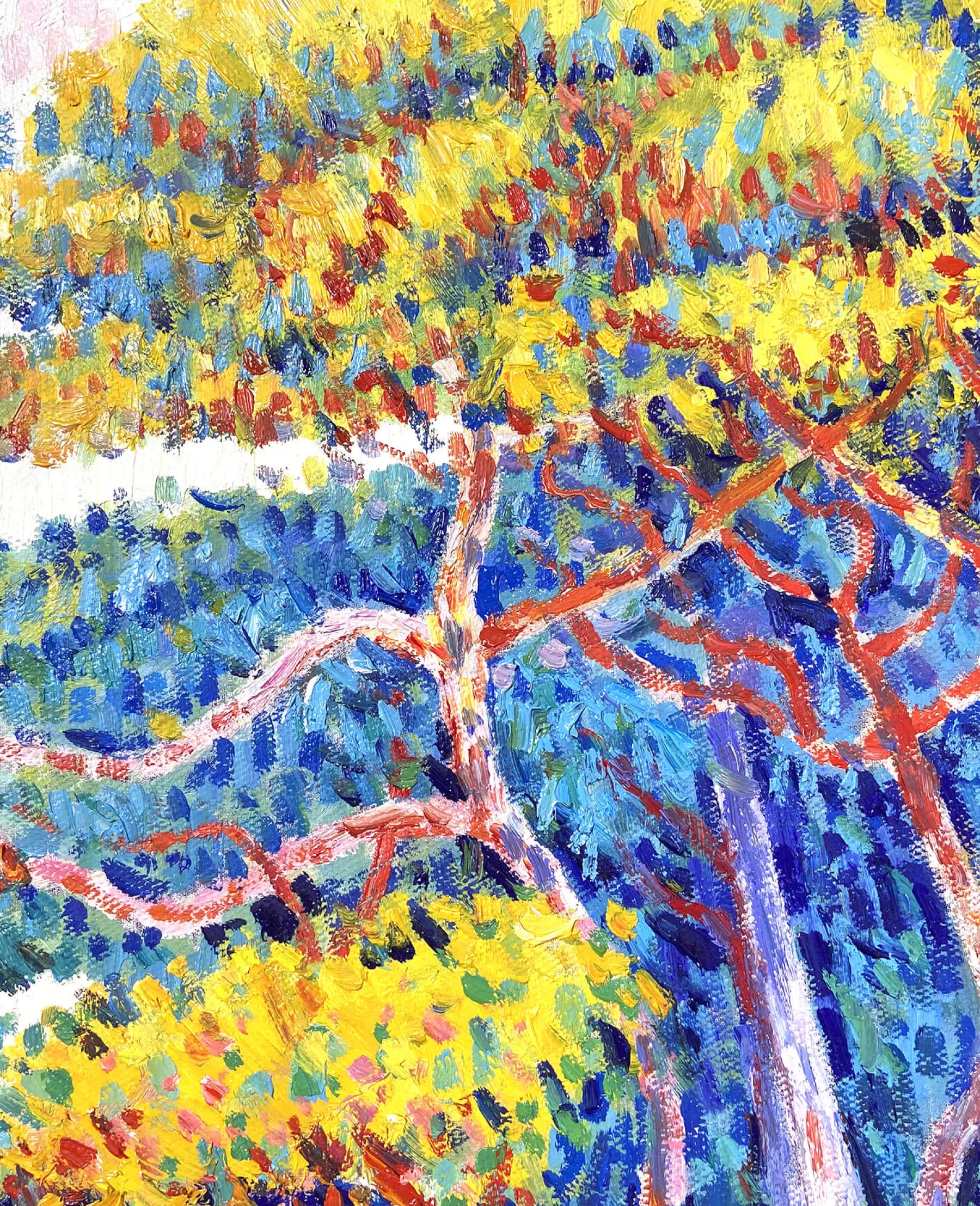 This work is a poetic representation of the pine forest of Antibes, located on the French Riviera. From 1913, Paul Signac regularly stayed in Antibes with his second wife Jeanne Selmersein-Desgranges, also a painter. He particularly enjoyed exploring the seaside of the Mediterranean coast. Here, the colors are not mixed but juxtaposed by small touches, according to the process of division, essence of the current of pointillism. Signac became one of its most illustrious representatives.