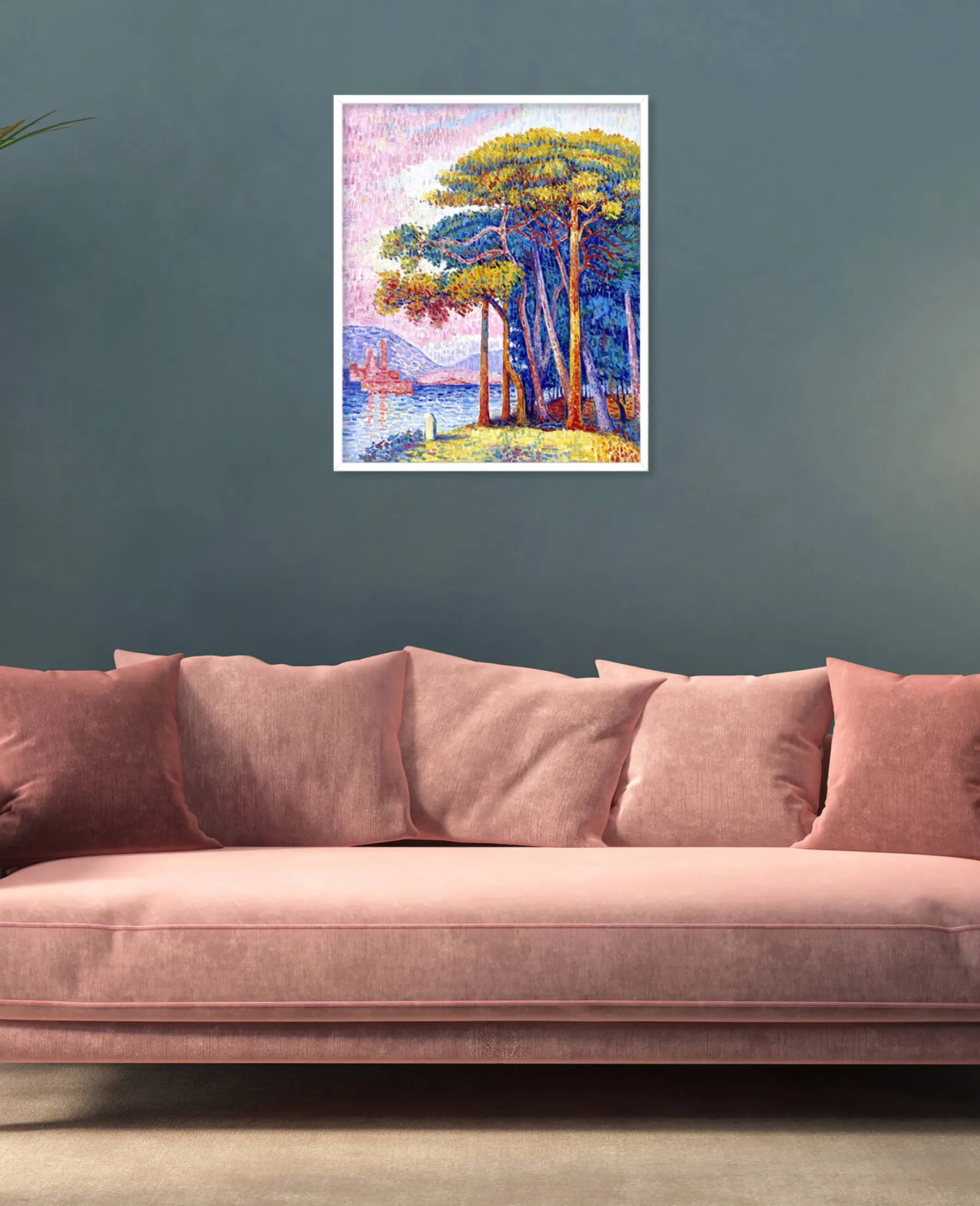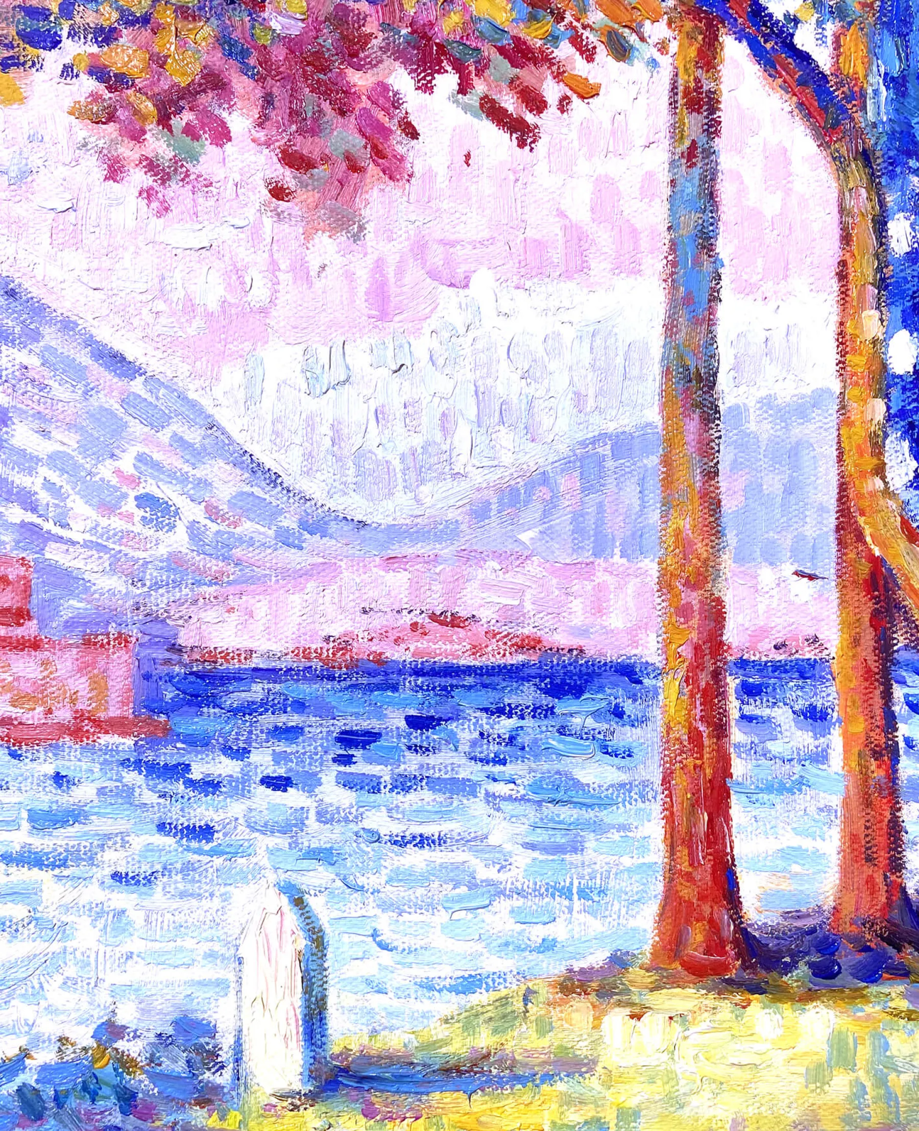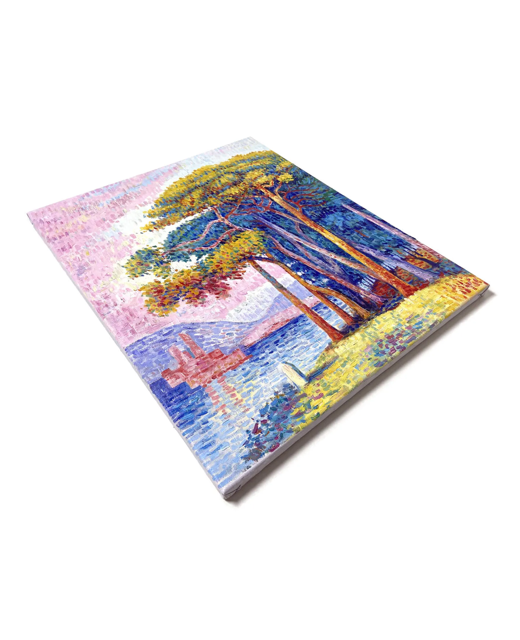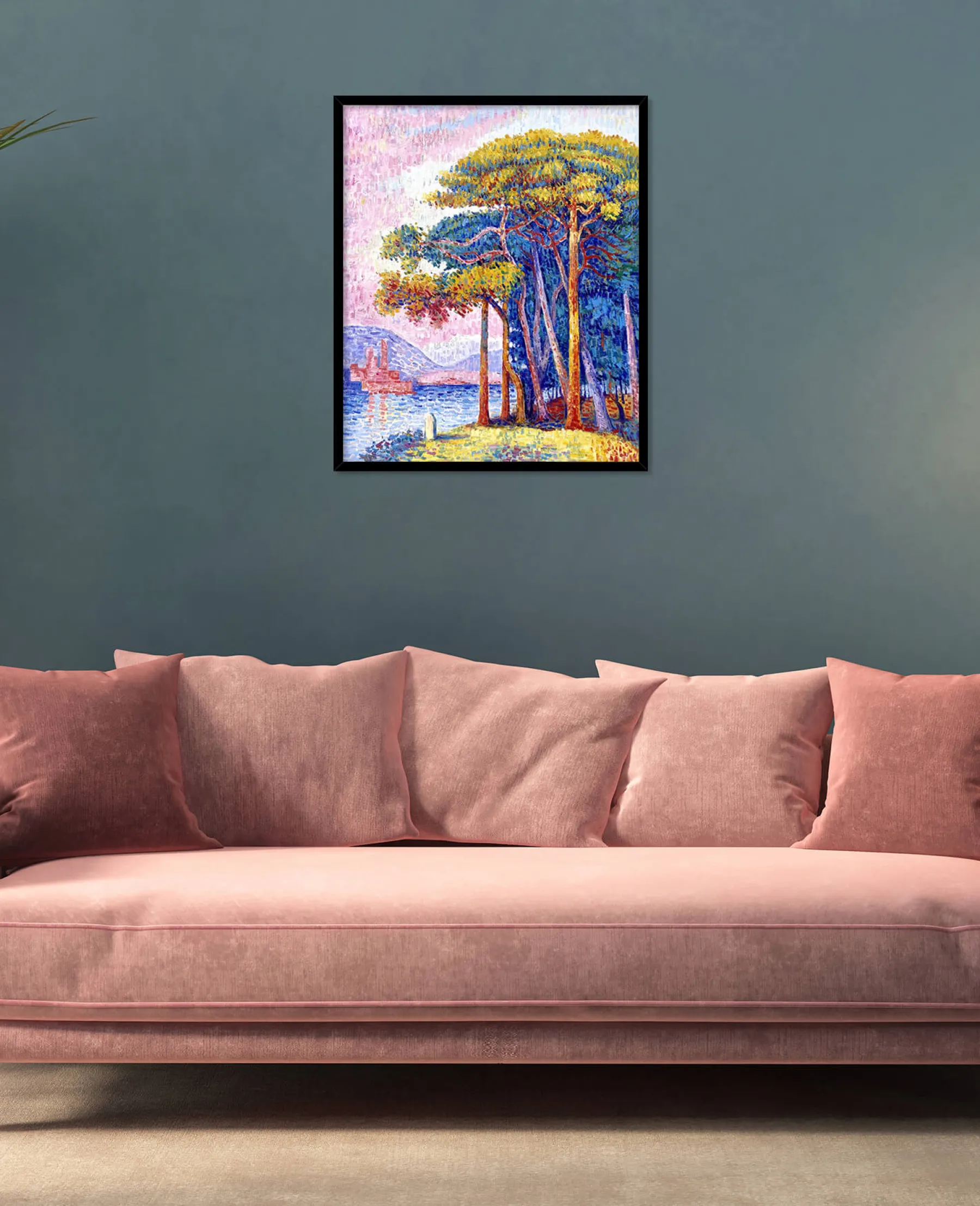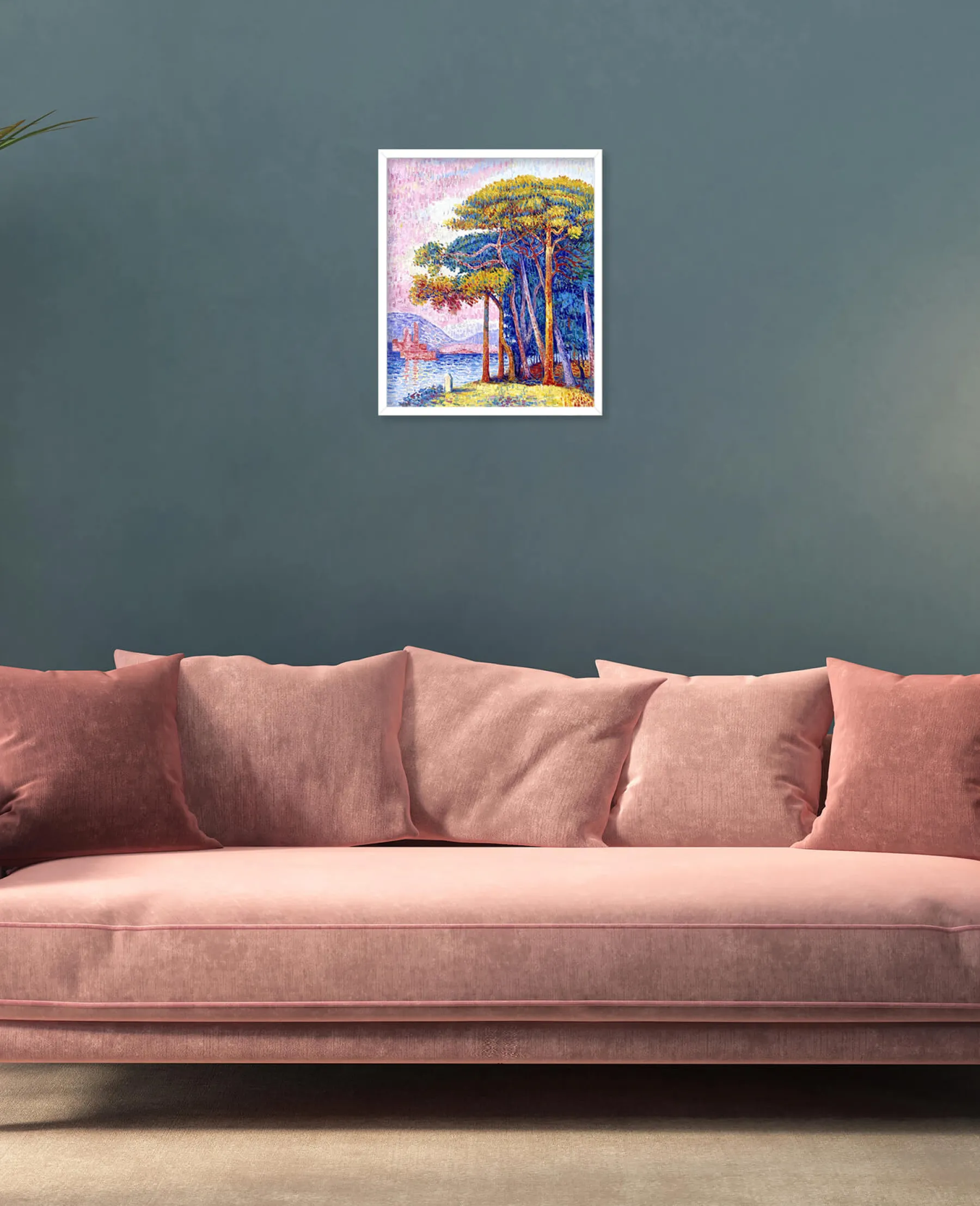This work is a poetic representation of the pine forest of Antibes, located on the French Riviera. From 1913, Paul Signac regularly stayed in Antibes with his second wife Jeanne Selmersein-Desgranges, also a painter. He particularly enjoyed exploring the seaside of the Mediterranean coast. Here, the colors are not mixed but juxtaposed by small touches, according to the process of division, essence of the current of pointillism. Signac became one of its most illustrious representatives.