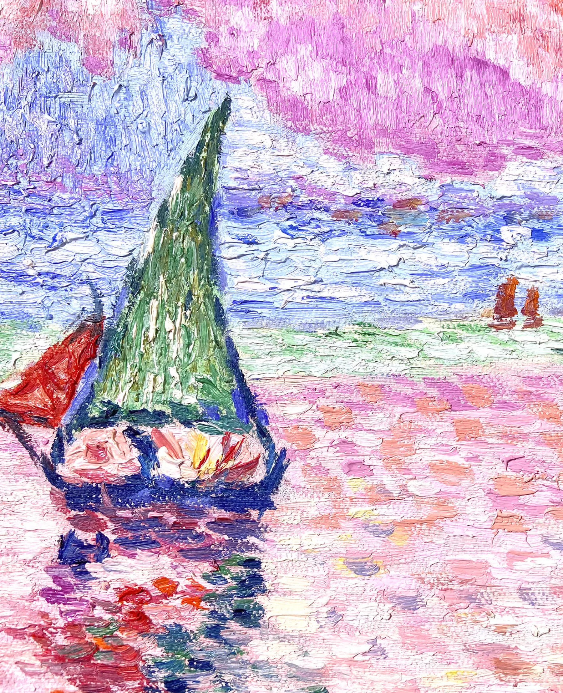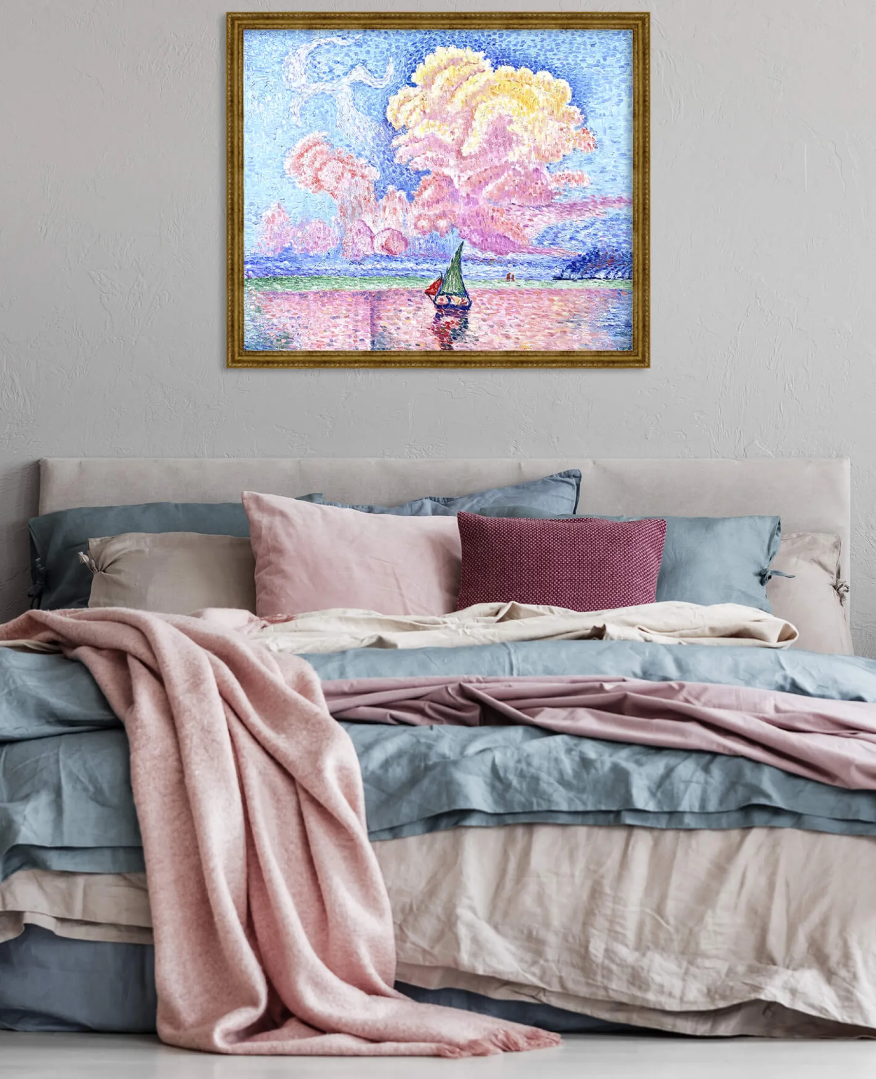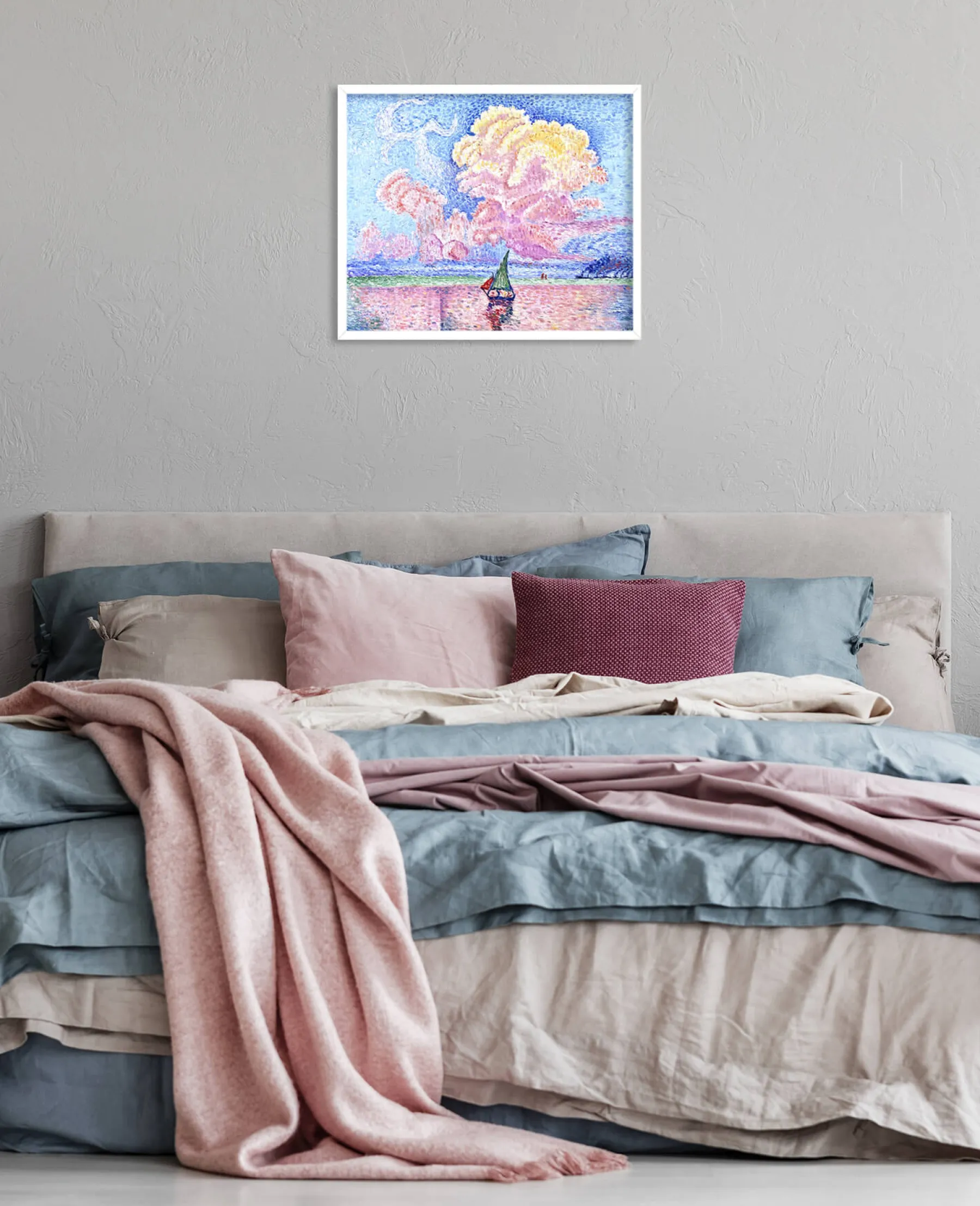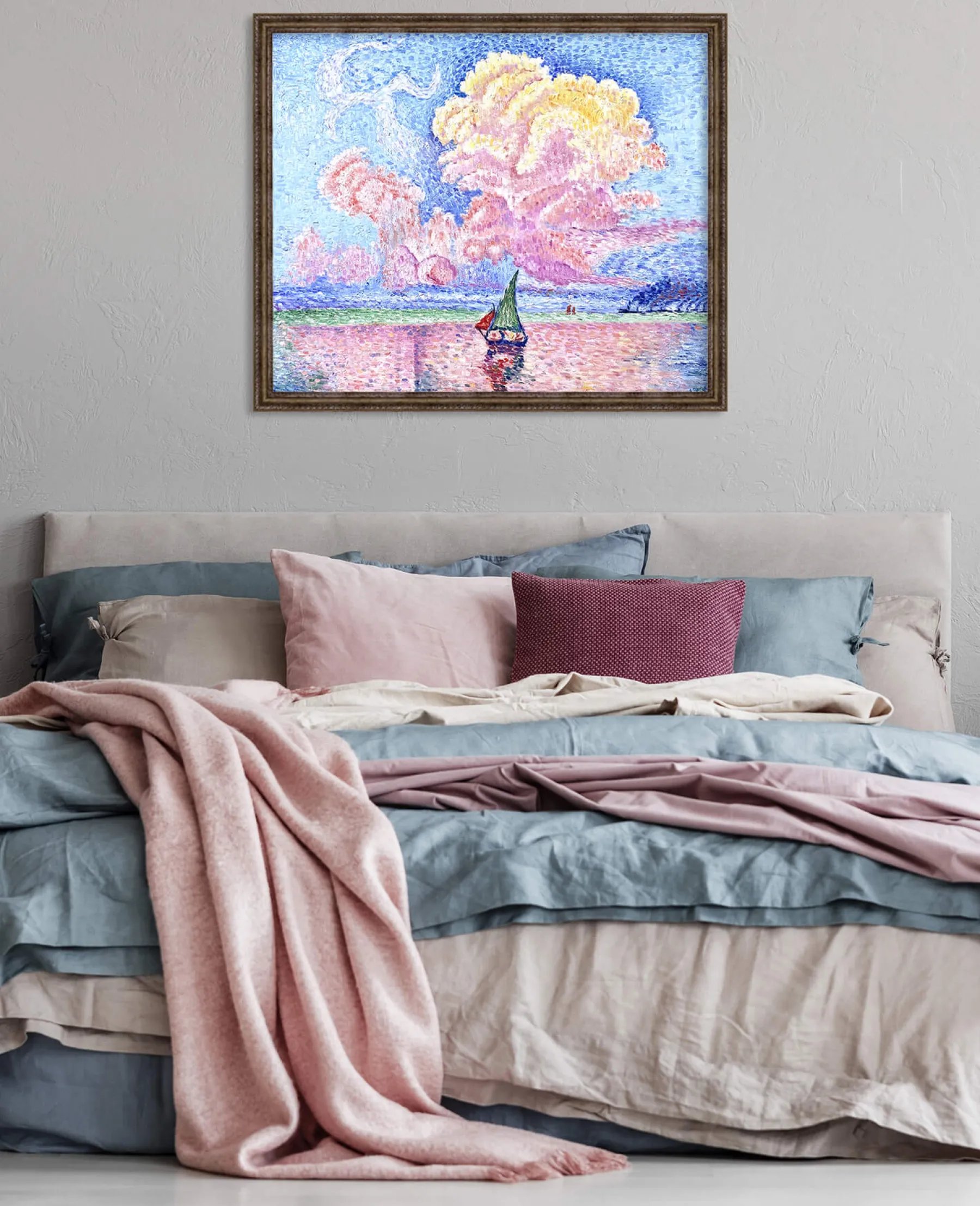 Paul Signac particularly enjoyed exploring the seashores and ports of the Mediterranean coast. The reflections and tranquility of the sea coexist with rosy, almost fairy-like colors. The artist tries to explain all the nuances that the sky takes on during a sunset on the French Riviera. To do this, the colors are not mixed but juxtaposed by small touches, according to the process of division, the essence of the pointillist movement. He became one of its most illustrious representatives.u0026nbsp;This style of painting can be found in several of his works, such as Antibes and Capo Di Noli.