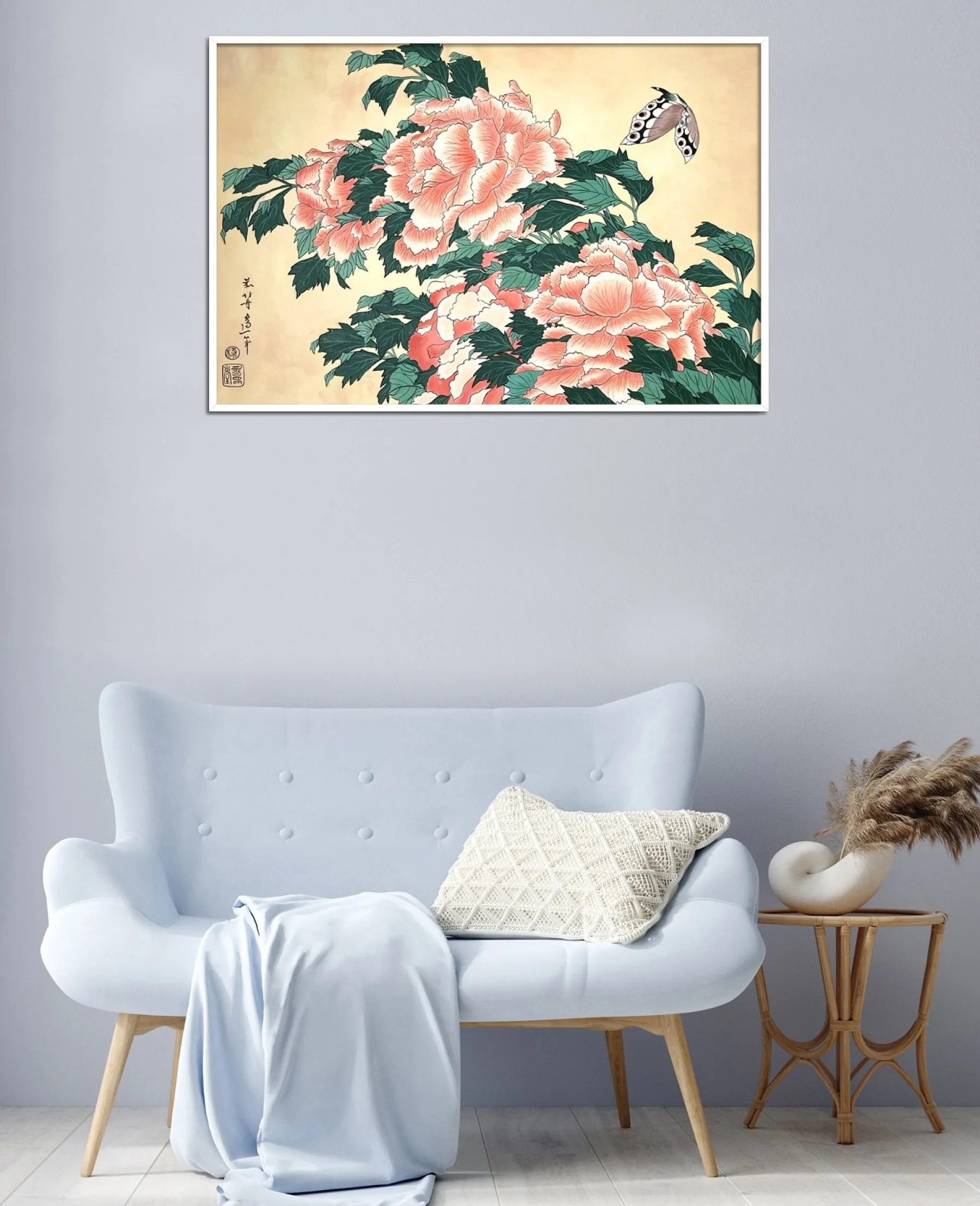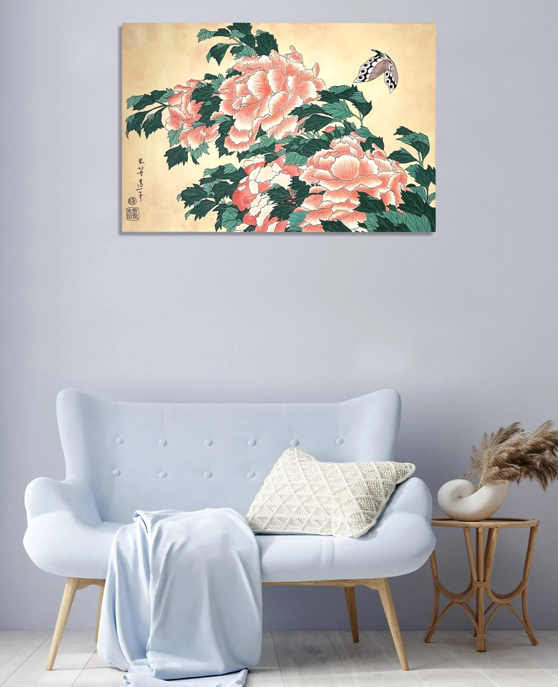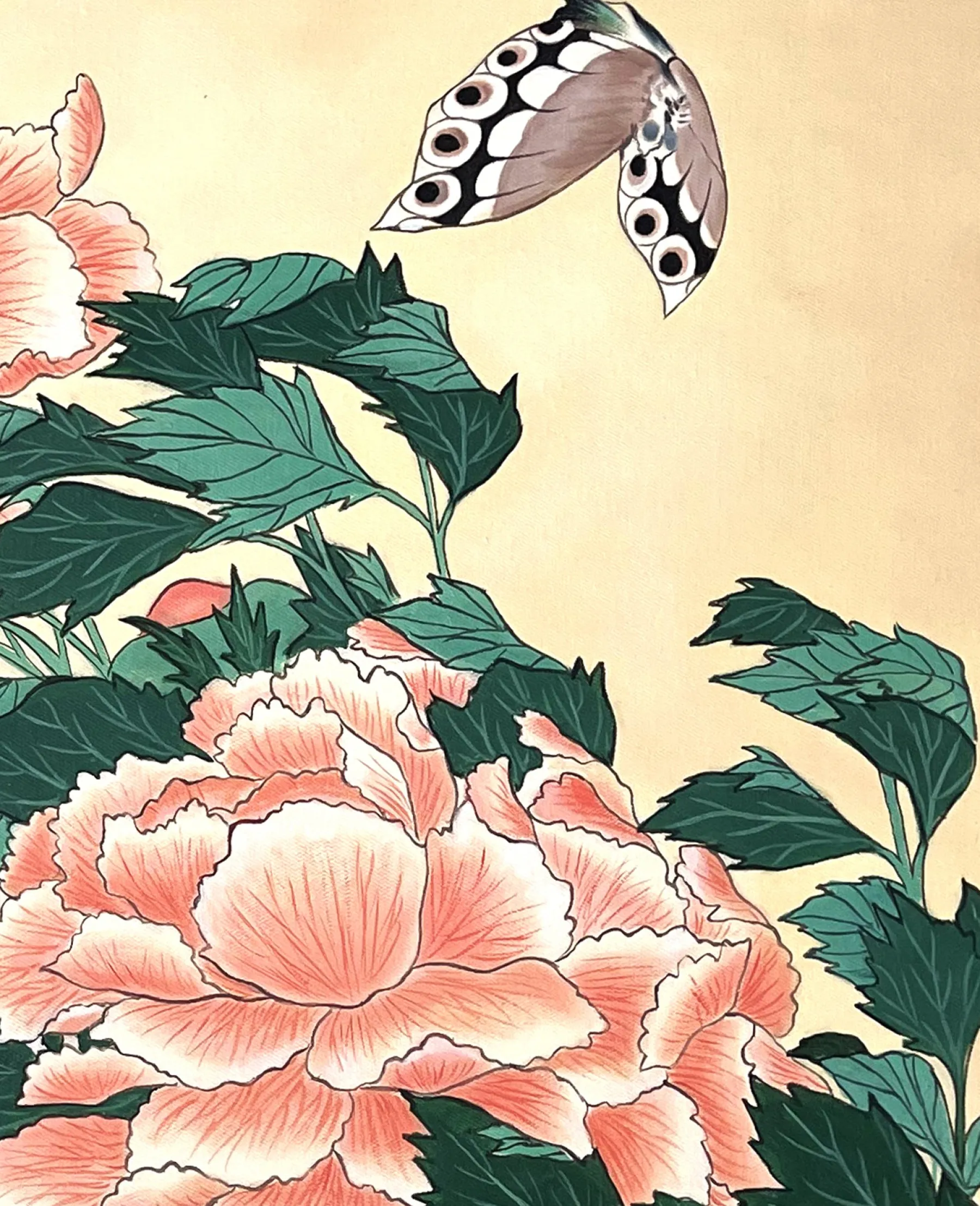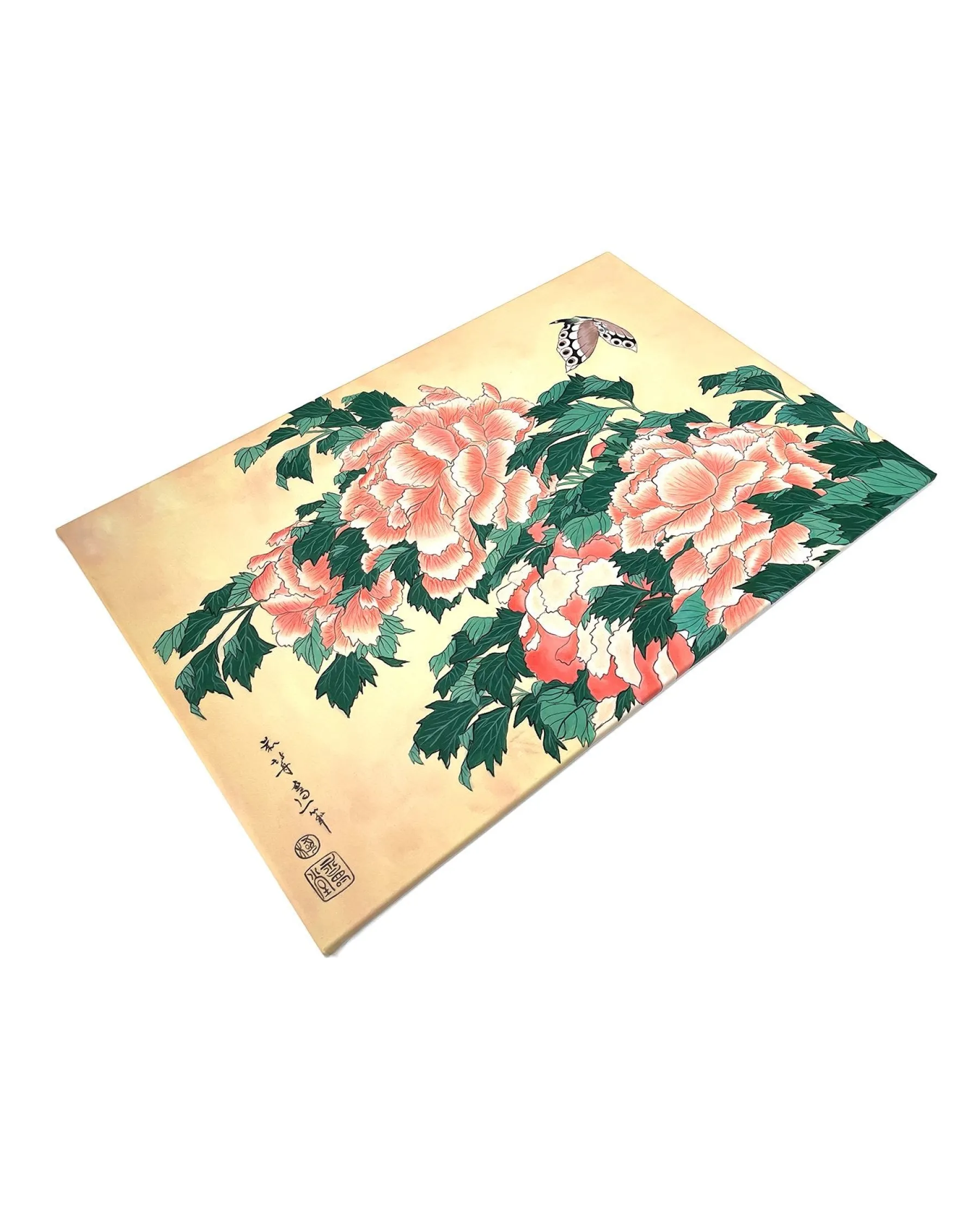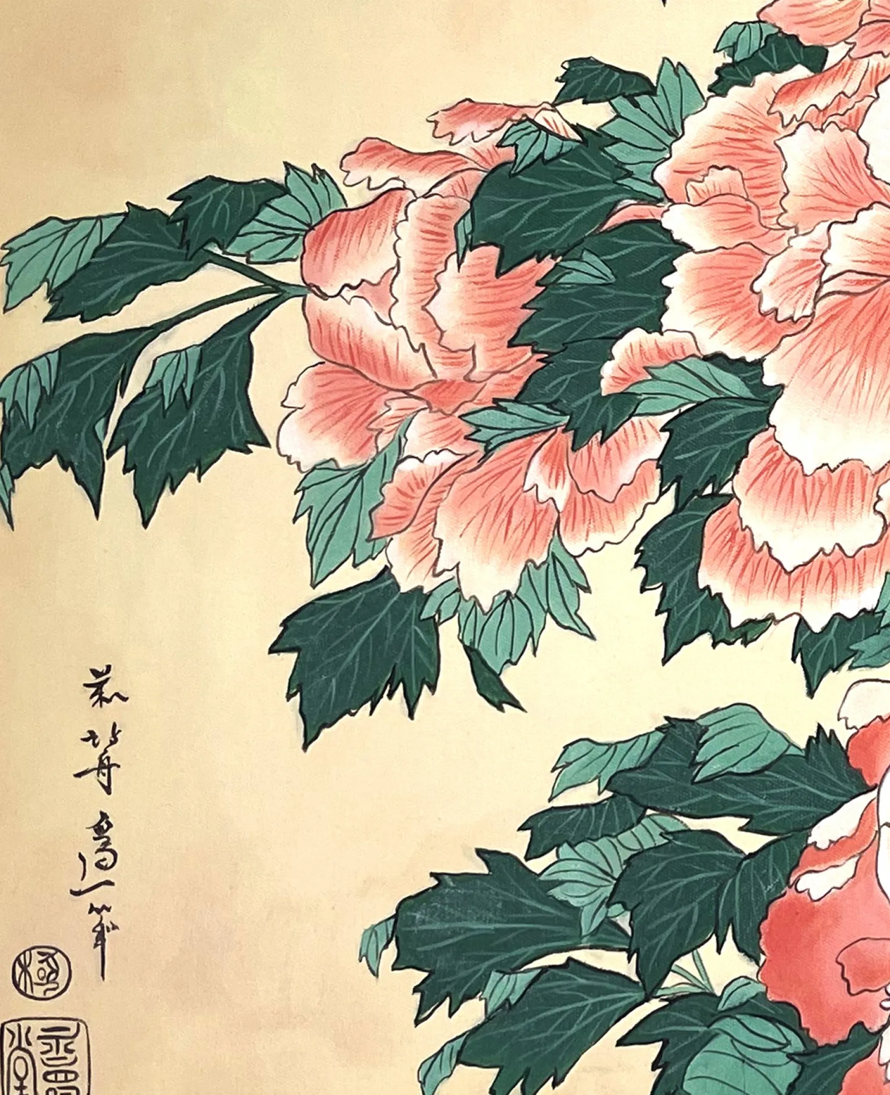 Katsushika Hokusai works with pink and green in this work with fine lines, which is originally a print. These colors, delicately shaded by gradations or radically contrasted by darker hues, bring volume and life to these peonies. A butterfly swirling around the flowers contributes to accentuate the idea of movement and makes the composition poetically animated. An elegant harmony subtly airy emerges from this touching painting, inspired by nature.u0026nbsp;The work reminds us of Peonies and Canary.