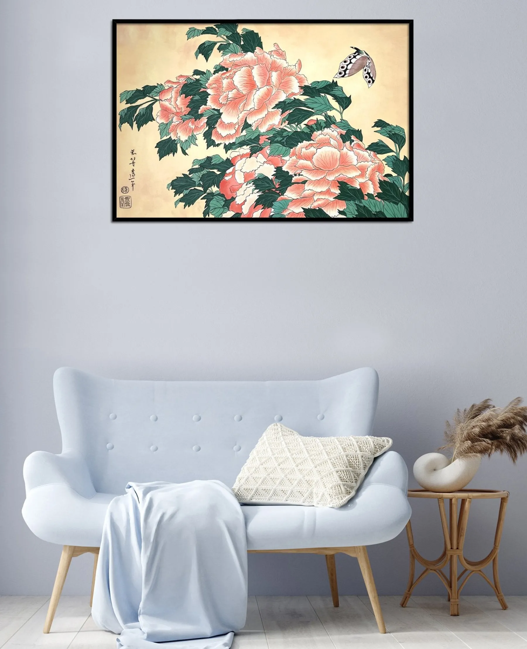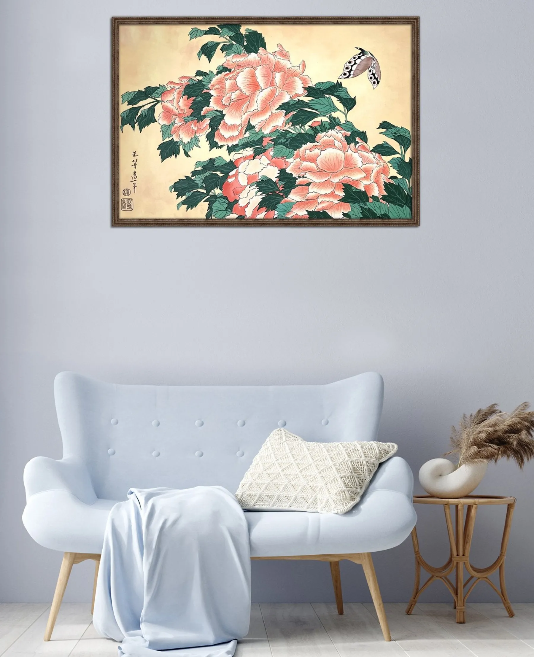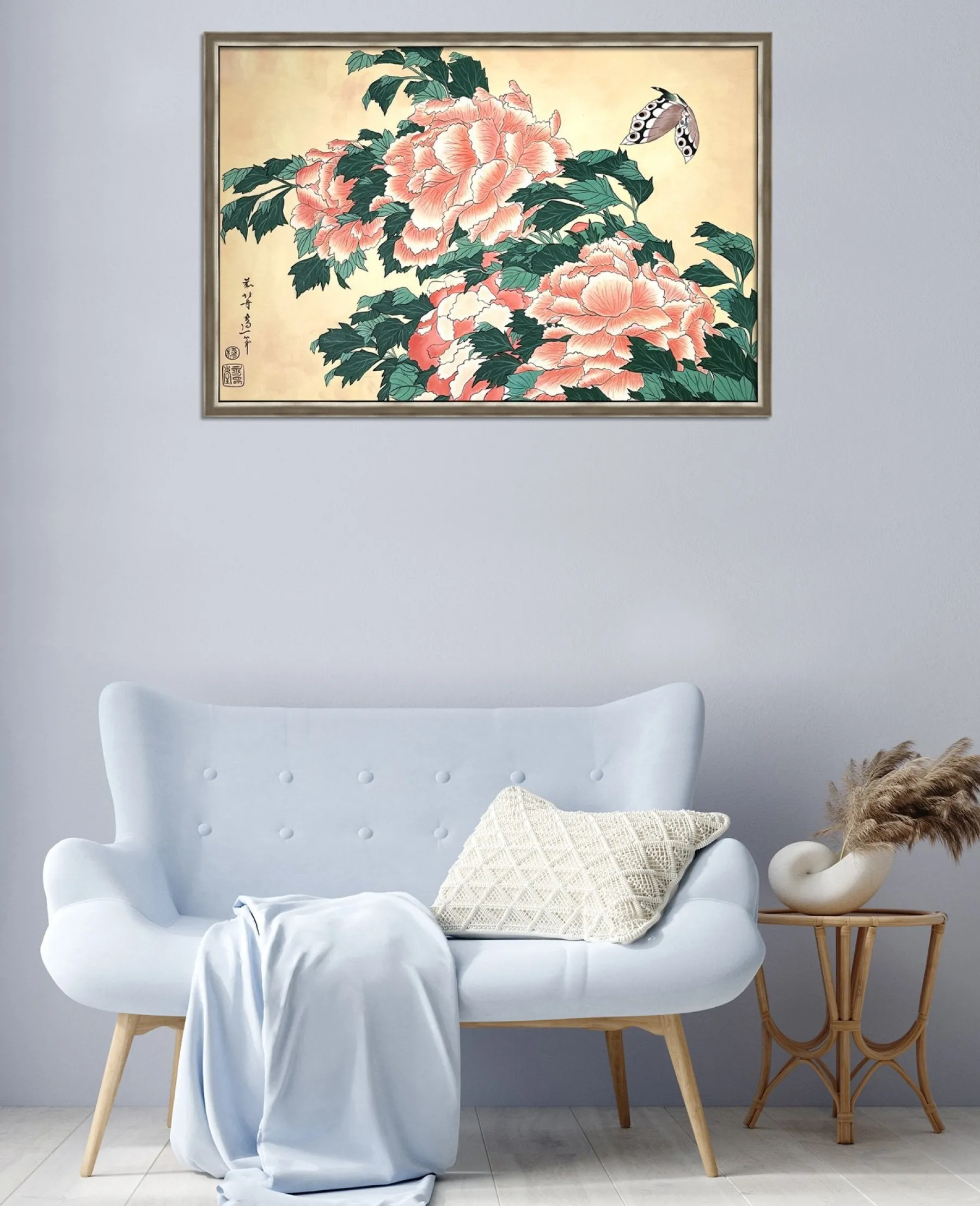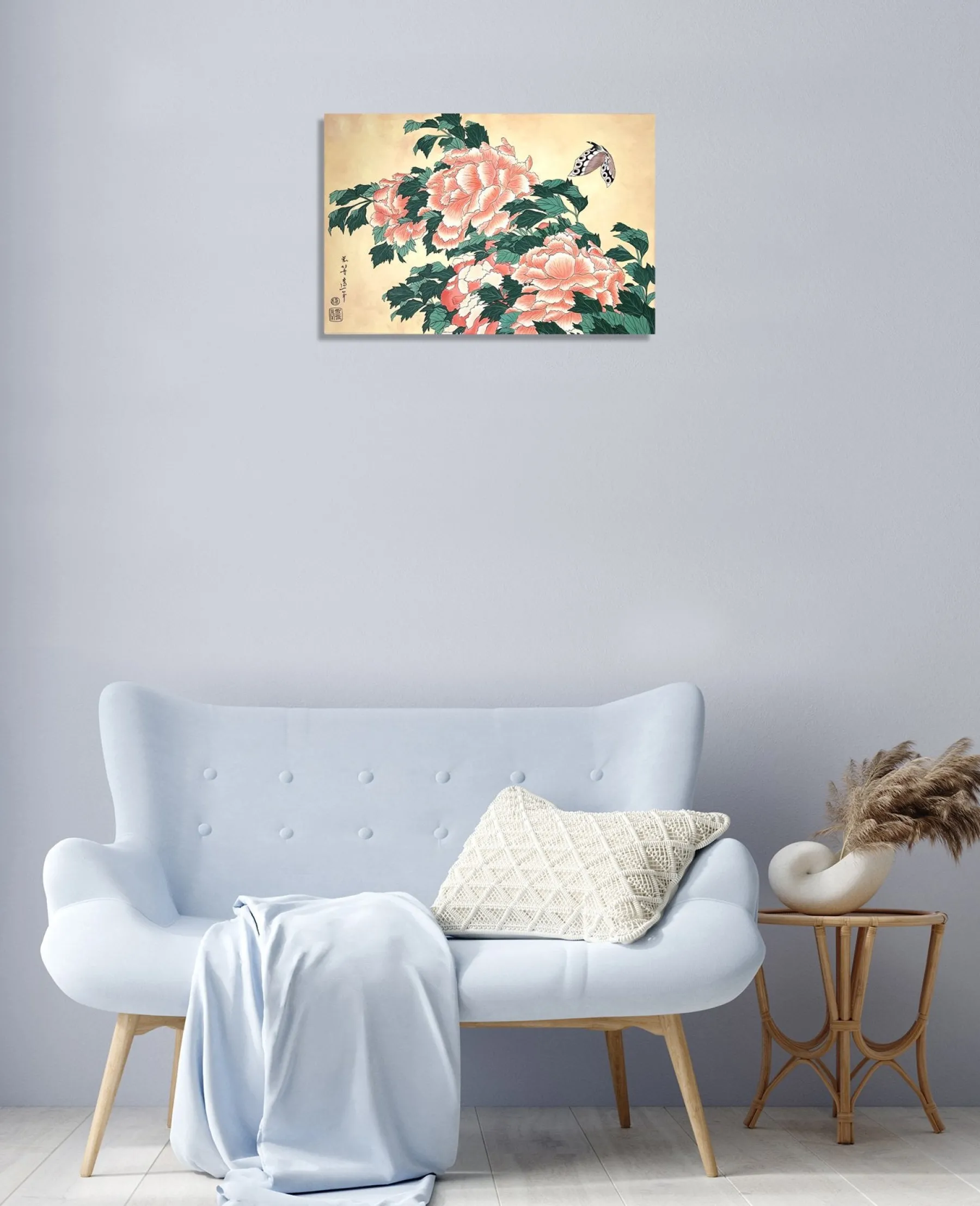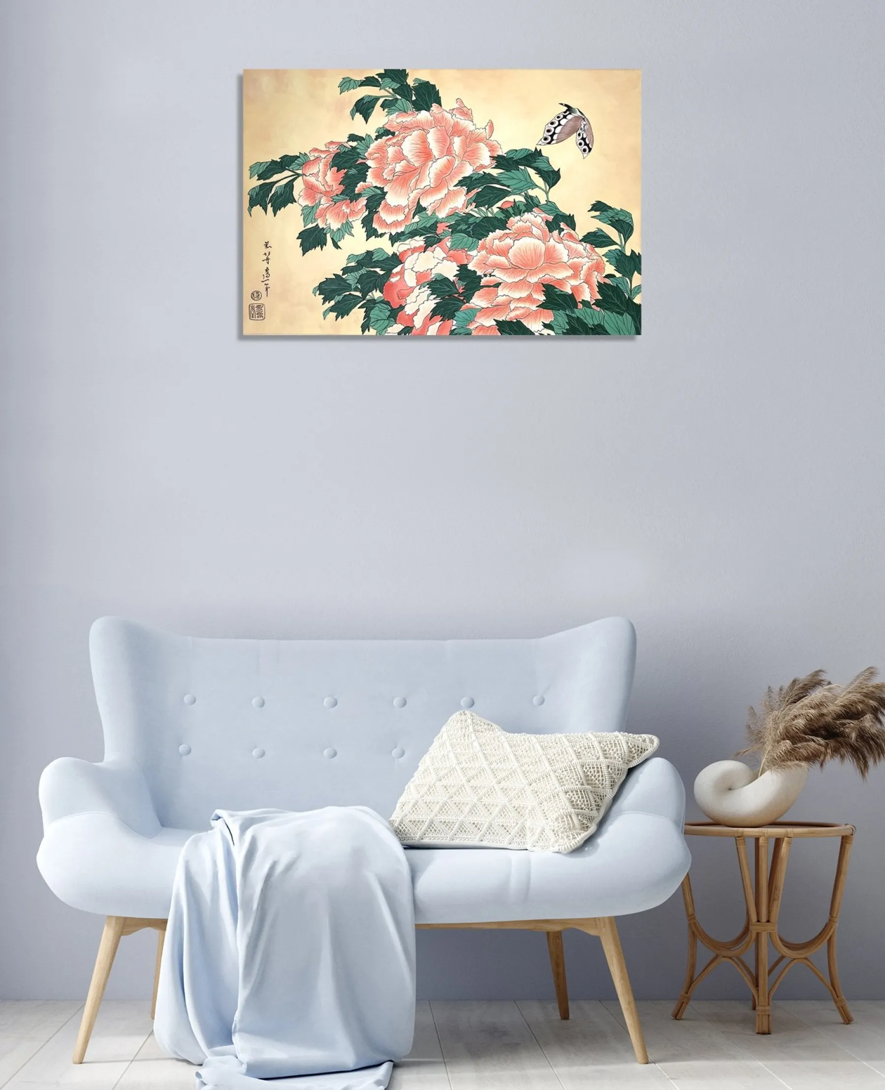 Katsushika Hokusai works with pink and green in this work with fine lines, which is originally a print. These colors, delicately shaded by gradations or radically contrasted by darker hues, bring volume and life to these peonies. A butterfly swirling around the flowers contributes to accentuate the idea of movement and makes the composition poetically animated. An elegant harmony subtly airy emerges from this touching painting, inspired by nature.u0026nbsp;The work reminds us of Peonies and Canary.