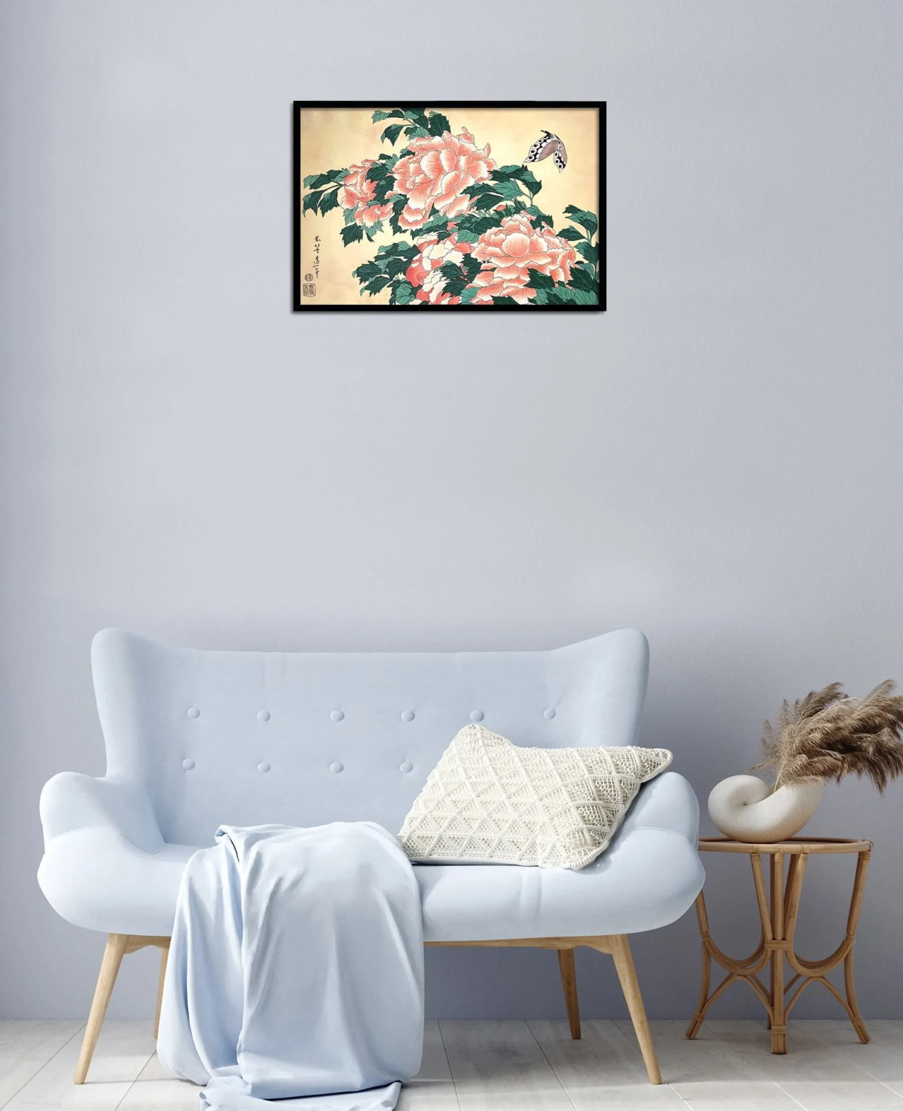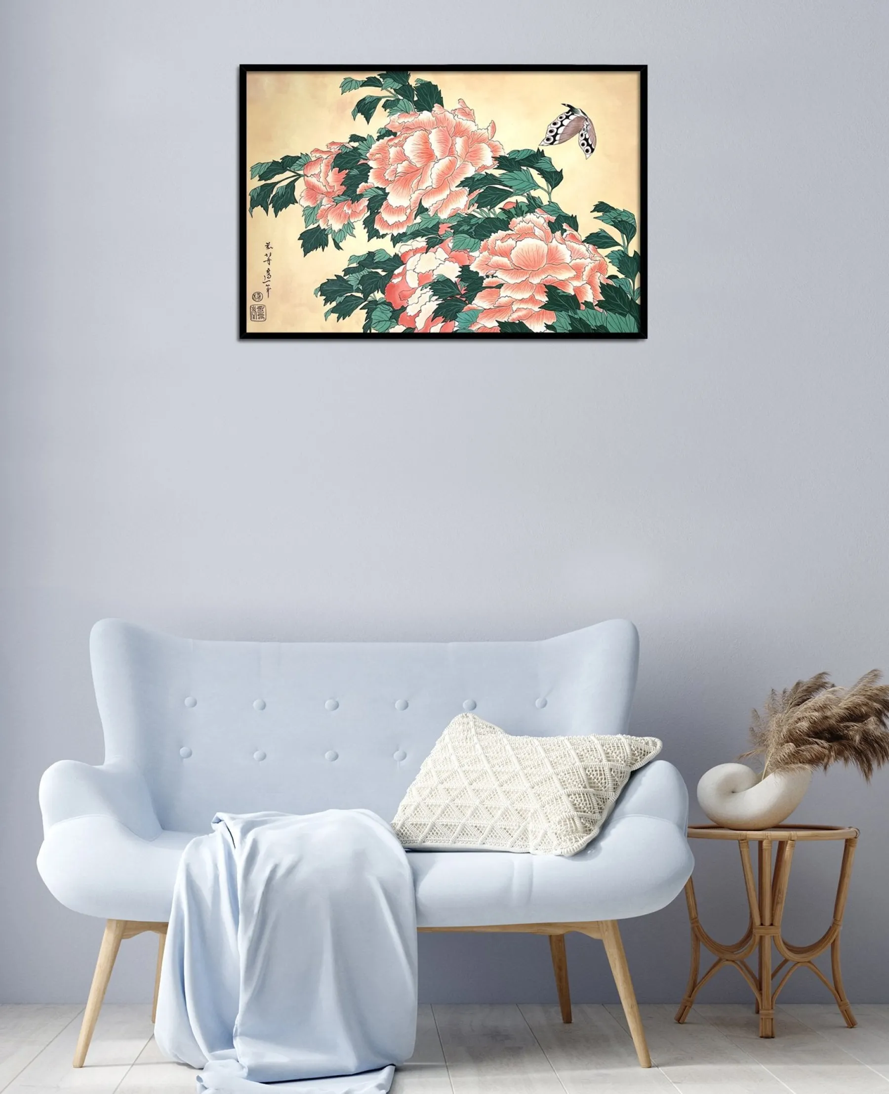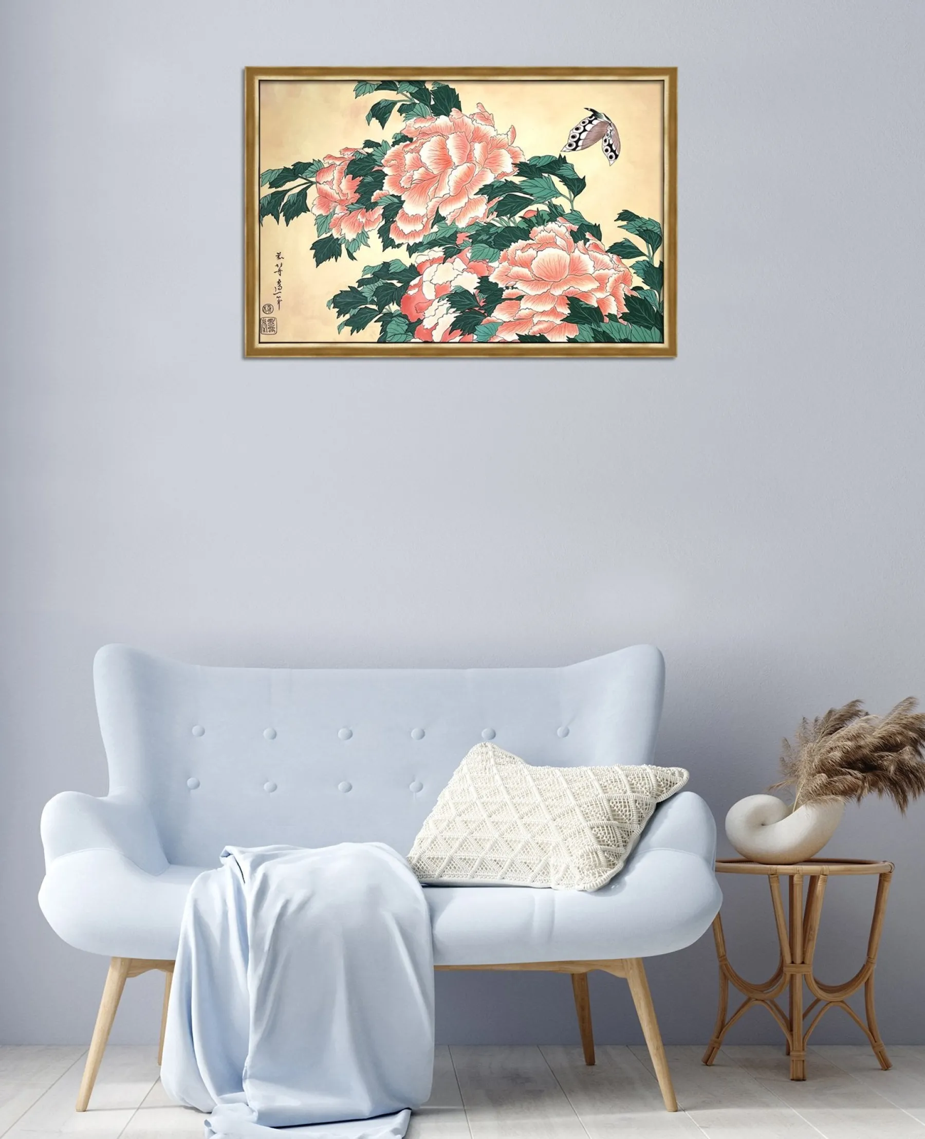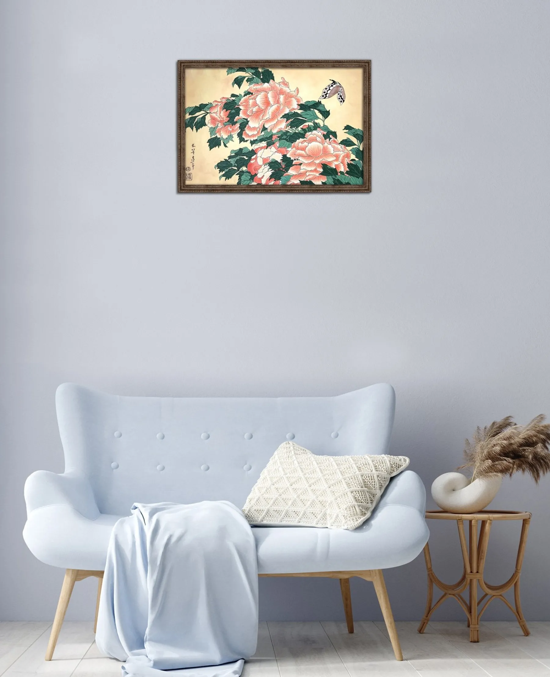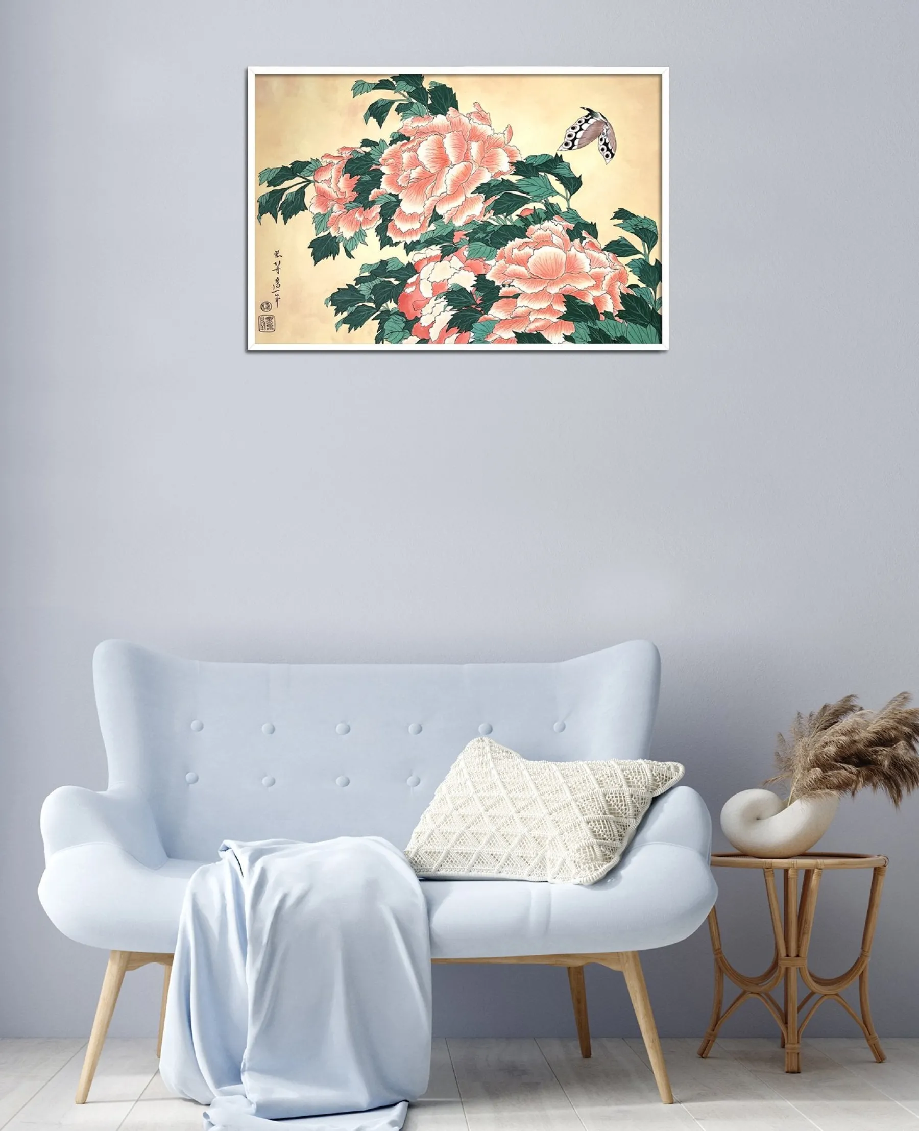 Katsushika Hokusai works with pink and green in this work with fine lines, which is originally a print. These colors, delicately shaded by gradations or radically contrasted by darker hues, bring volume and life to these peonies. A butterfly swirling around the flowers contributes to accentuate the idea of movement and makes the composition poetically animated. An elegant harmony subtly airy emerges from this touching painting, inspired by nature.u0026nbsp;The work reminds us of Peonies and Canary.