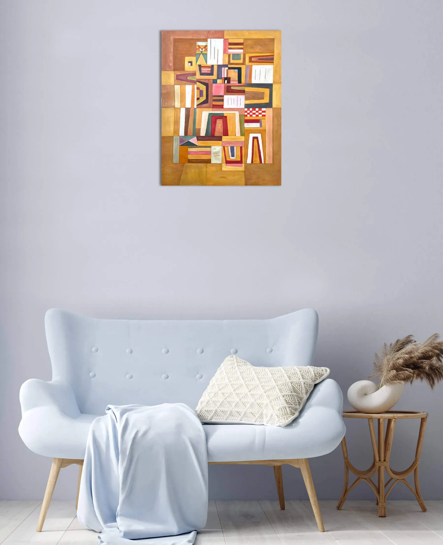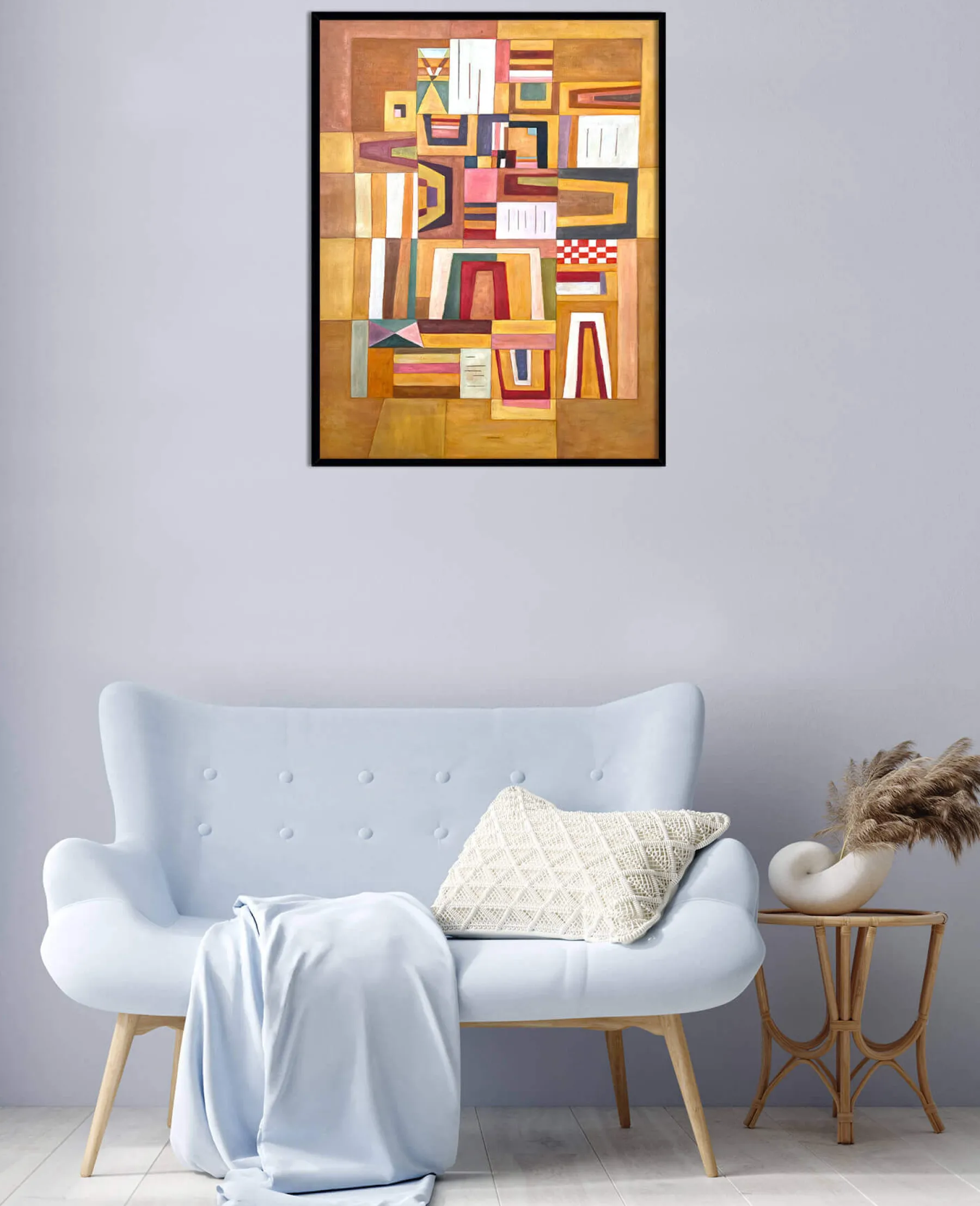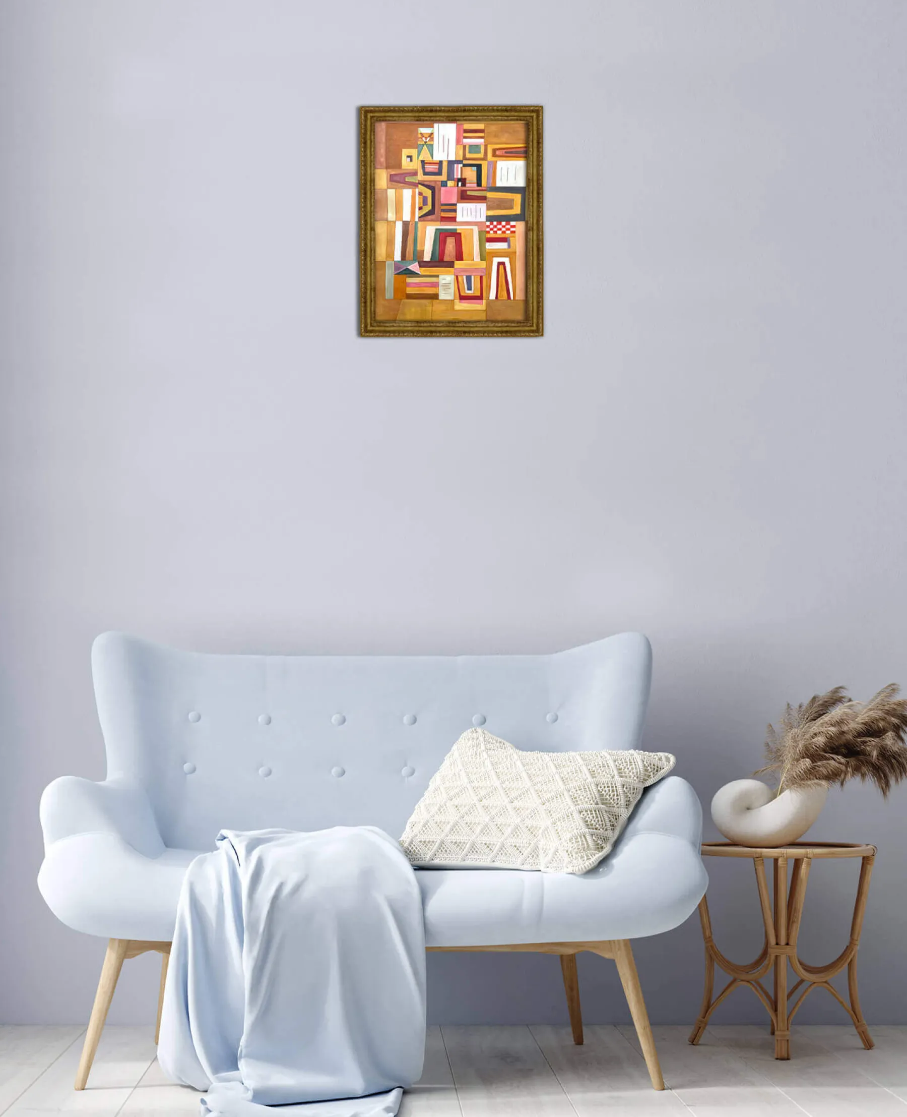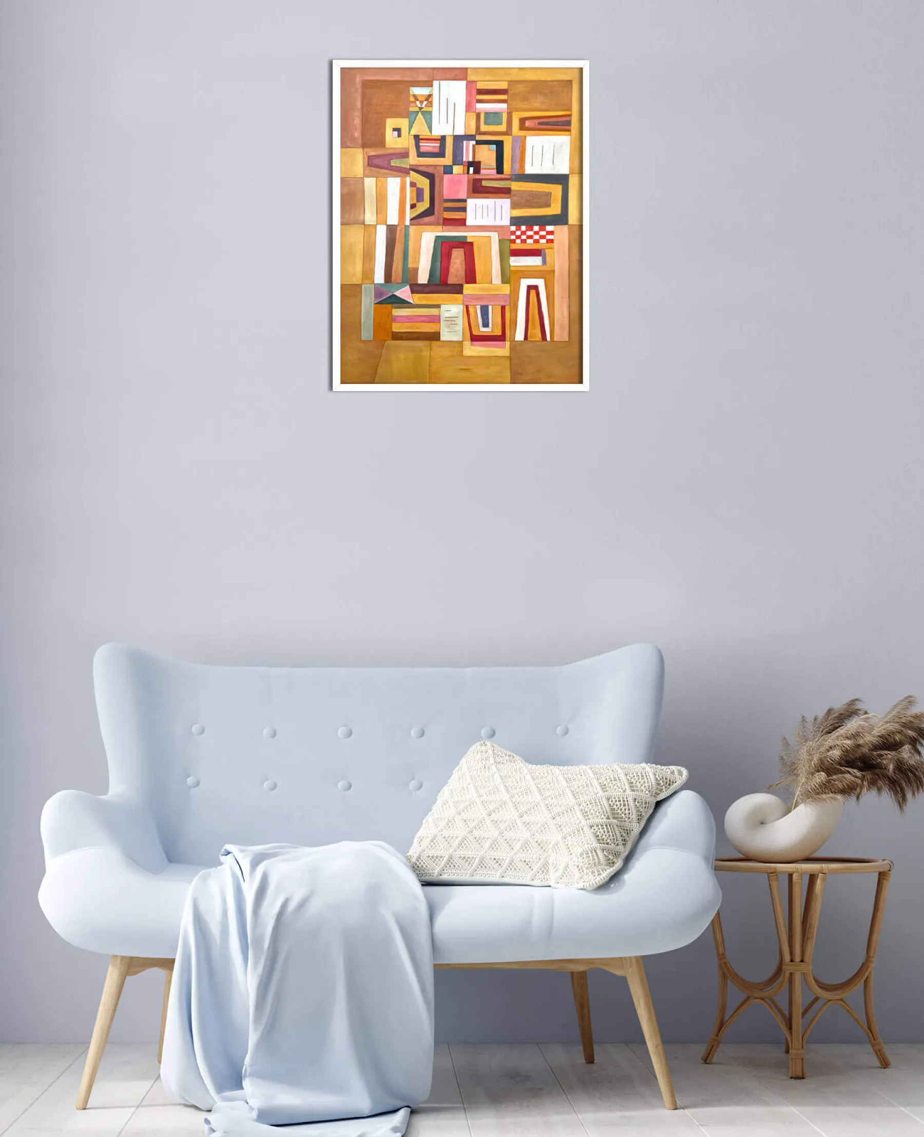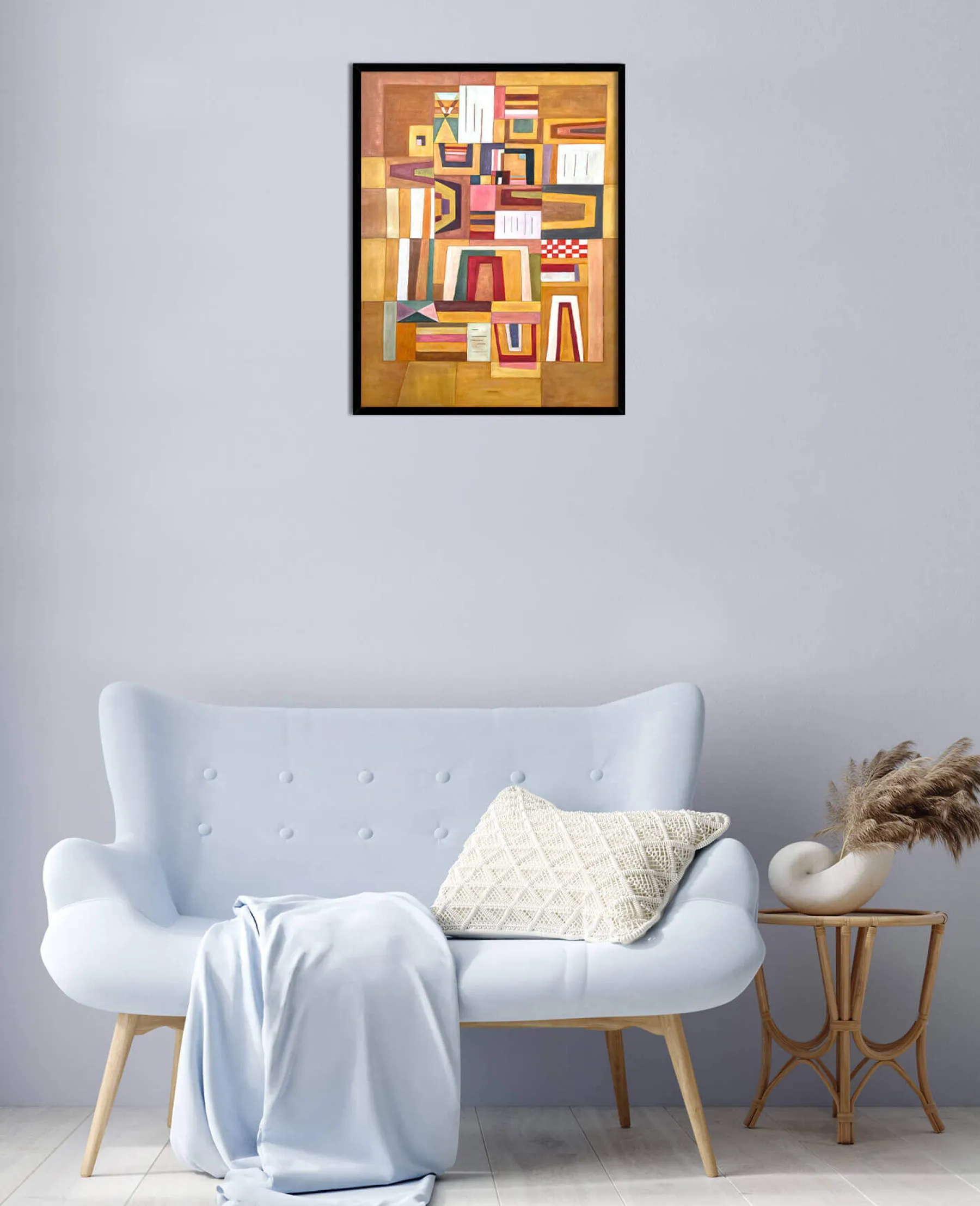 With Ausgleichrosa, Vassily Kandinsky synthesized cubism and the Bauhaus, a German avant-garde movement. In this rectangular abstract painting, geometric shapes are overlaid and then fitted into each other, until they form a playful and colorful puzzle. The right angles meet the trapezoidal shapes, and the thick black lines emphasize the very soft colors.