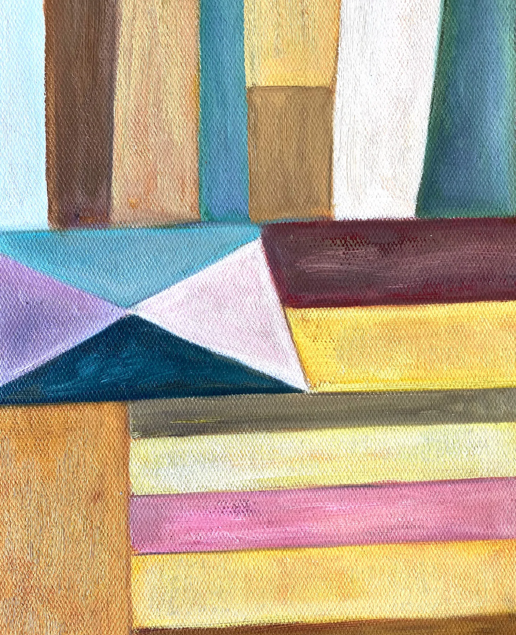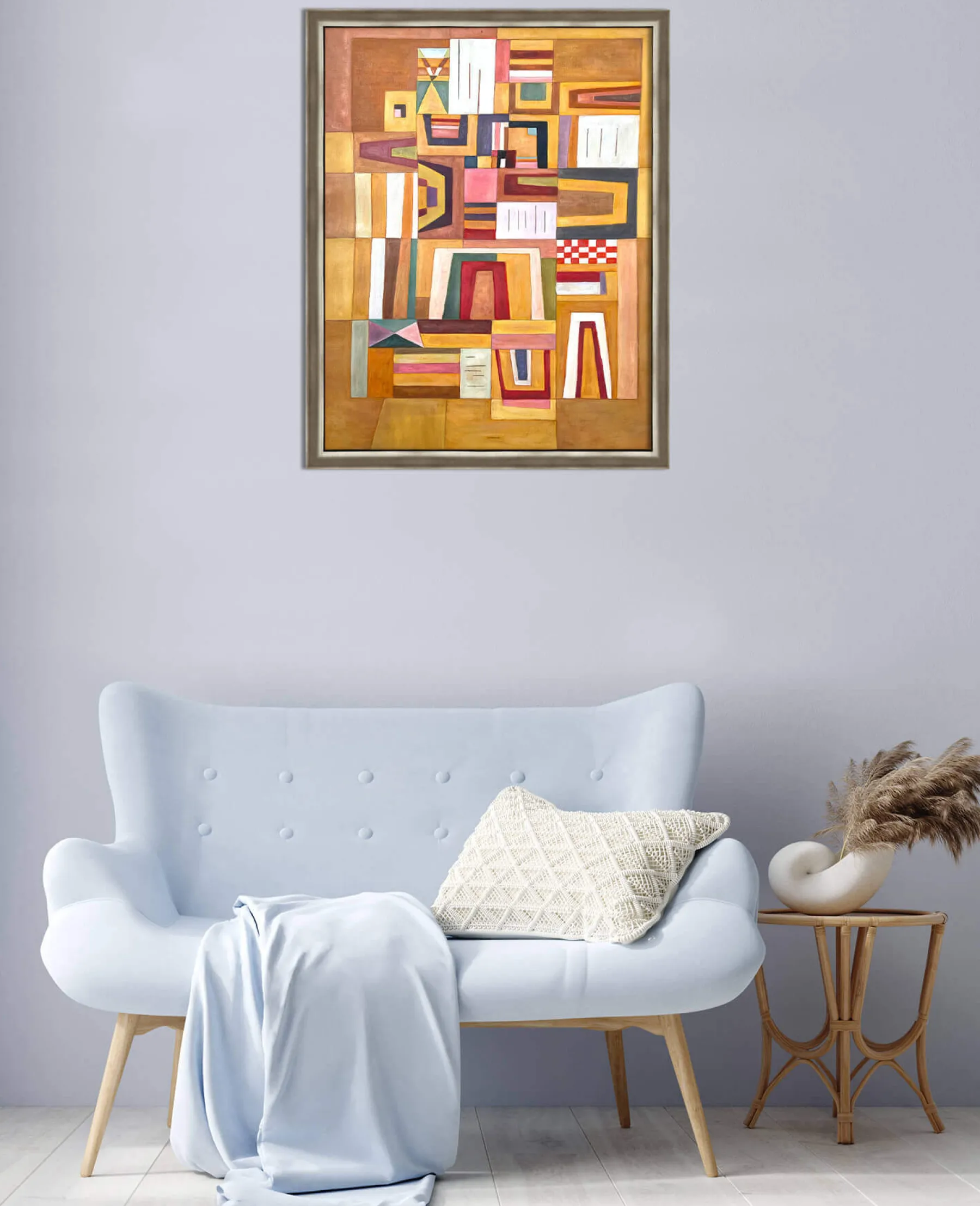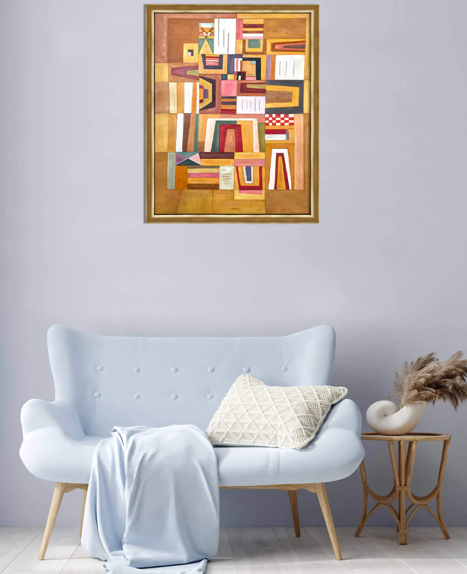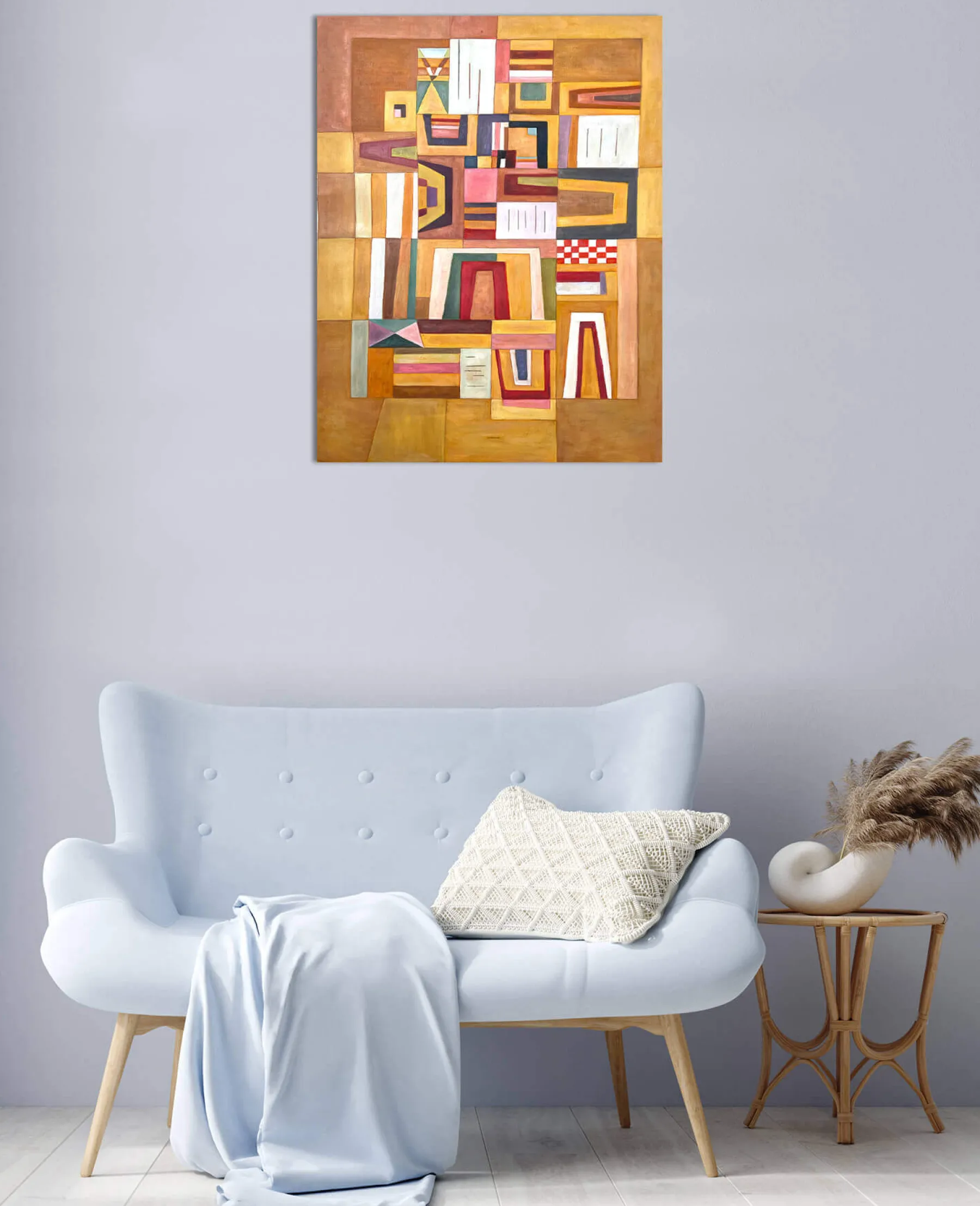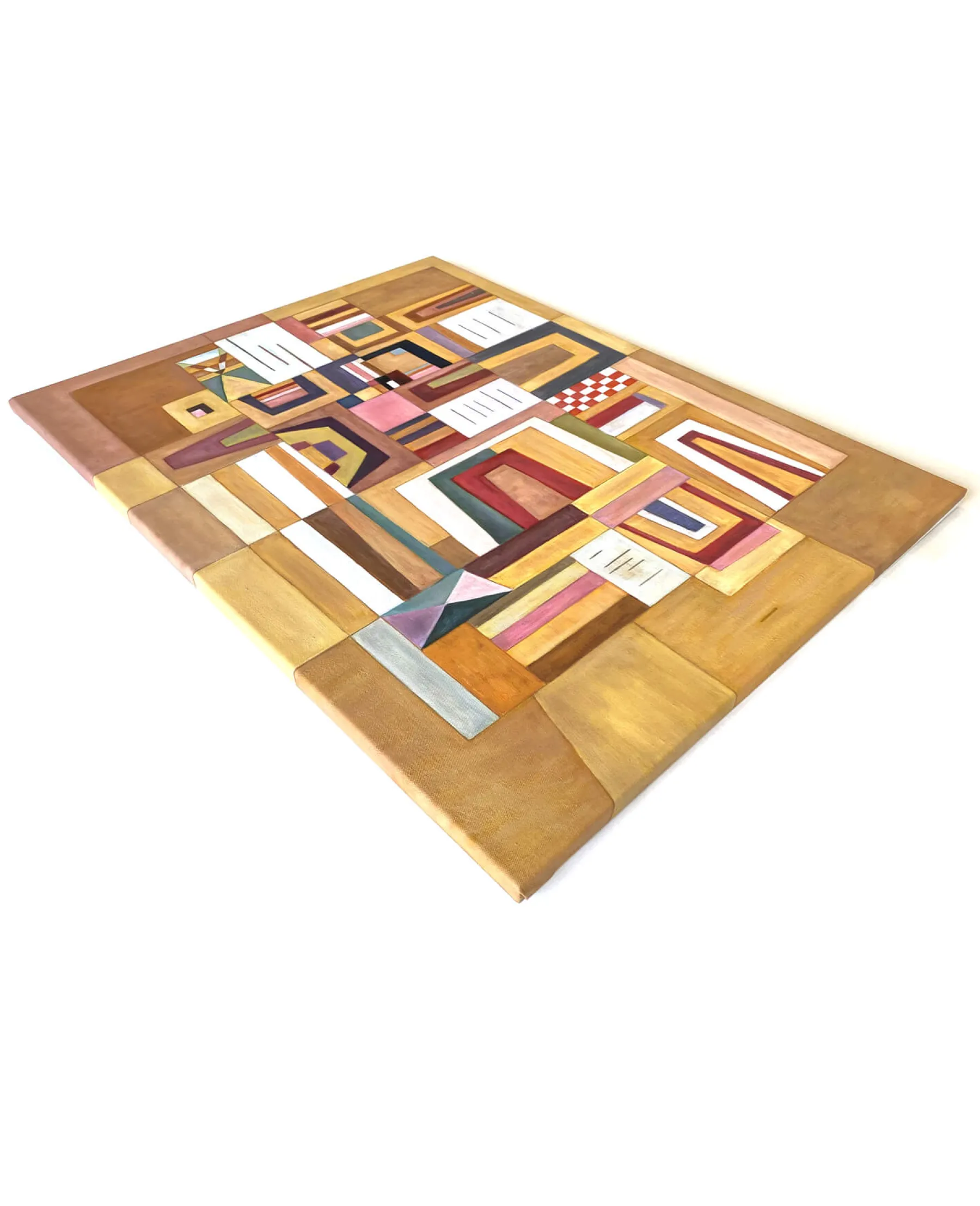 With Ausgleichrosa, Vassily Kandinsky synthesized cubism and the Bauhaus, a German avant-garde movement. In this rectangular abstract painting, geometric shapes are overlaid and then fitted into each other, until they form a playful and colorful puzzle. The right angles meet the trapezoidal shapes, and the thick black lines emphasize the very soft colors.