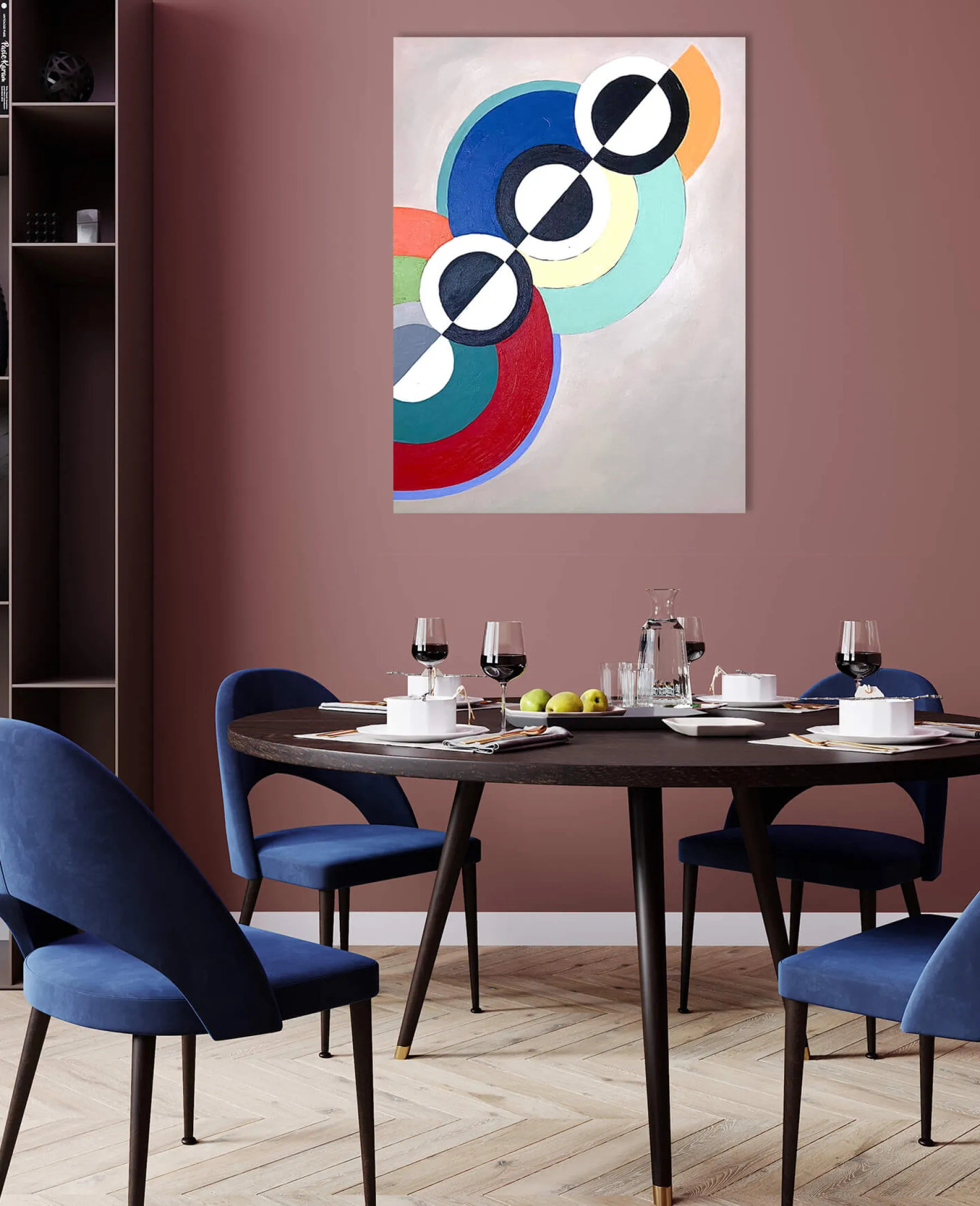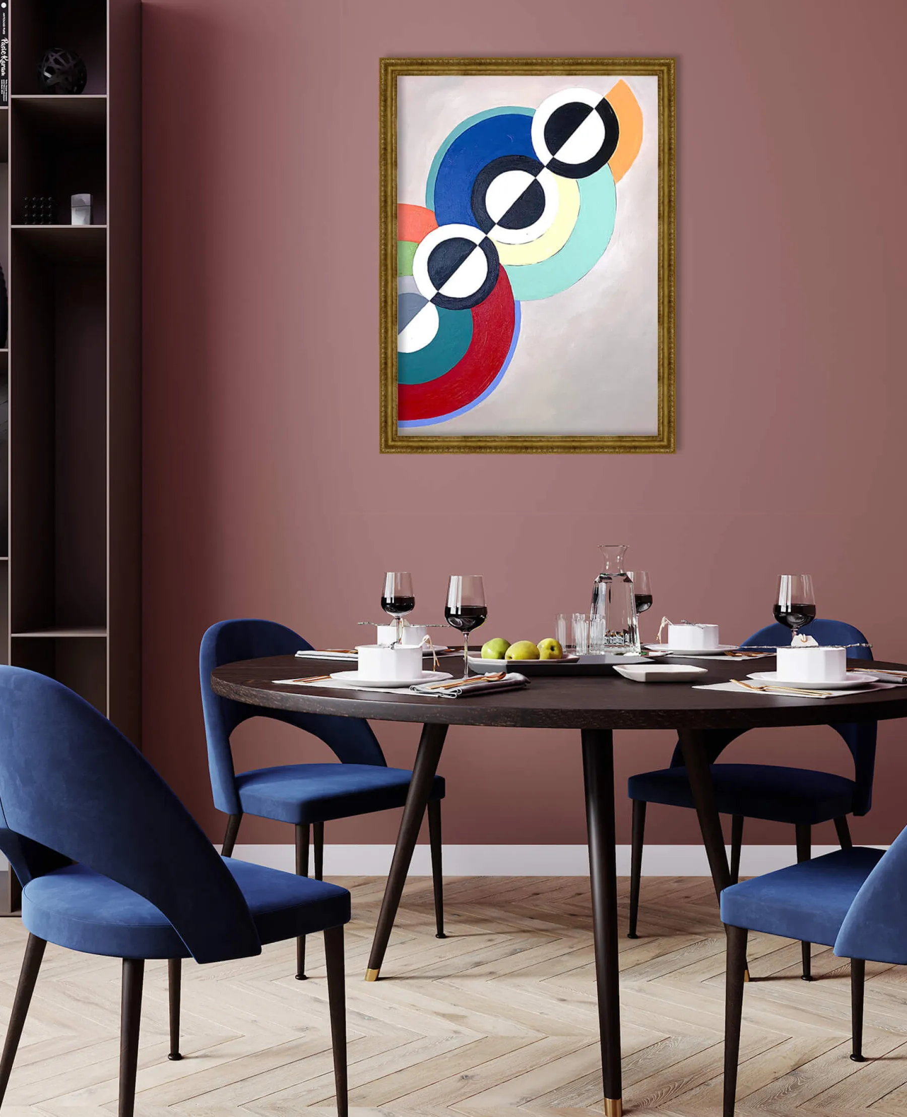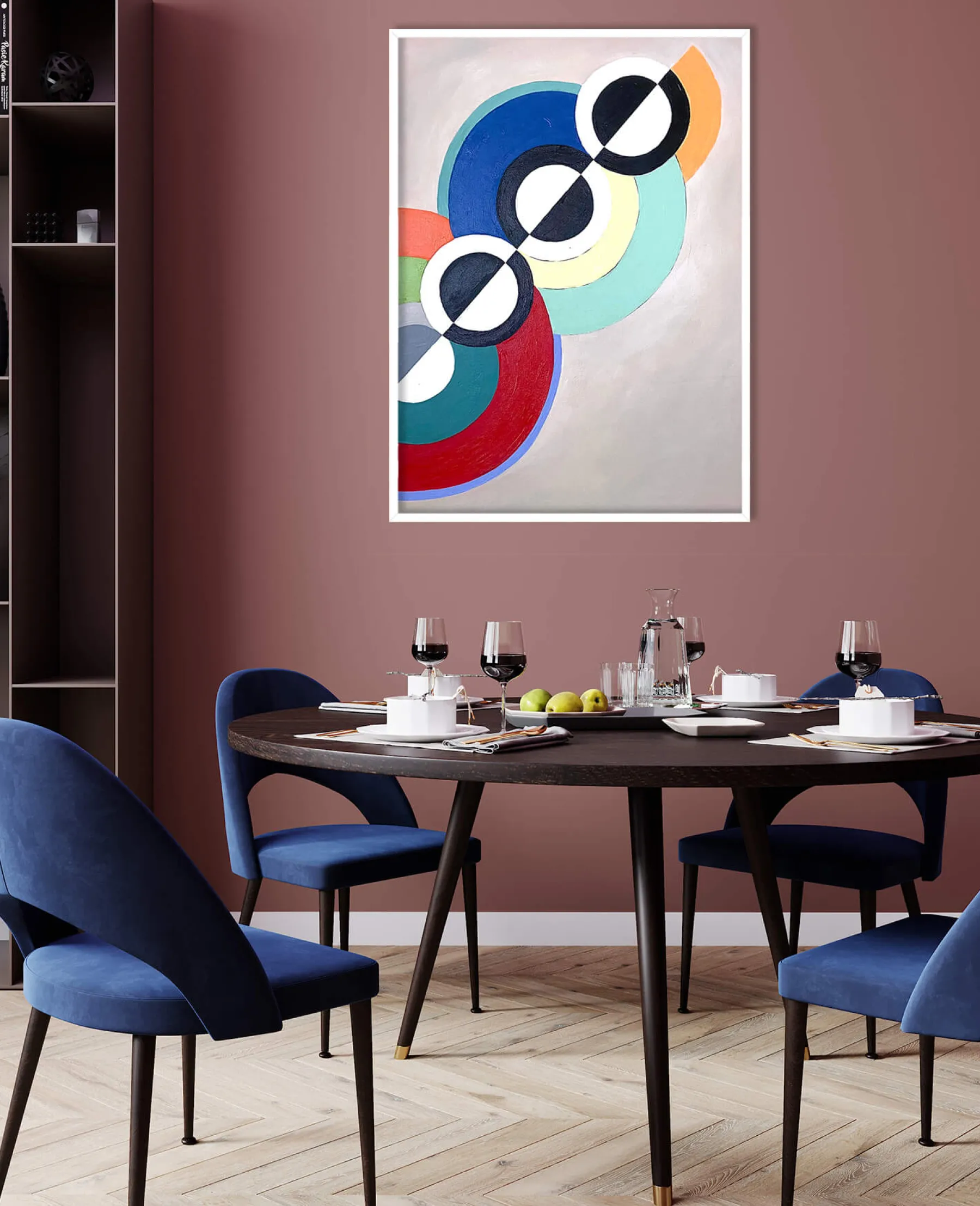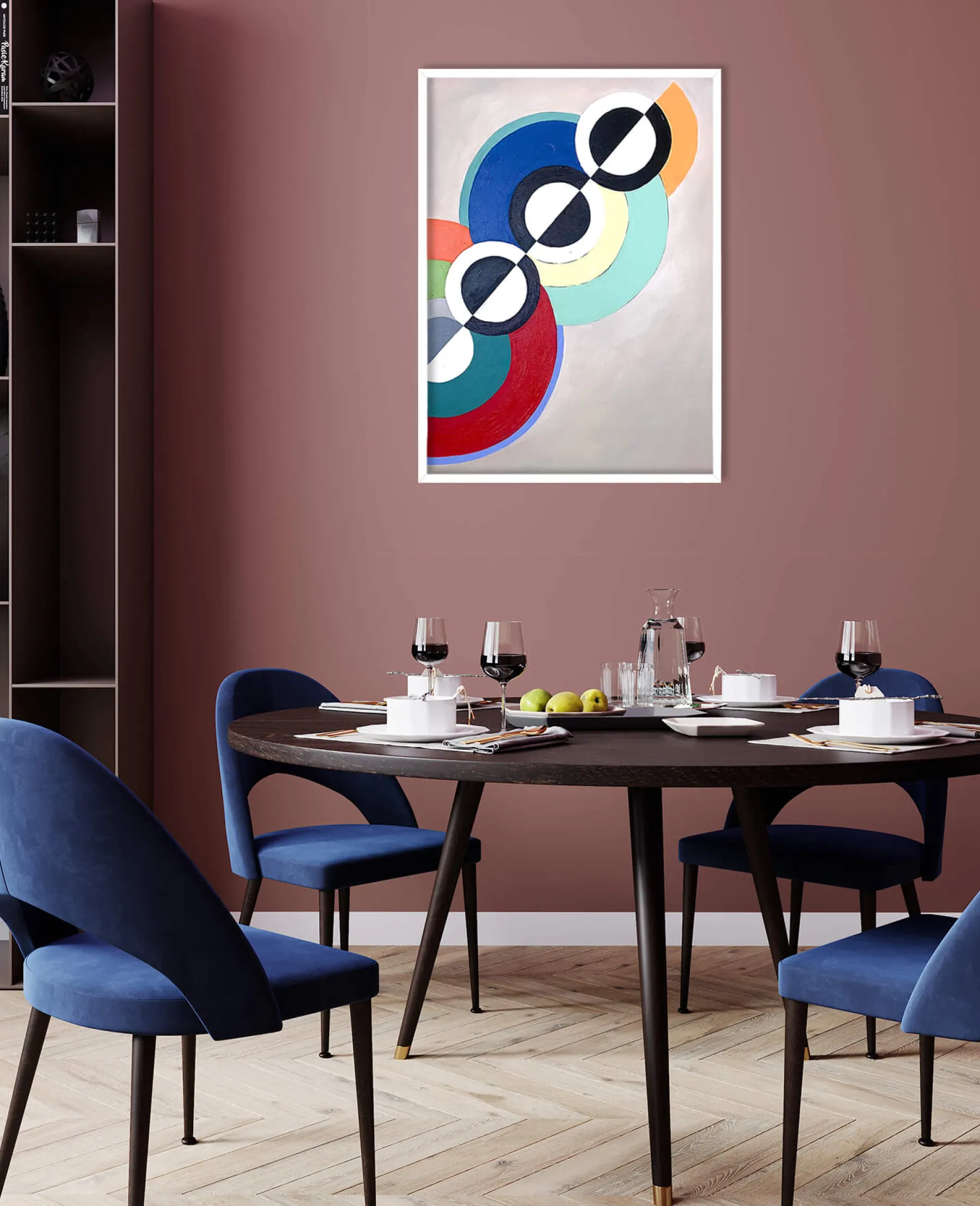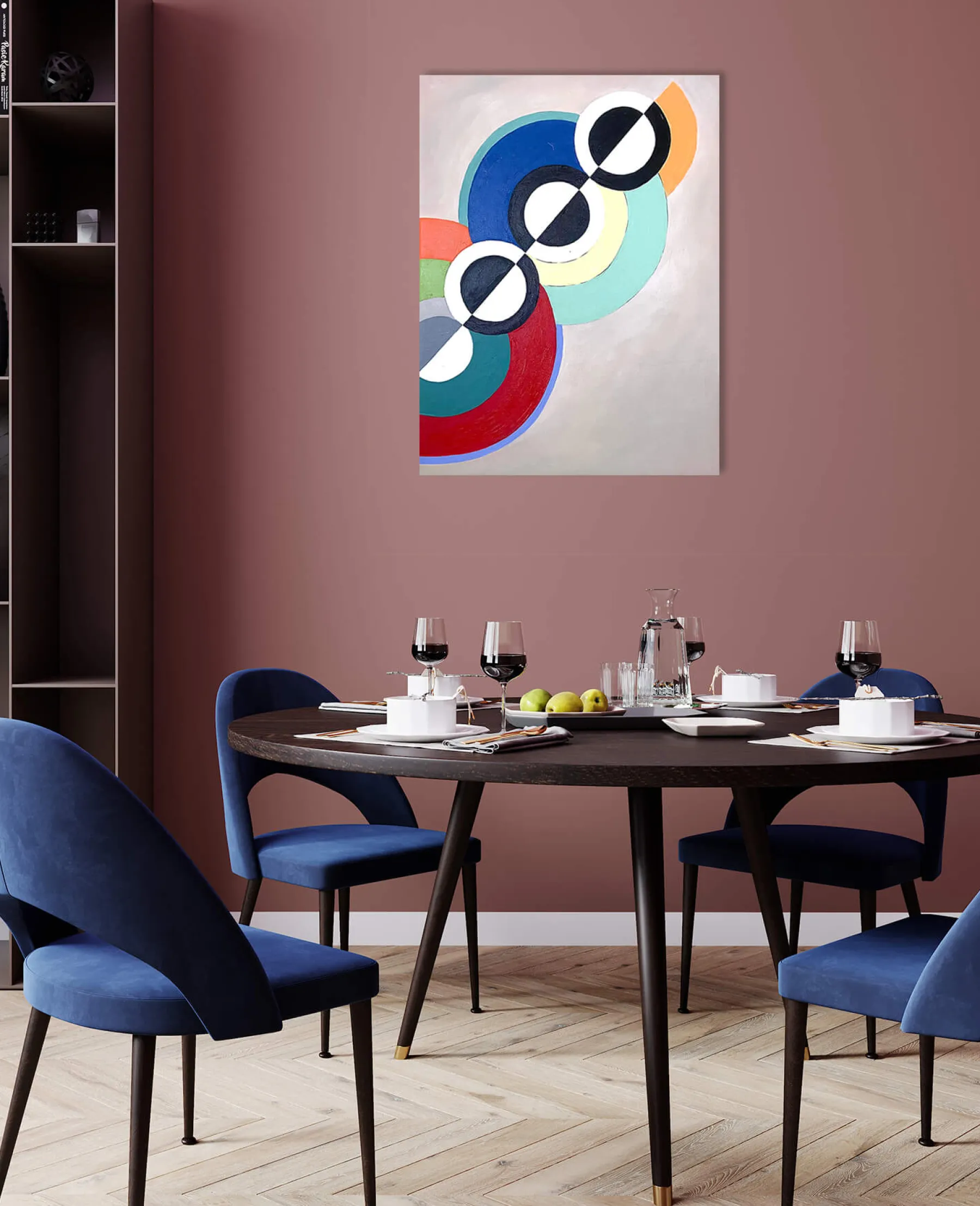 In this work, Robert Delaunay plays with colors and their movements to express rhythm. The repetition of the circular forms and the very nature of the circle refer to the cyclical movement, incessant, to the time that unfolds indefinitely.u0026nbsp;The work is similar to Rythme no1 by the same artist.