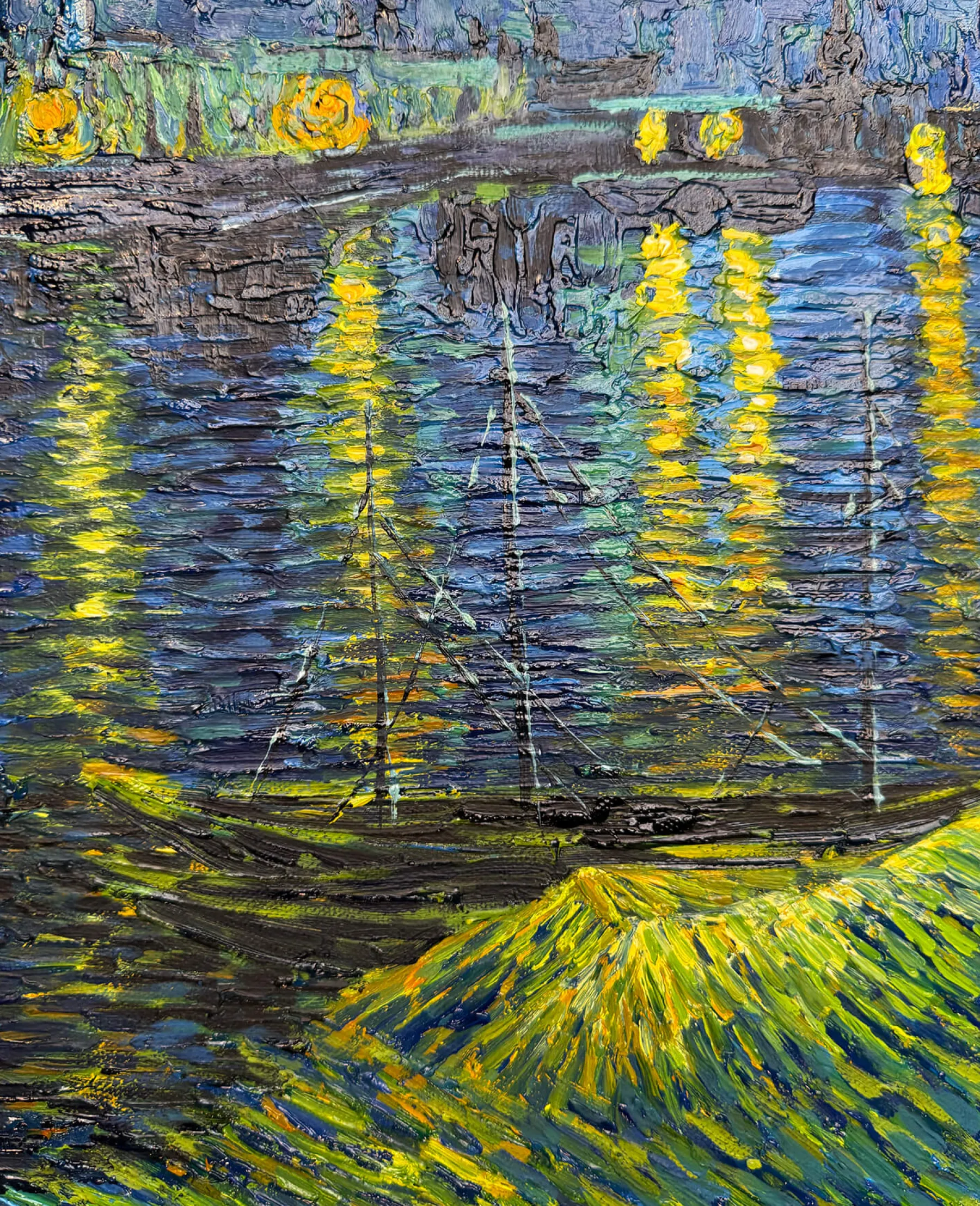 This picture was painted in 1888, on the banks of the Rhône in Arles, not far from the house he shared with his friend Paul Gauguin. It also marks the beginning of his period of expression. “Often it seems to me that the night is even more richly coloured than the day. As Vincent Van Gogh wrote in a letter to his sister, he was a lover of the effects of light at night. One feels fascinated, even bewitched, by so much light. In reality, Van Gogh painted by sublimating the light, the colours he saw and interpreted. The style and colours are similar to those used in The Starry Night.