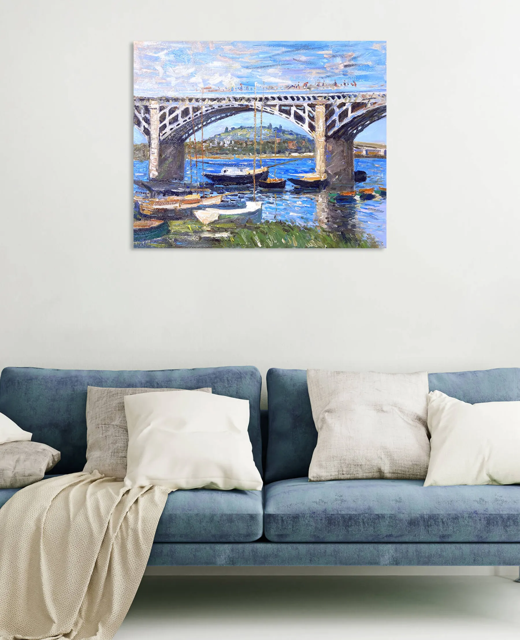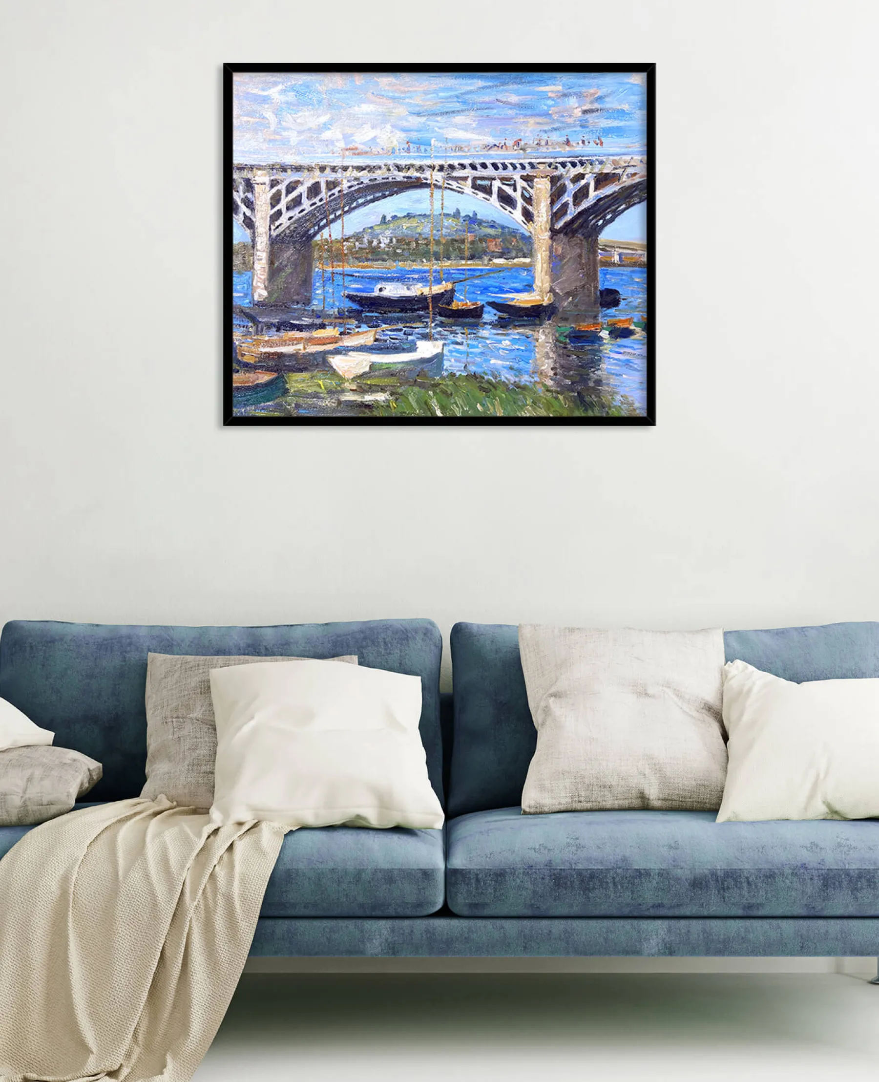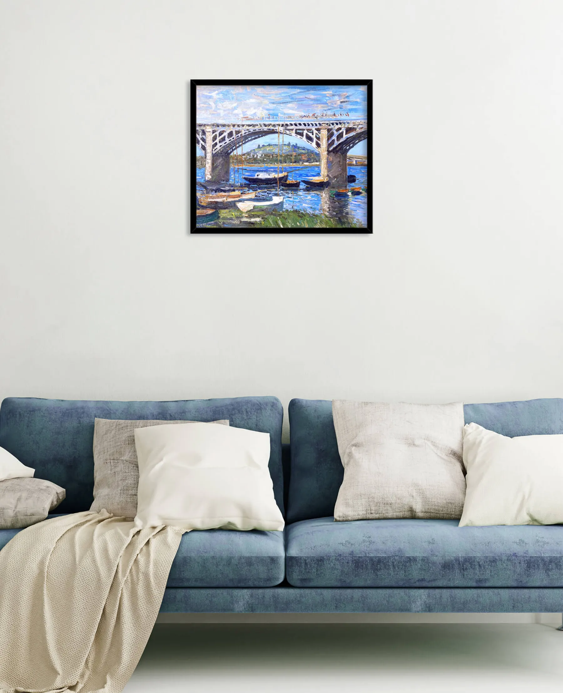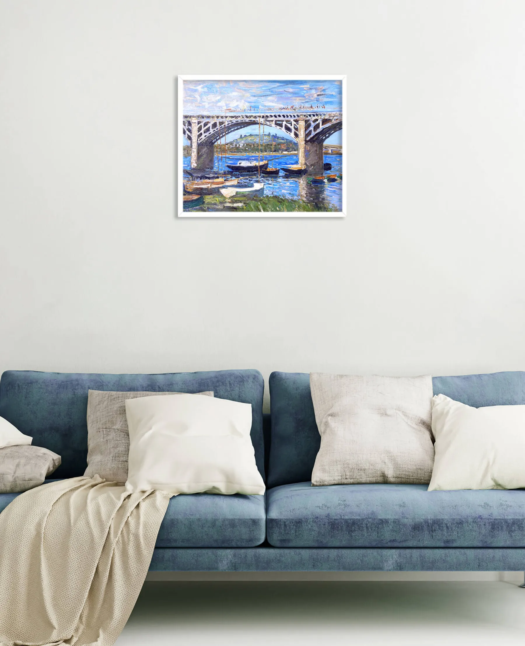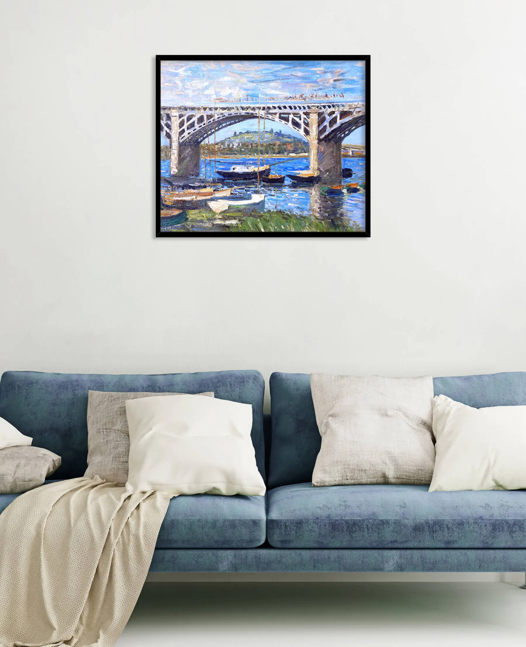 The Argenteuil bridge was represented seven times by Claude Monet. This shows how attached the artist was to this motif. In this work, the foreground is occupied by sailboats at the mooring and the effects of light on the masts allow for complementary plays of color, which the Impressionists appreciated so much at the time.