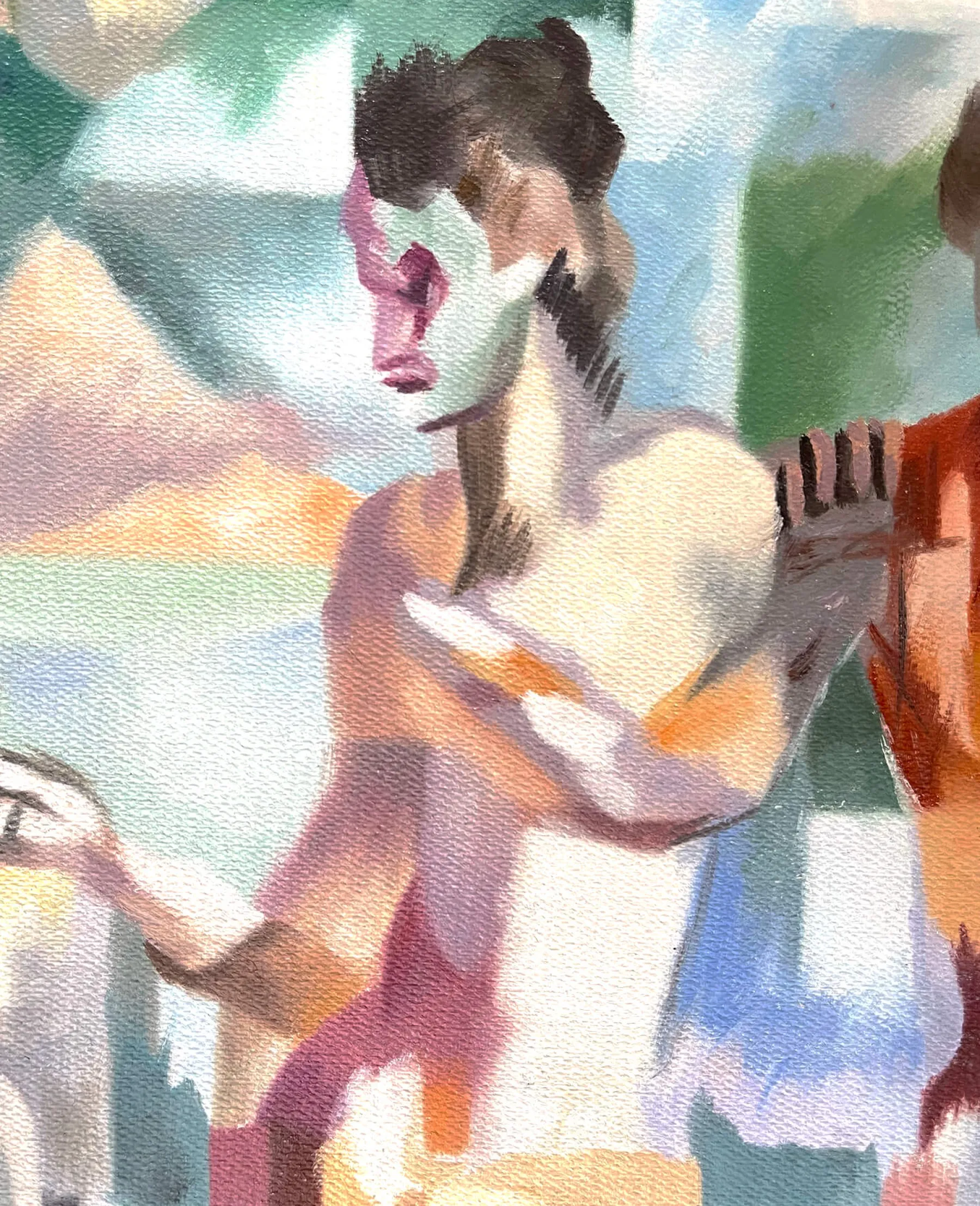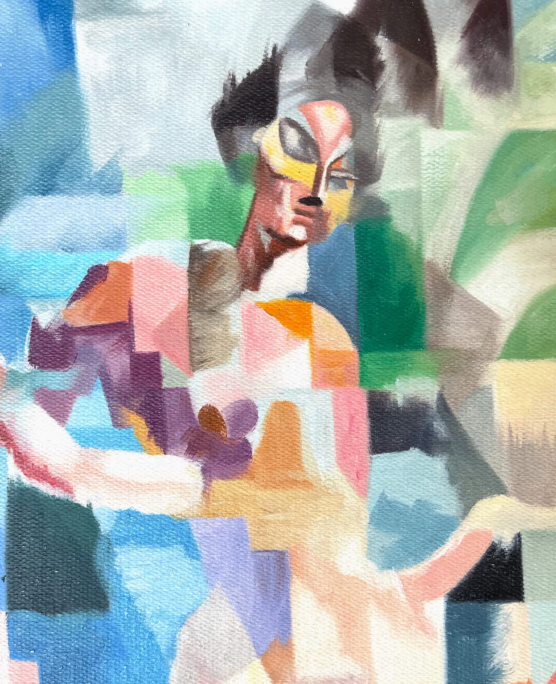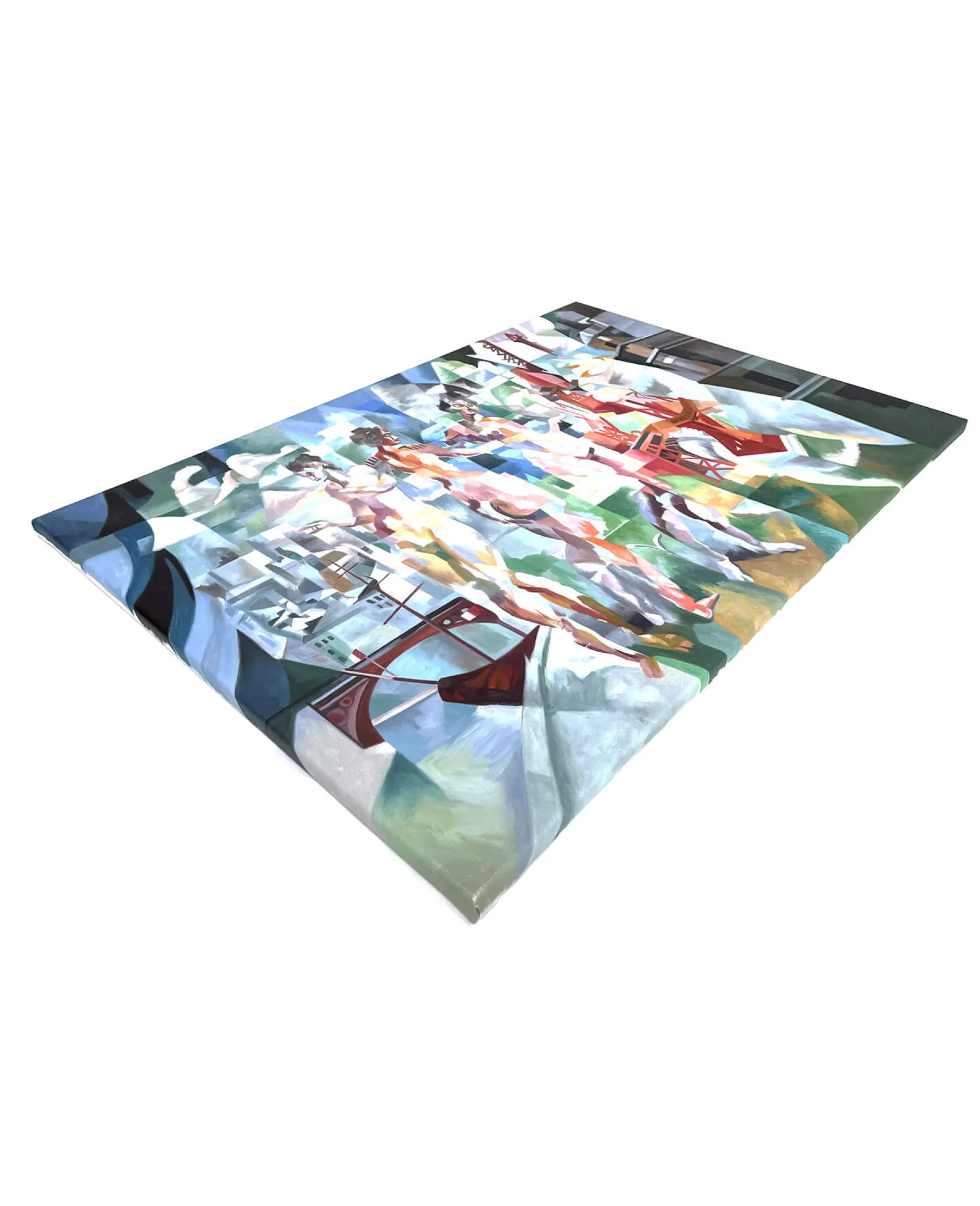 The work displays, by its monumental format (267x406cm) and its iconographic wealth, the ambitions of Robert Delaunay. The composition is read from left to right, like a collage. On the left, the harbor landscape evokes the memory of a self-portrait by Henri Rousseau, entitled “Moi-même” (“Myself”). And on the right, the red Eiffel Tower is a self-quotation by the artist, referring to his other works on the theme. The different parts of the composition are unified by the surface effect of the shimmering planes, which make the shapes disappear into the colour.