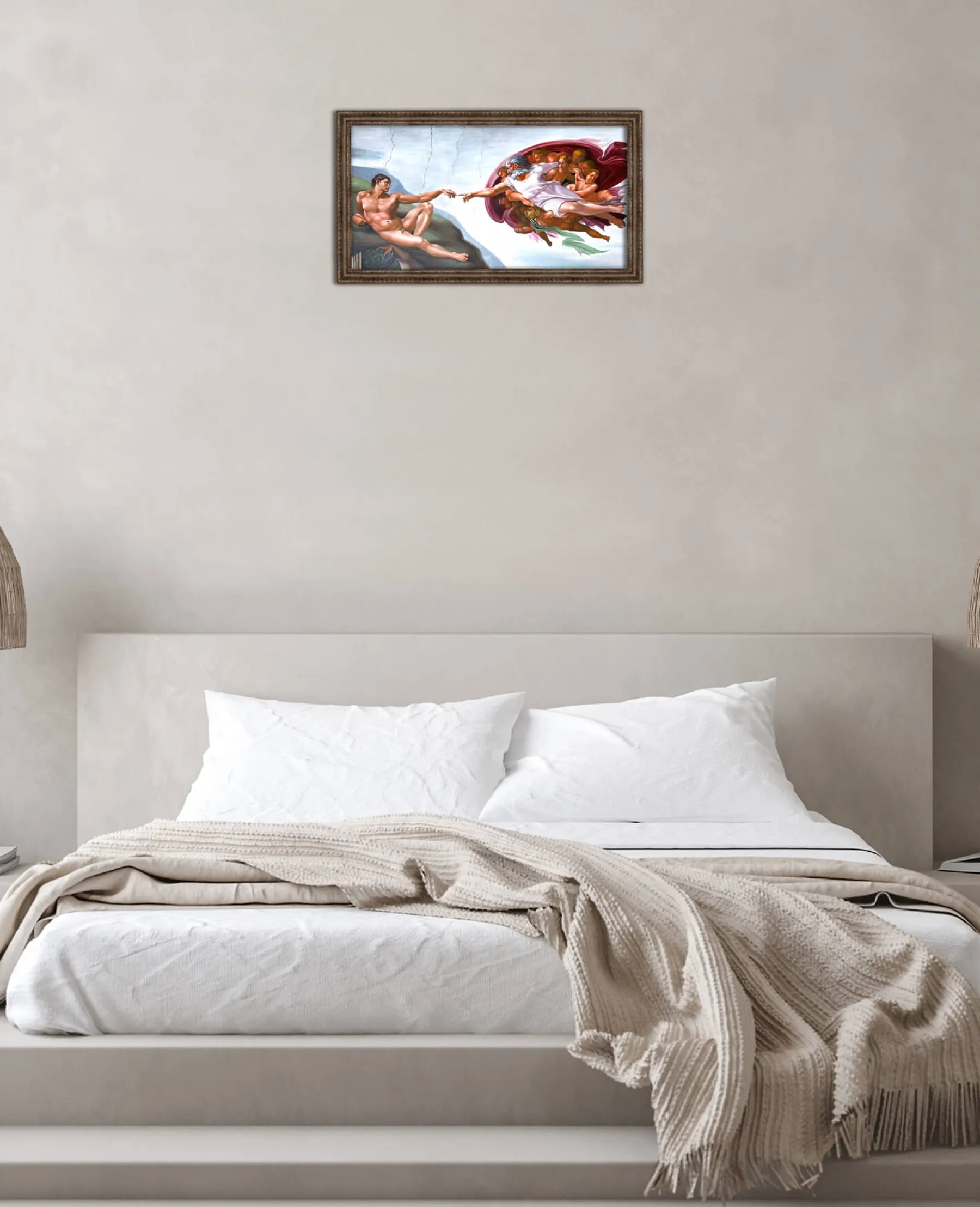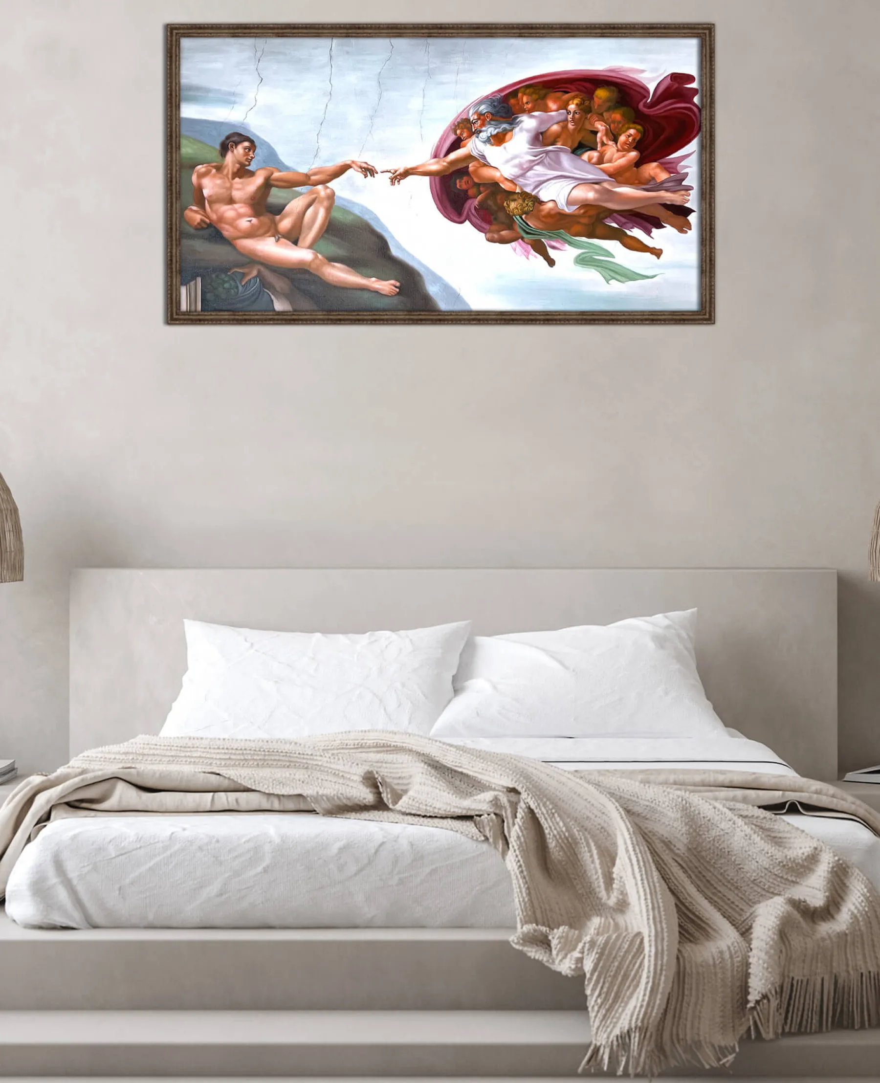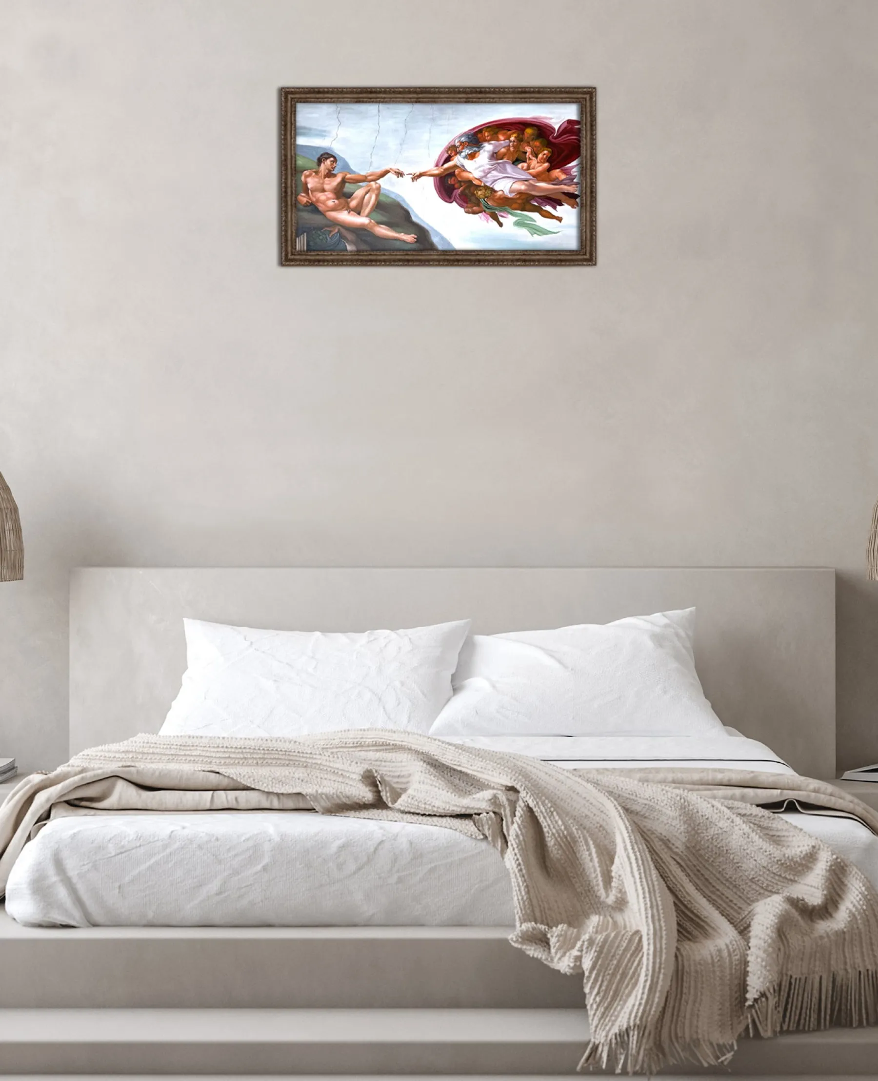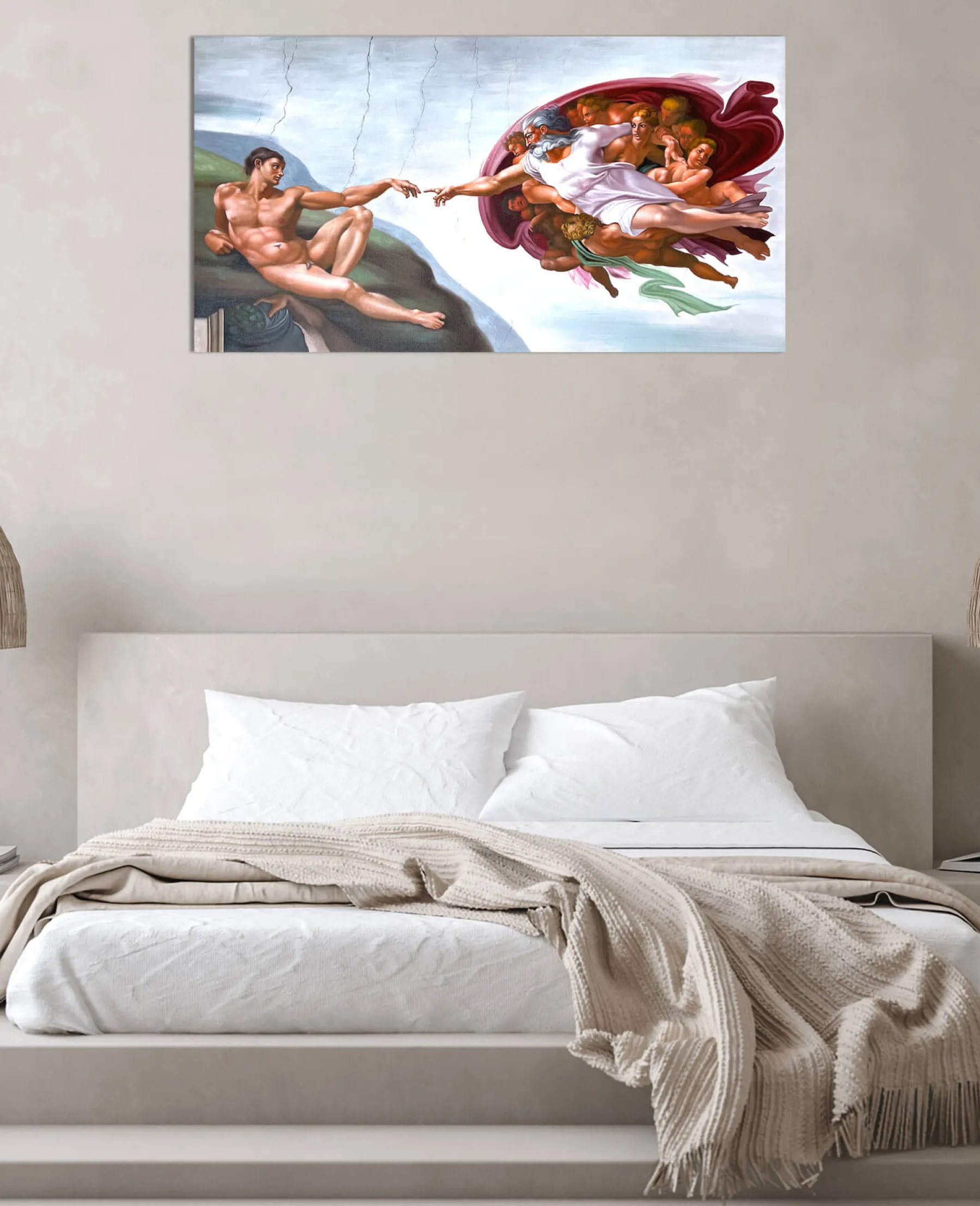 This work by Michelangelo is one of nine frescoes inspired by the book of Genesis on the central part of the ceiling of the Sistine Chapel in Vatican City. God is depicted as an old bearded man wrapped in a large red cloak that he shares with cherubs. His right arm reaches out to man to give the spark of life. Adam’s body is at rest, his left hand is relaxed, his index finger bent: God gives, Adam receives. This relative symmetry reminds us that man is created in the image of God.u0026nbsp;The detail of this work is clearly visible in The Creation of Adam, detail.