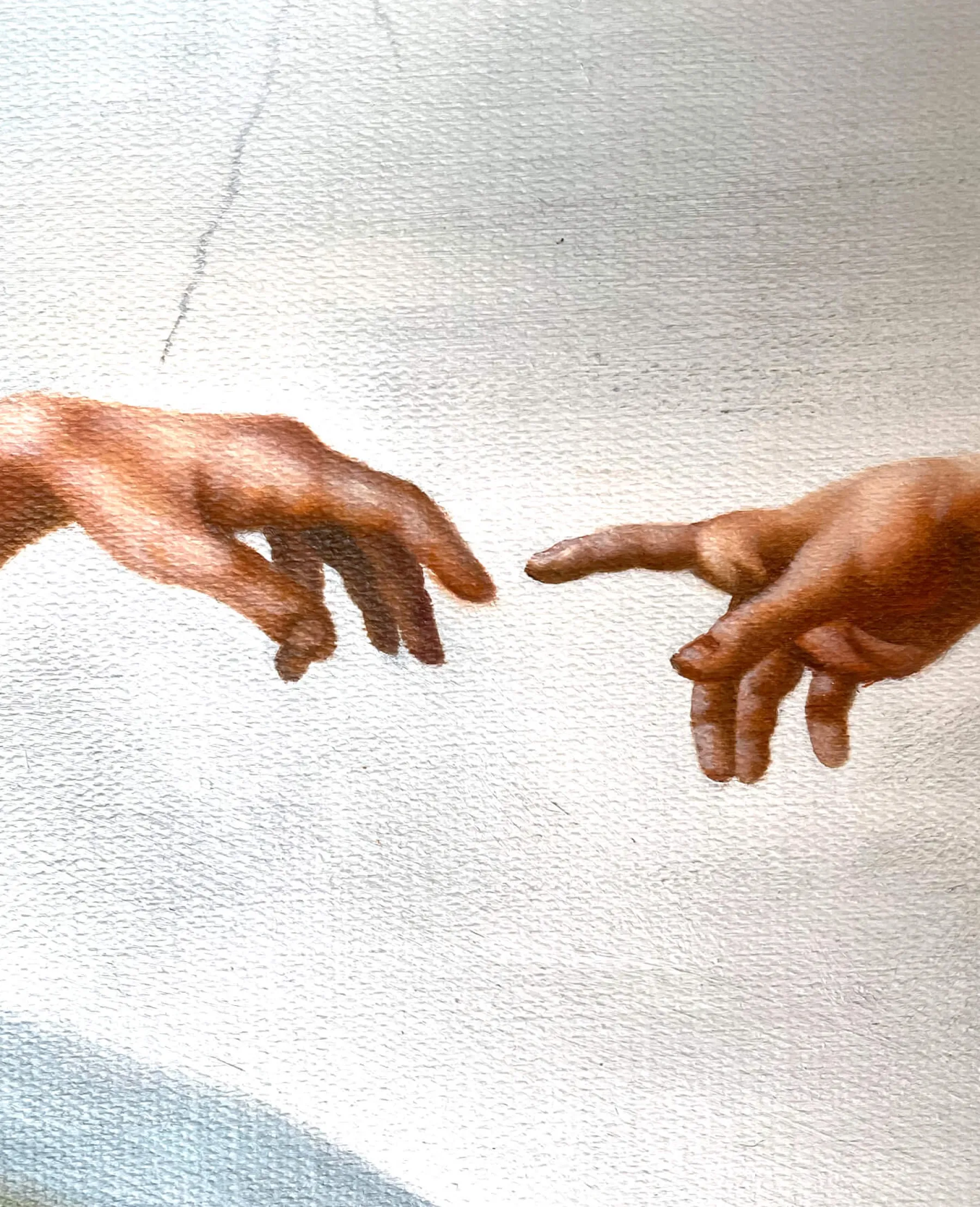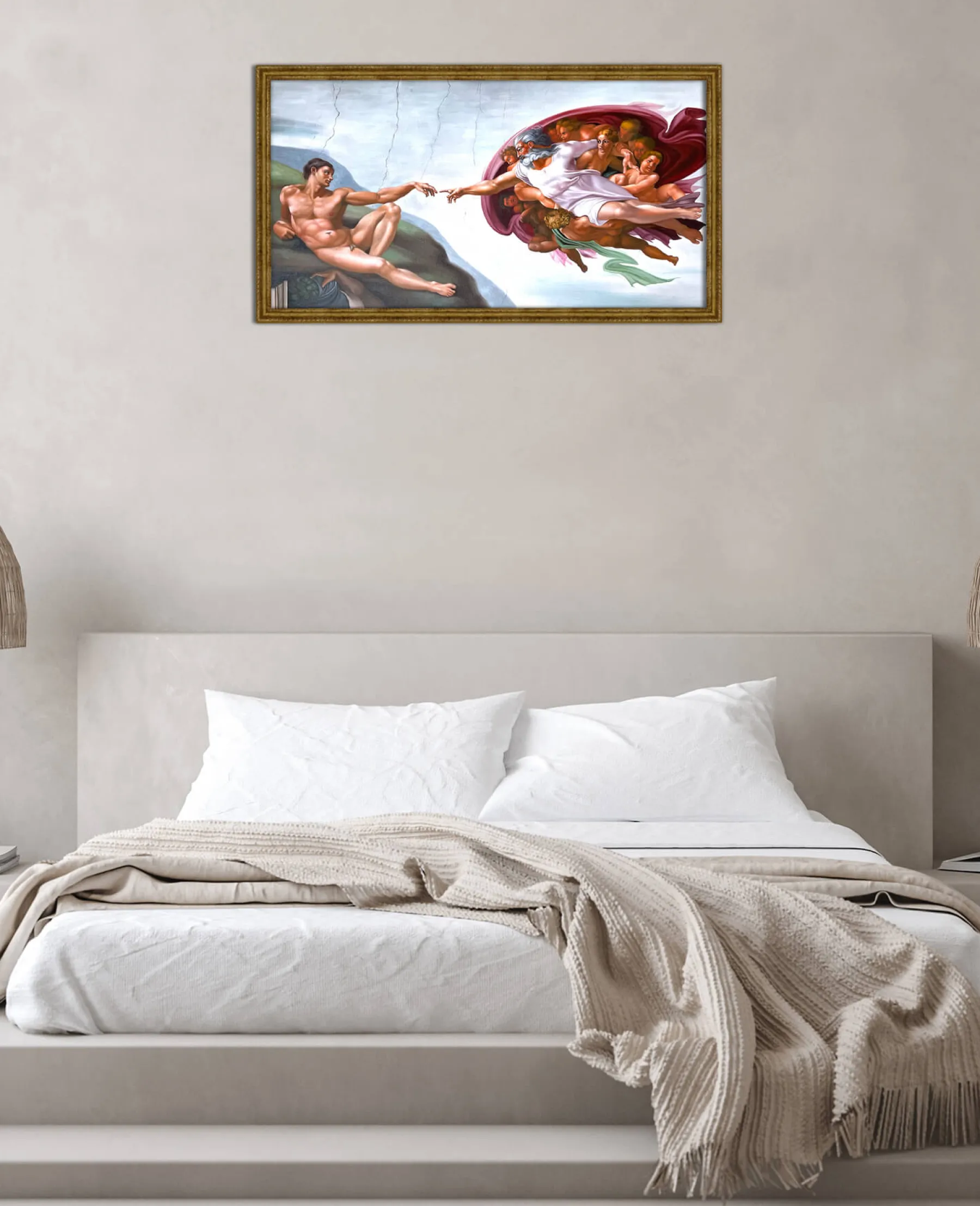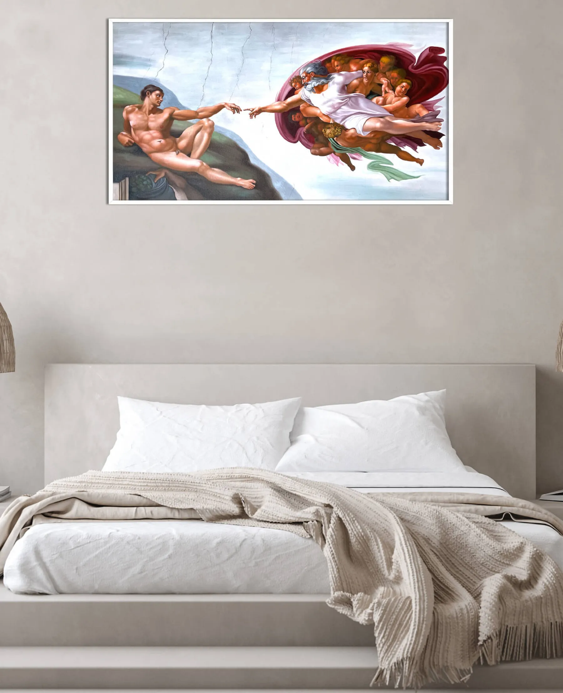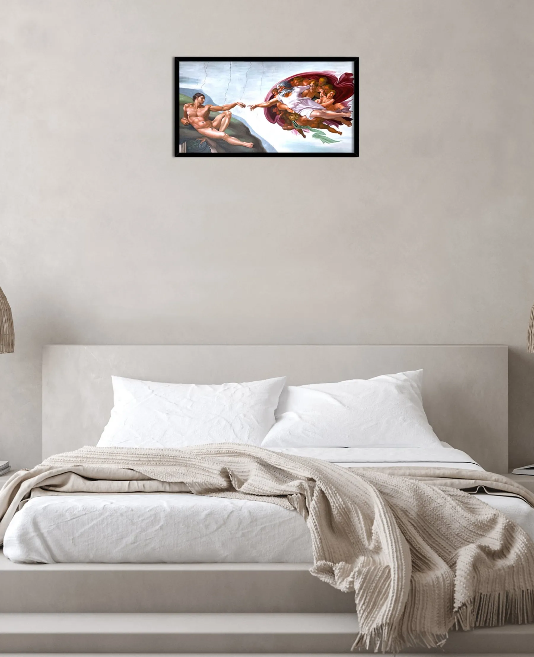 This work by Michelangelo is one of nine frescoes inspired by the book of Genesis on the central part of the ceiling of the Sistine Chapel in Vatican City. God is depicted as an old bearded man wrapped in a large red cloak that he shares with cherubs. His right arm reaches out to man to give the spark of life. Adam’s body is at rest, his left hand is relaxed, his index finger bent: God gives, Adam receives. This relative symmetry reminds us that man is created in the image of God.u0026nbsp;The detail of this work is clearly visible in The Creation of Adam, detail.