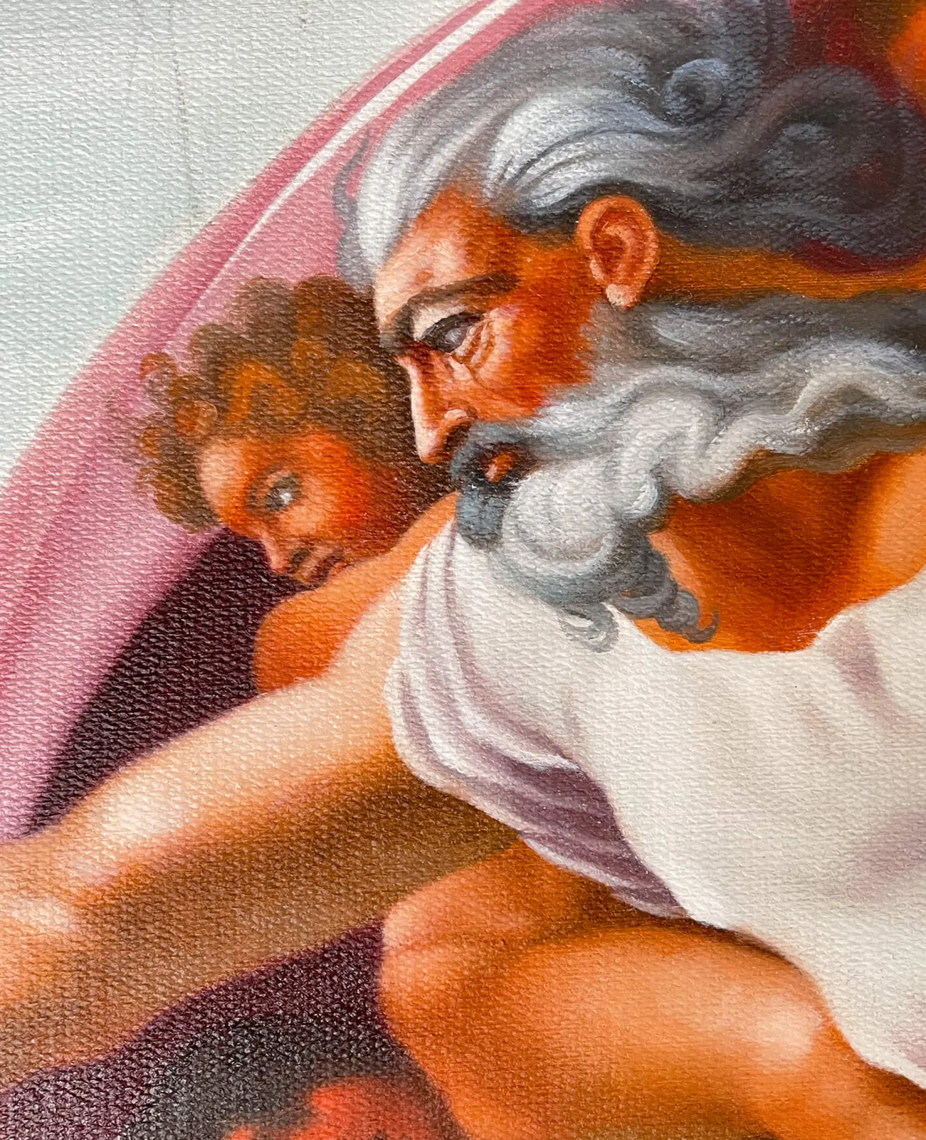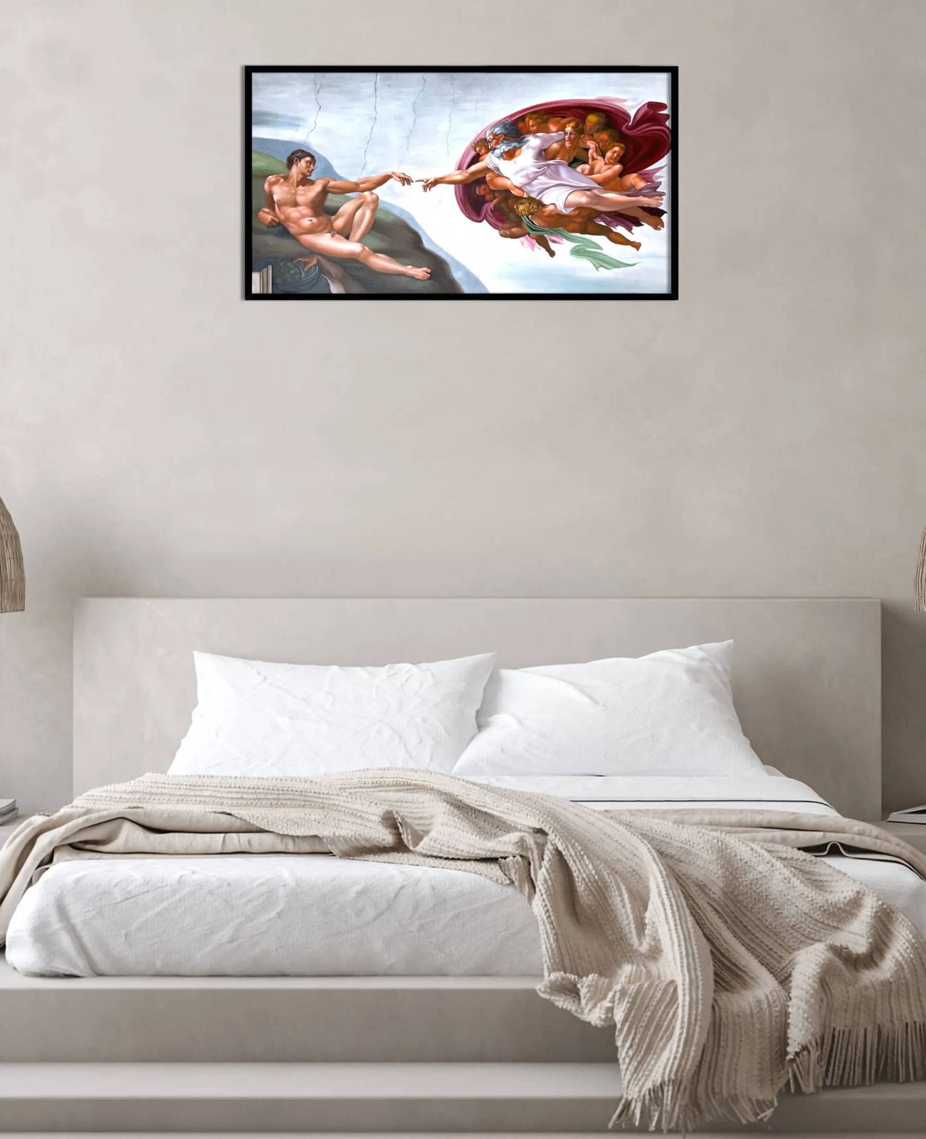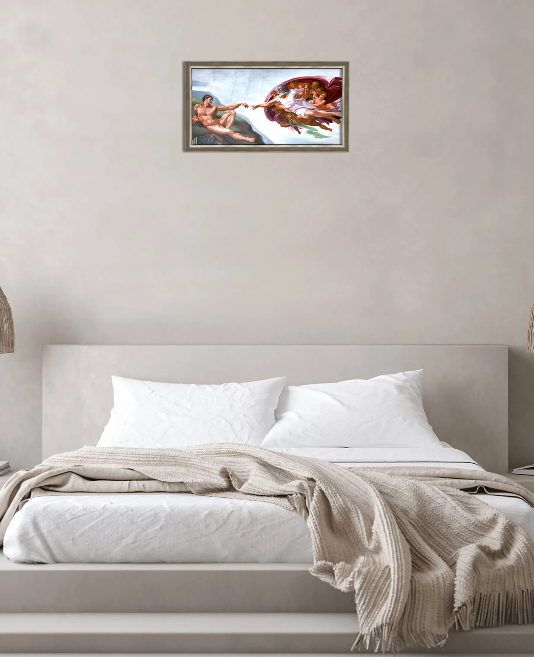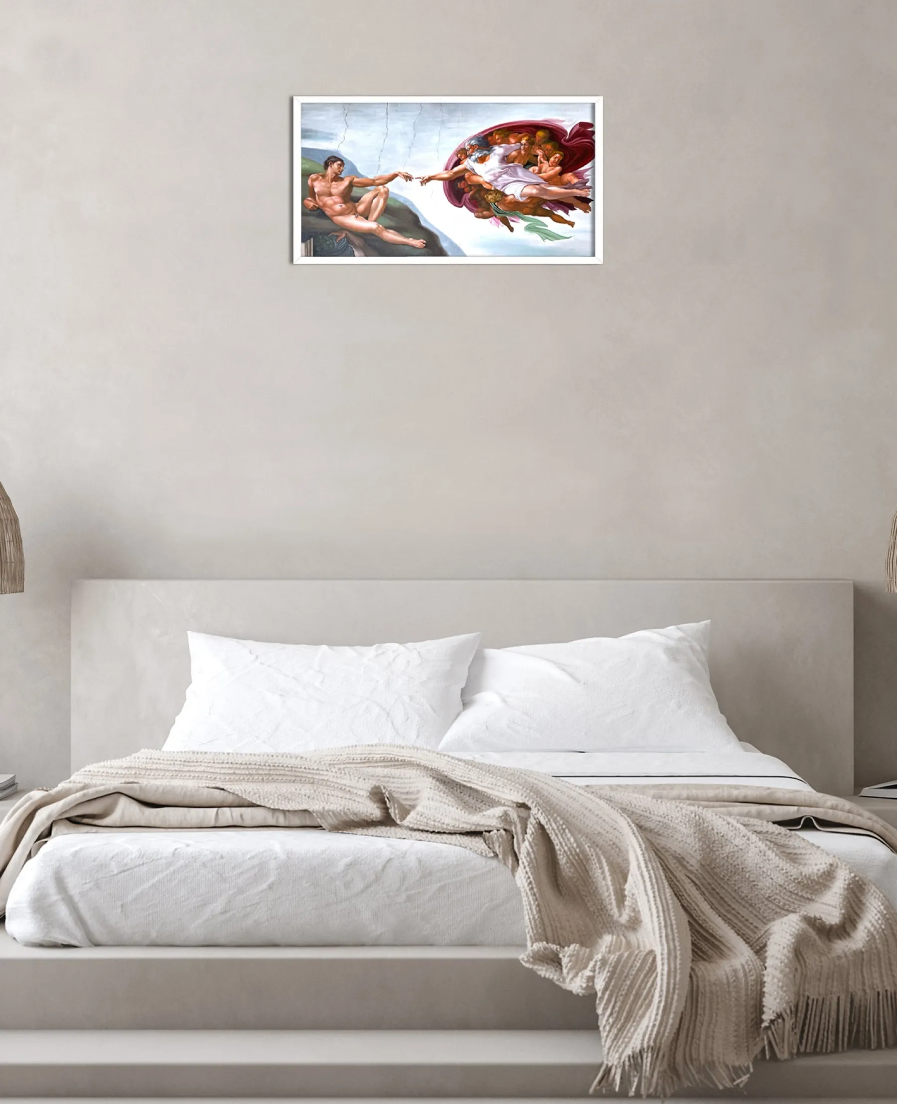 This work by Michelangelo is one of nine frescoes inspired by the book of Genesis on the central part of the ceiling of the Sistine Chapel in Vatican City. God is depicted as an old bearded man wrapped in a large red cloak that he shares with cherubs. His right arm reaches out to man to give the spark of life. Adam’s body is at rest, his left hand is relaxed, his index finger bent: God gives, Adam receives. This relative symmetry reminds us that man is created in the image of God.u0026nbsp;The detail of this work is clearly visible in The Creation of Adam, detail.