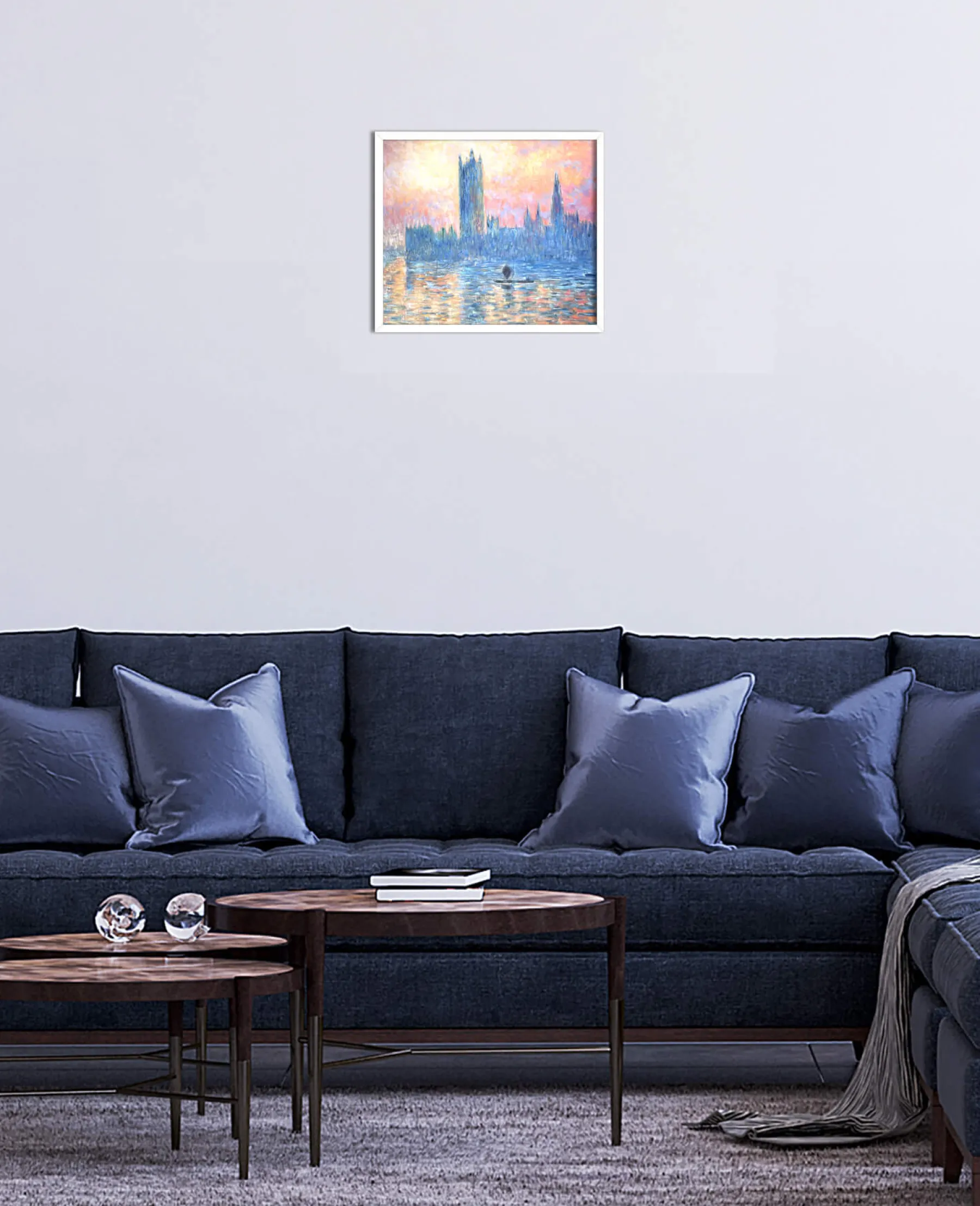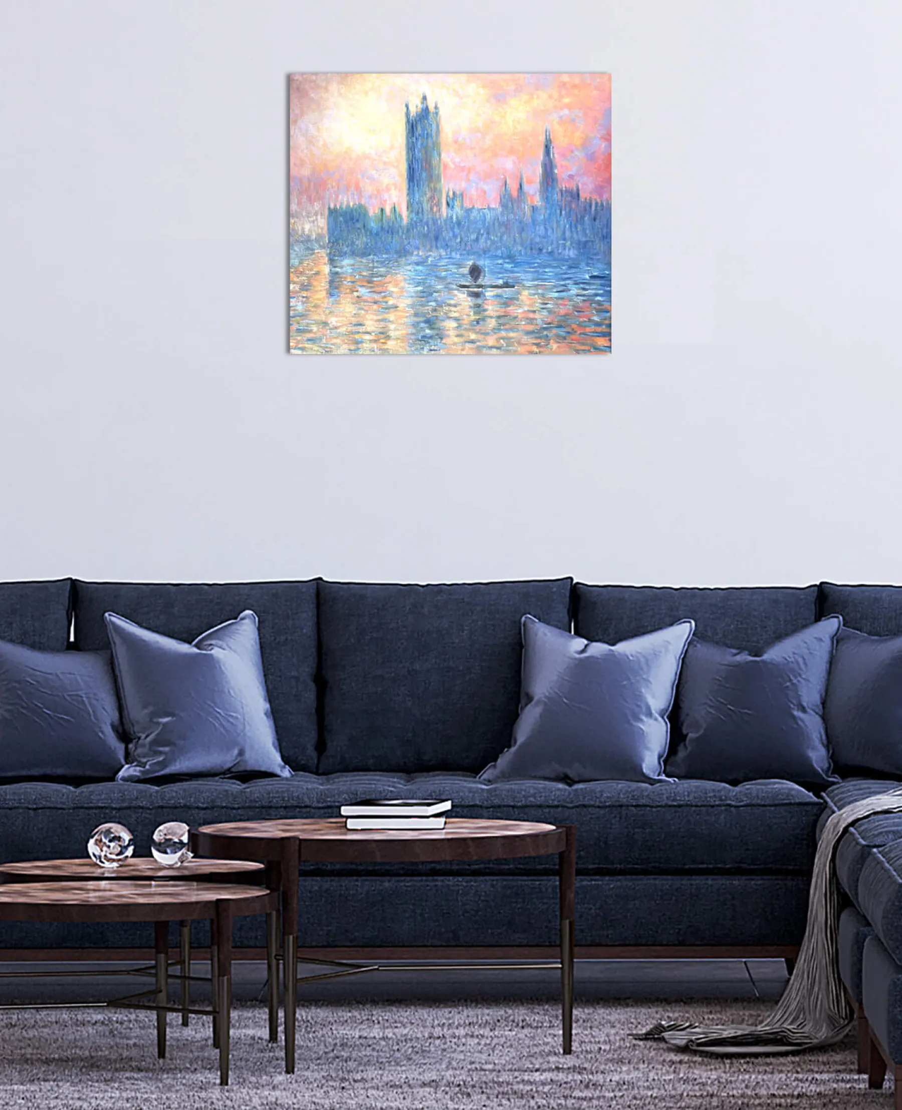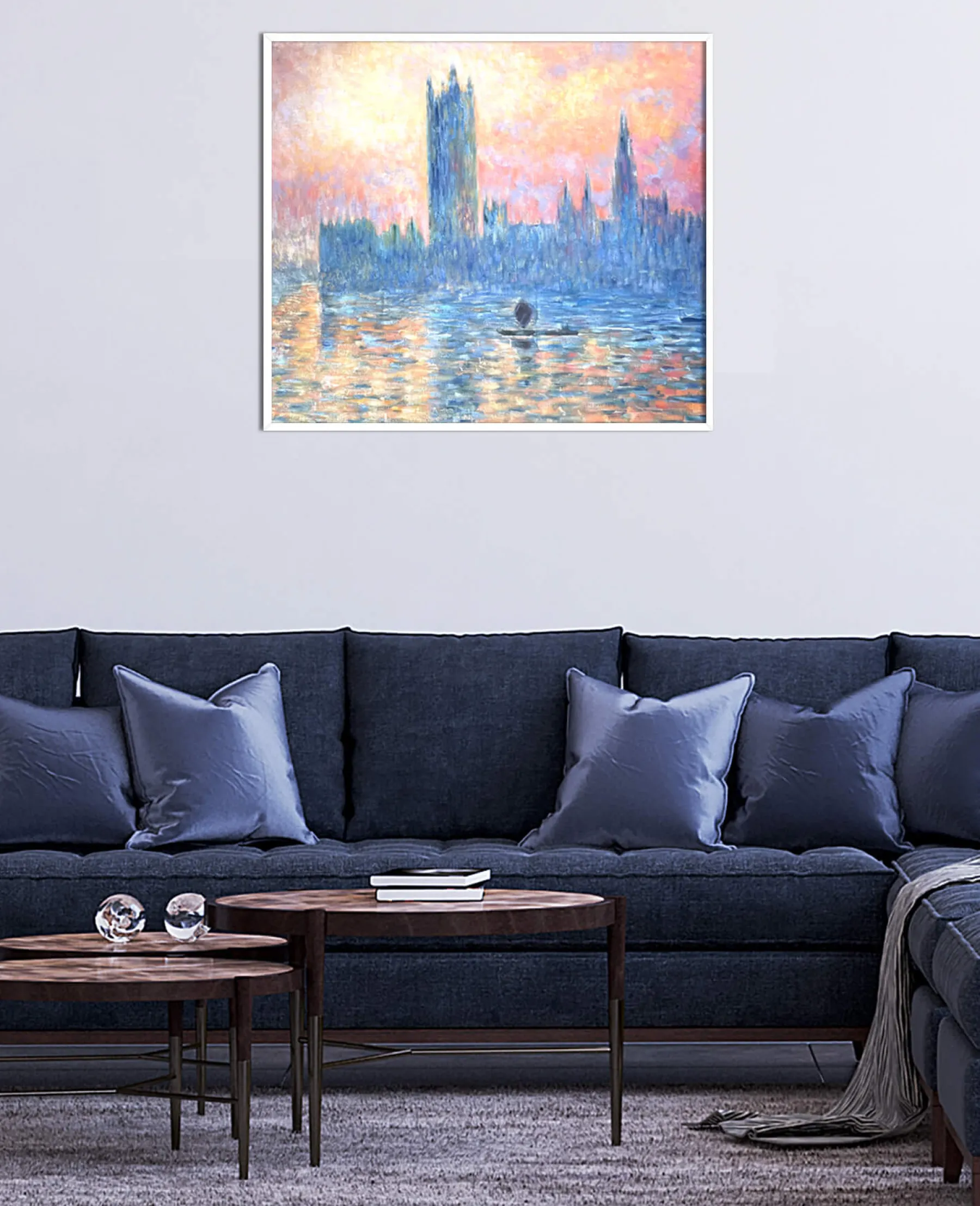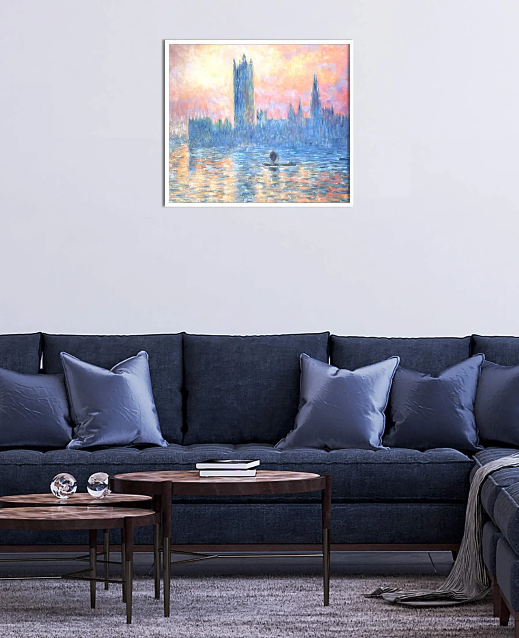 The London Parliaments series is a set of paintings by the impressionist painter Claude Monet between 1900 and 1904. It was mainly observed by the painter from a terrace of St. Thomas Hospital located on the opposite bank of the river, near Westminster Bridge. An unreal and ghostly silhouette, the Parliament appears like an apparition. The stone architecture seems to have lost all consistency. Sky and water are painted with the same tones, dominated by mauve and orange. The brushstroke is systematically fragmented into multiple colored spots, to render the density of the atmosphere and the mist.u0026nbsp;The painting reminds us of his most famous work, Impression, Sunrise.