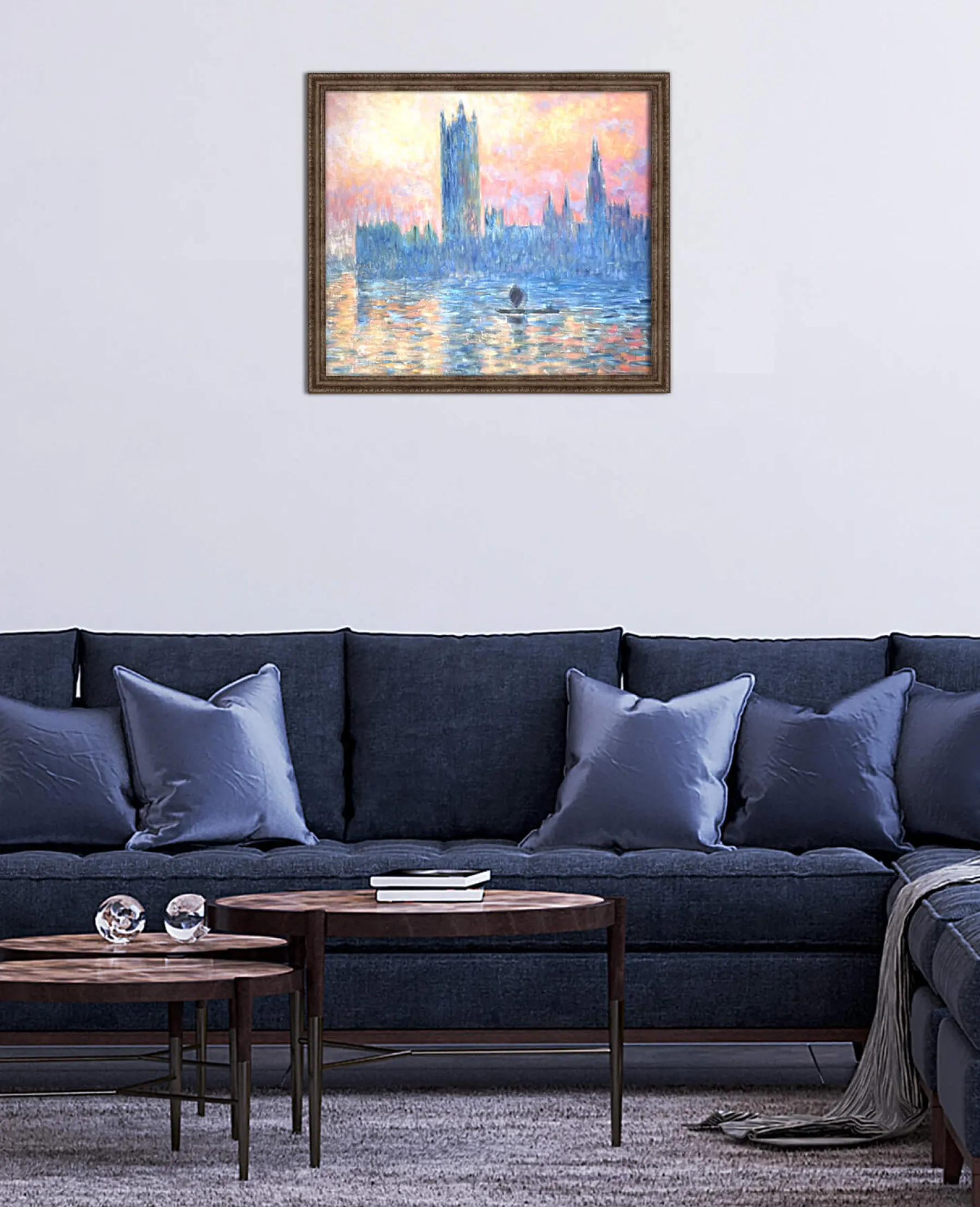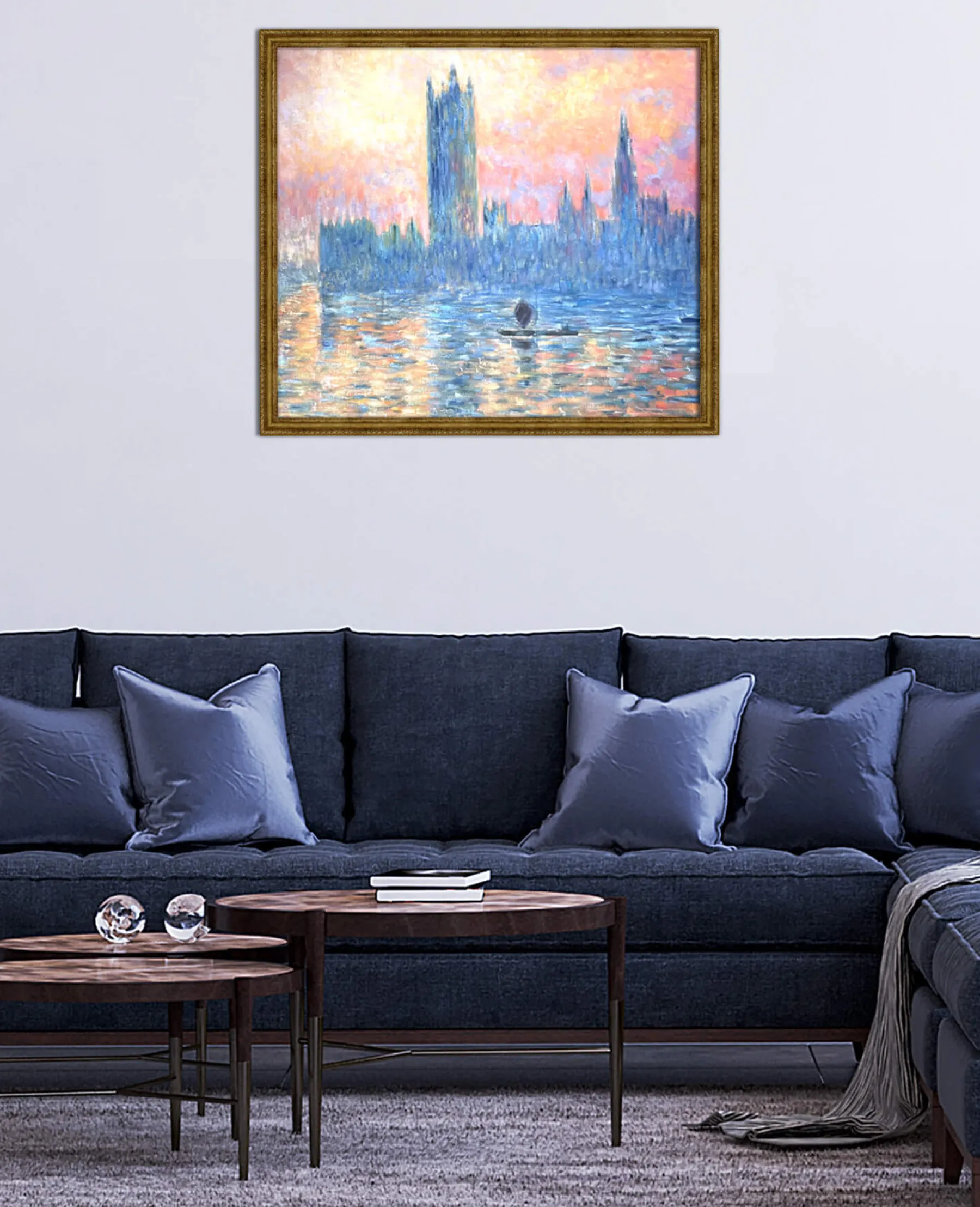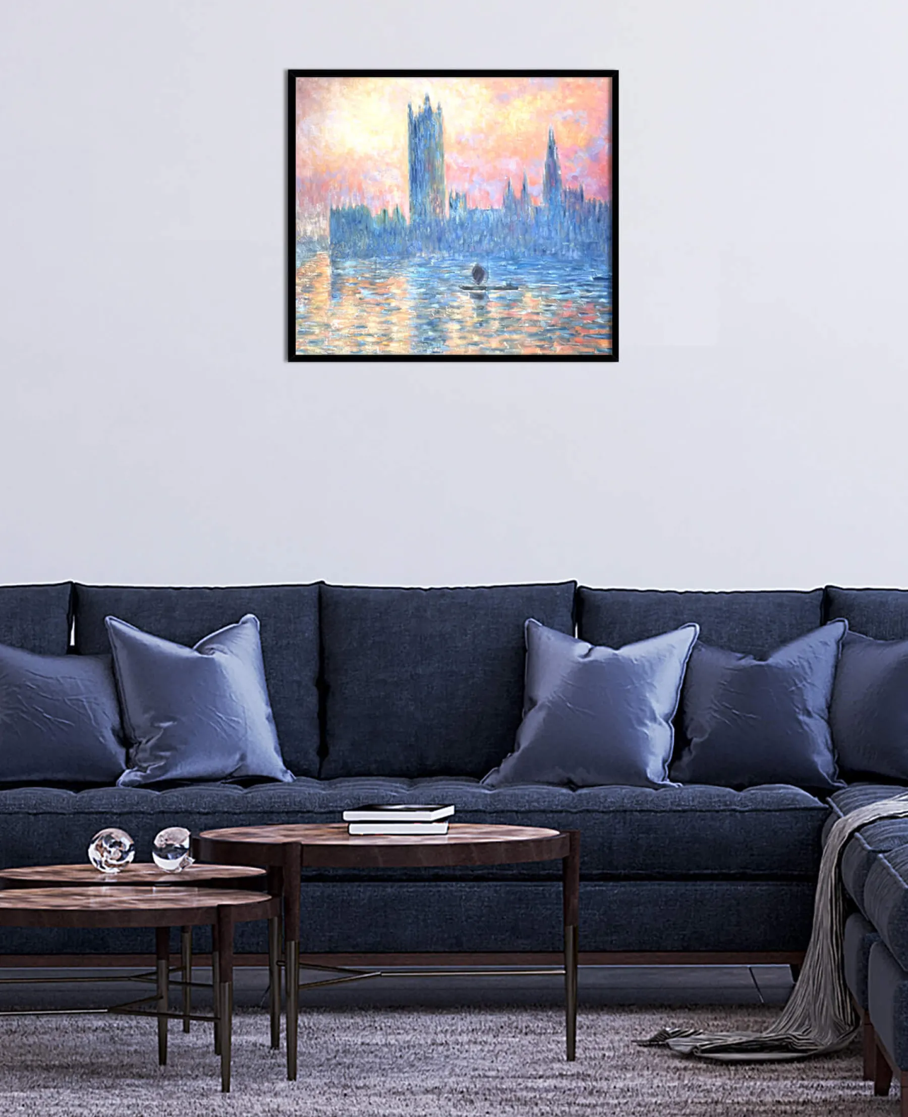 The London Parliaments series is a set of paintings by the impressionist painter Claude Monet between 1900 and 1904. It was mainly observed by the painter from a terrace of St. Thomas Hospital located on the opposite bank of the river, near Westminster Bridge. An unreal and ghostly silhouette, the Parliament appears like an apparition. The stone architecture seems to have lost all consistency. Sky and water are painted with the same tones, dominated by mauve and orange. The brushstroke is systematically fragmented into multiple colored spots, to render the density of the atmosphere and the mist.u0026nbsp;The painting reminds us of his most famous work, Impression, Sunrise.