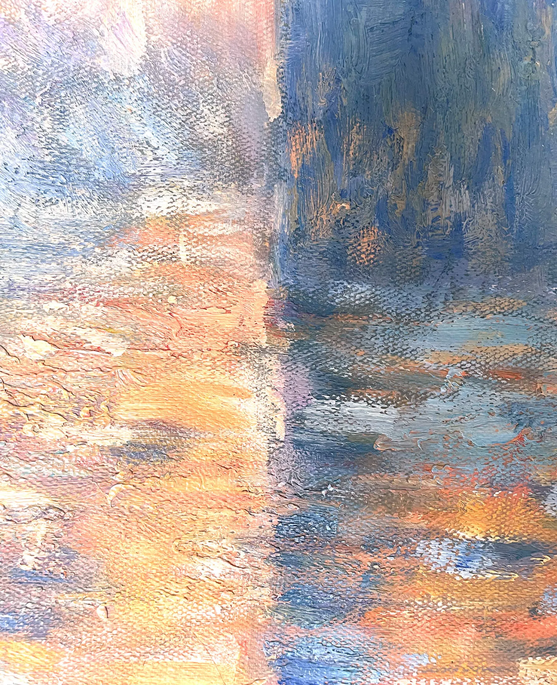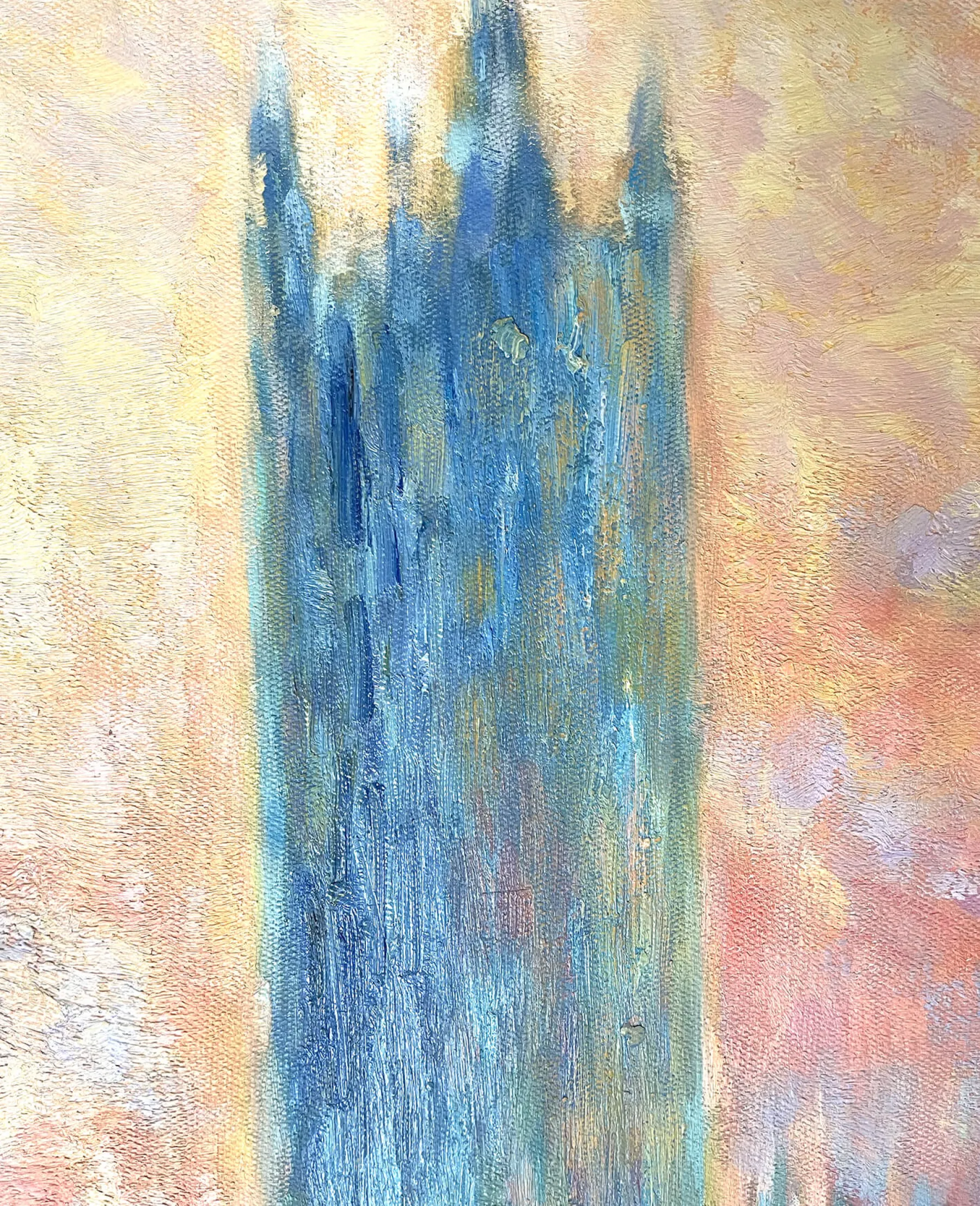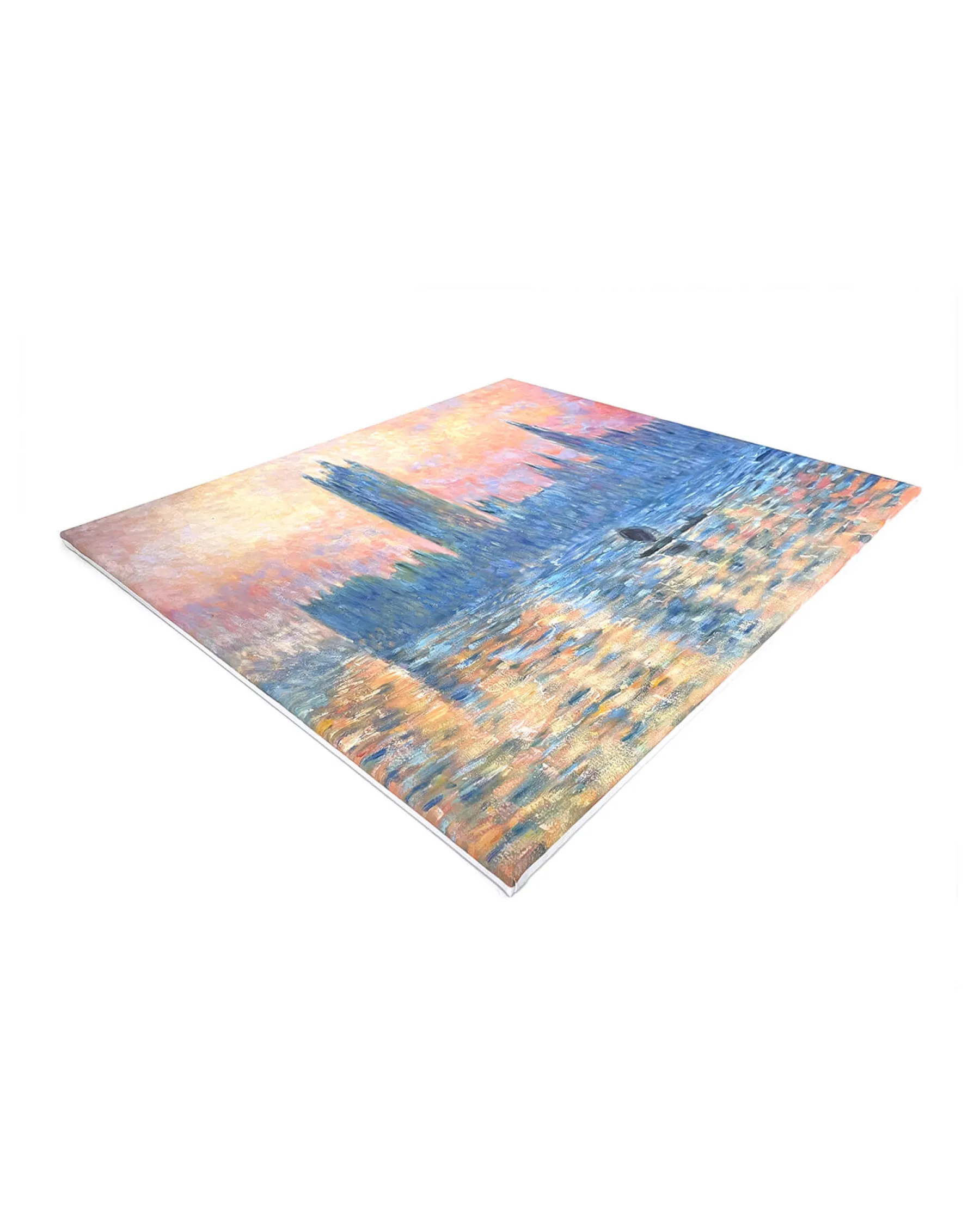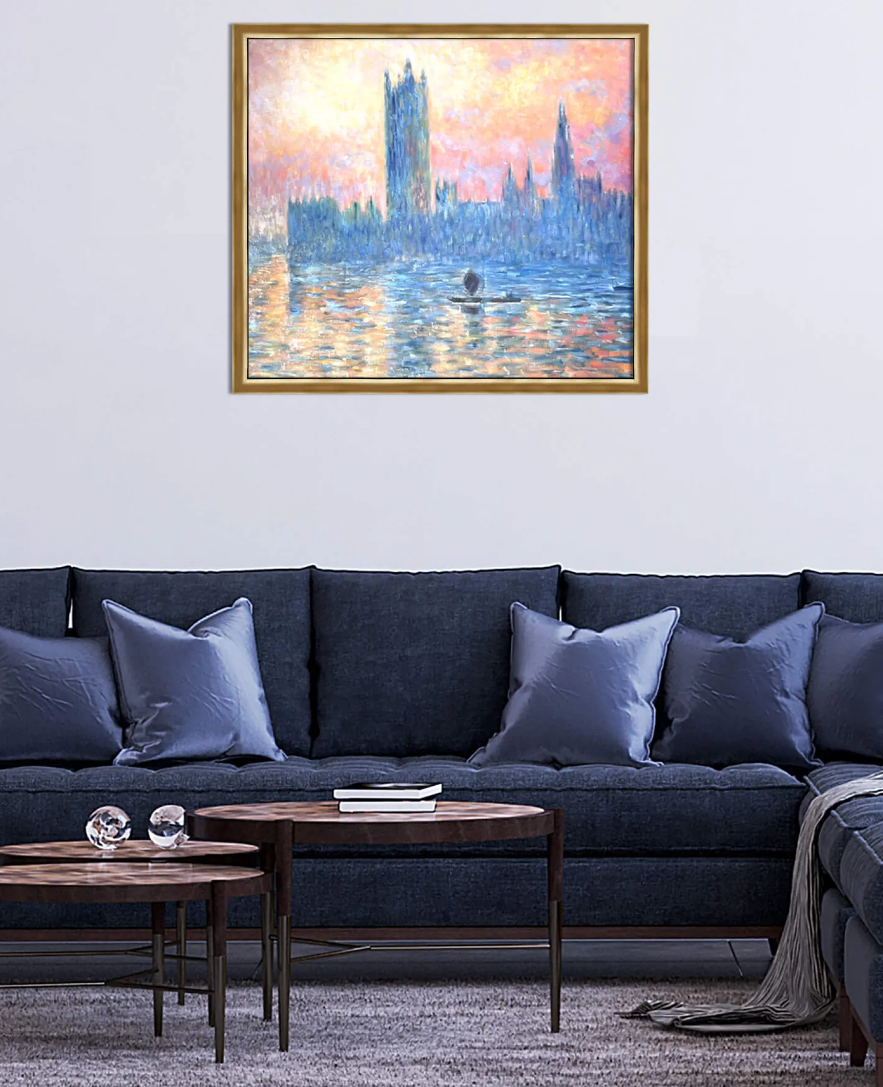 The London Parliaments series is a set of paintings by the impressionist painter Claude Monet between 1900 and 1904. It was mainly observed by the painter from a terrace of St. Thomas Hospital located on the opposite bank of the river, near Westminster Bridge. An unreal and ghostly silhouette, the Parliament appears like an apparition. The stone architecture seems to have lost all consistency. Sky and water are painted with the same tones, dominated by mauve and orange. The brushstroke is systematically fragmented into multiple colored spots, to render the density of the atmosphere and the mist.u0026nbsp;The painting reminds us of his most famous work, Impression, Sunrise.