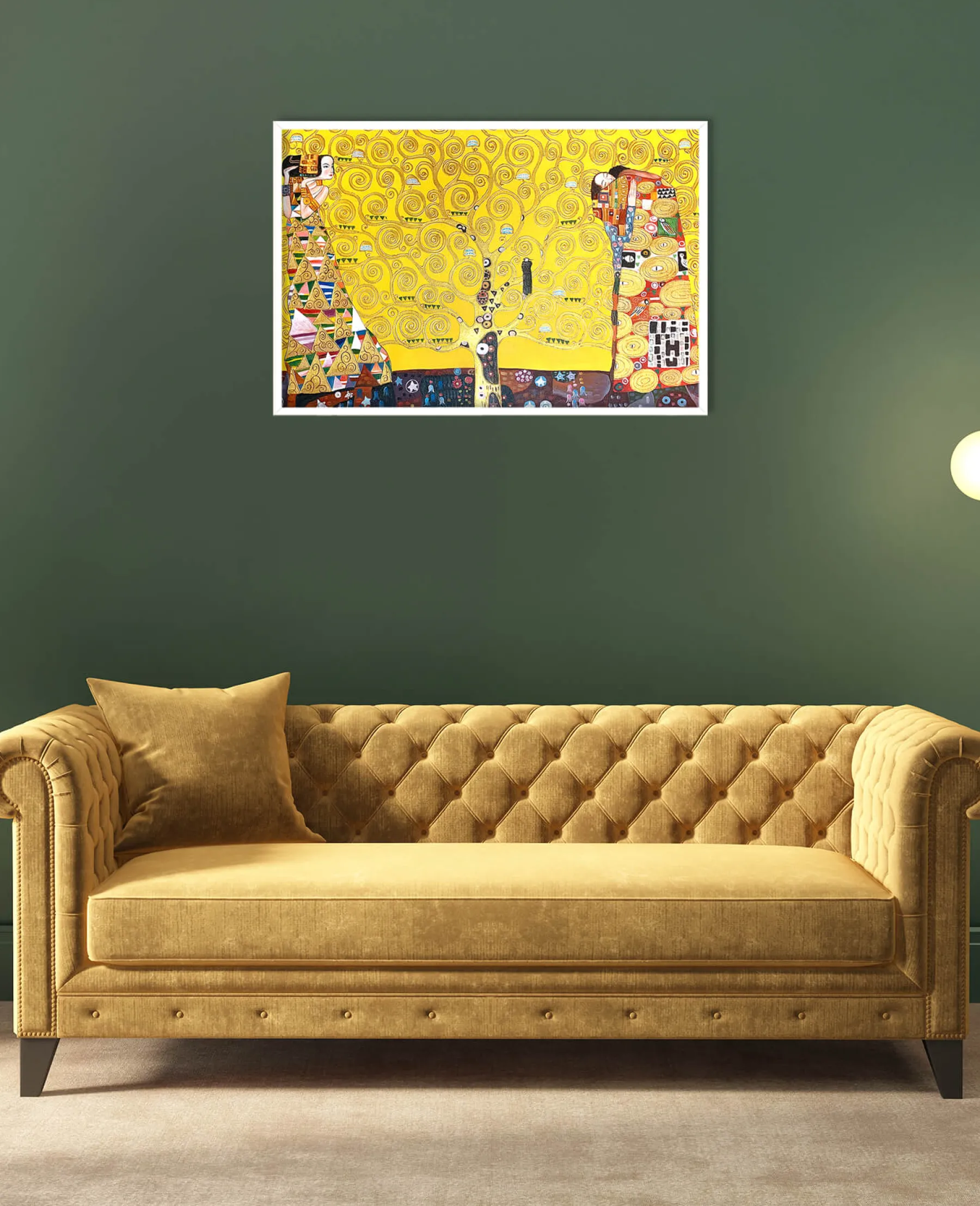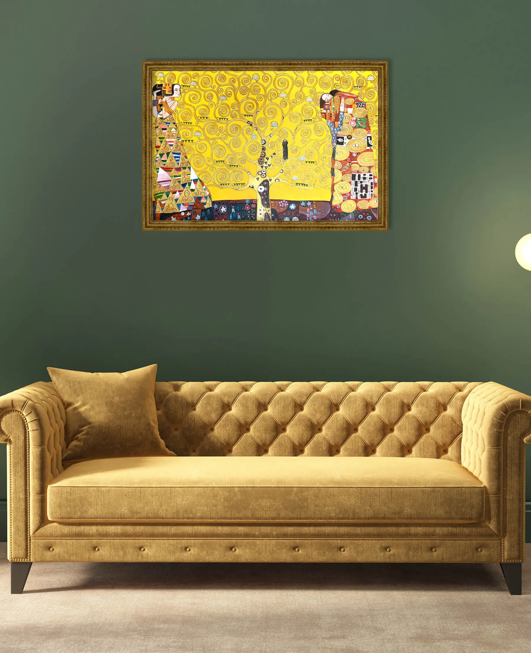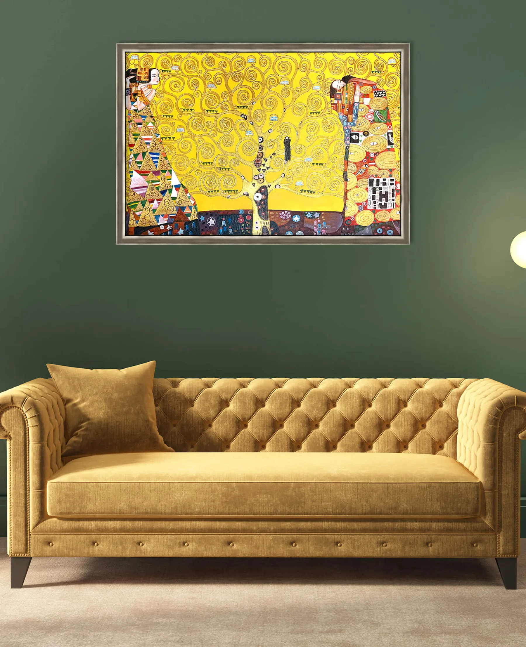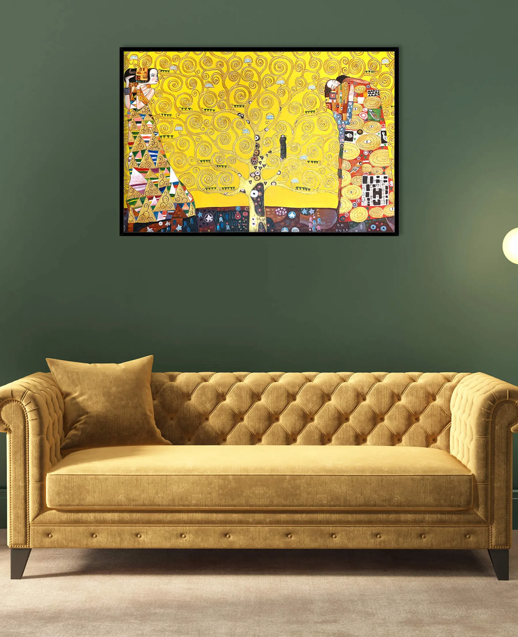 This painting is a mosaic mural by Gustav Klimt, commissioned in 1904 by a Belgian client. It is actually a triptych entitled: “The Waiting”, “The Tree of Life” and “The Fulfillment”. It represents the complexity of human feelings and is meant to be a symbol of love.u0026nbsp;The yellow background is often used by the artist in his works, as we see in The Kiss and Lady with Fan.