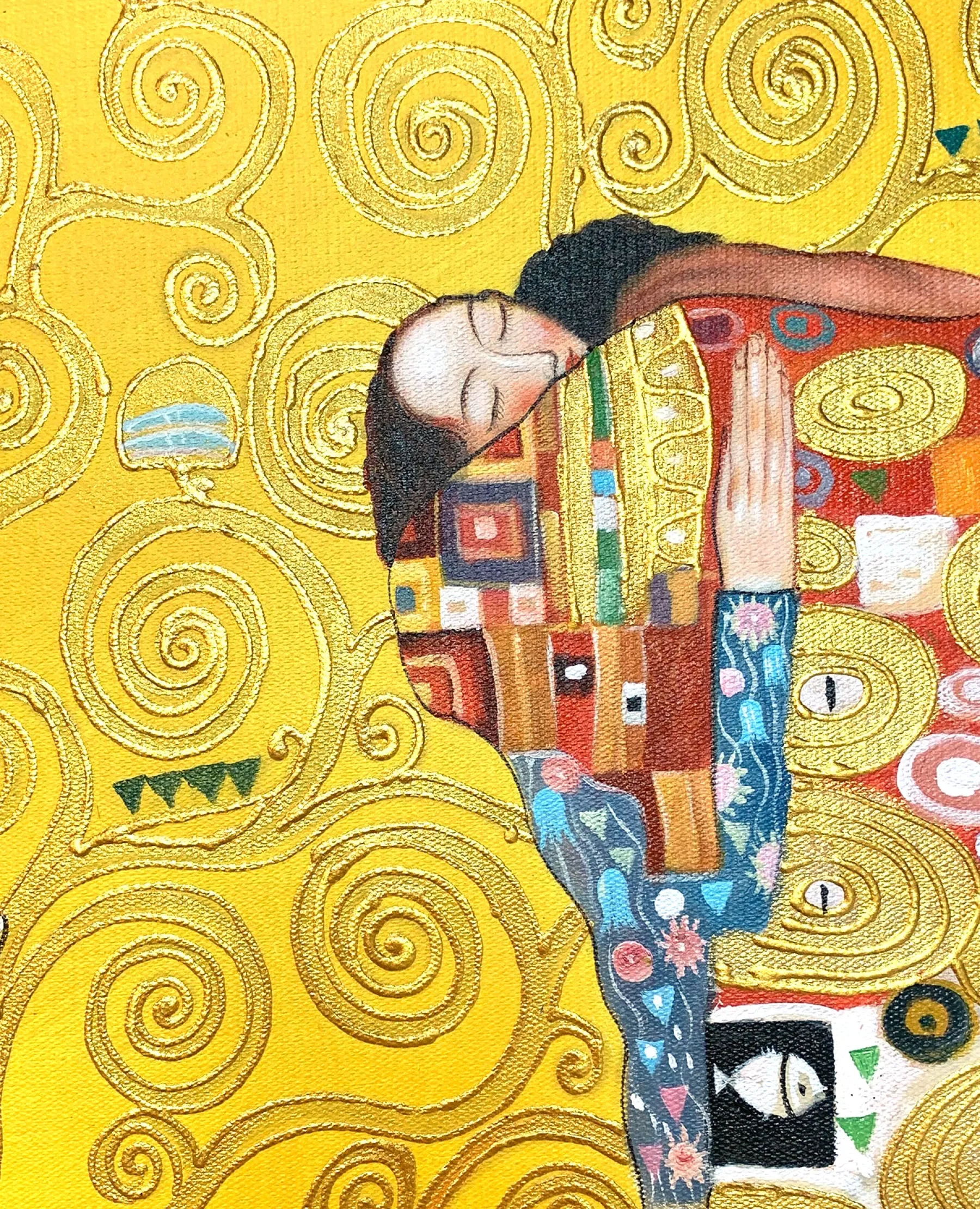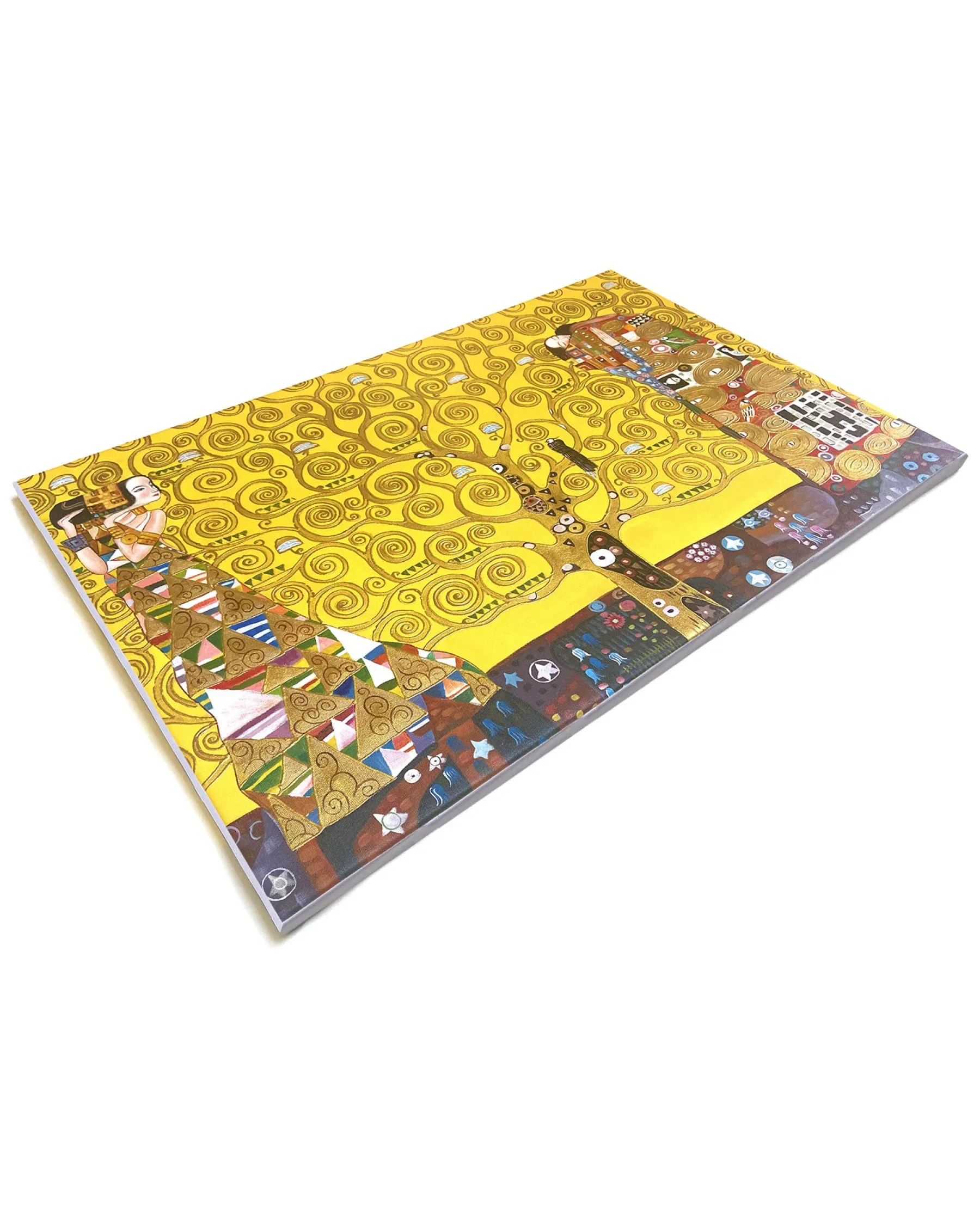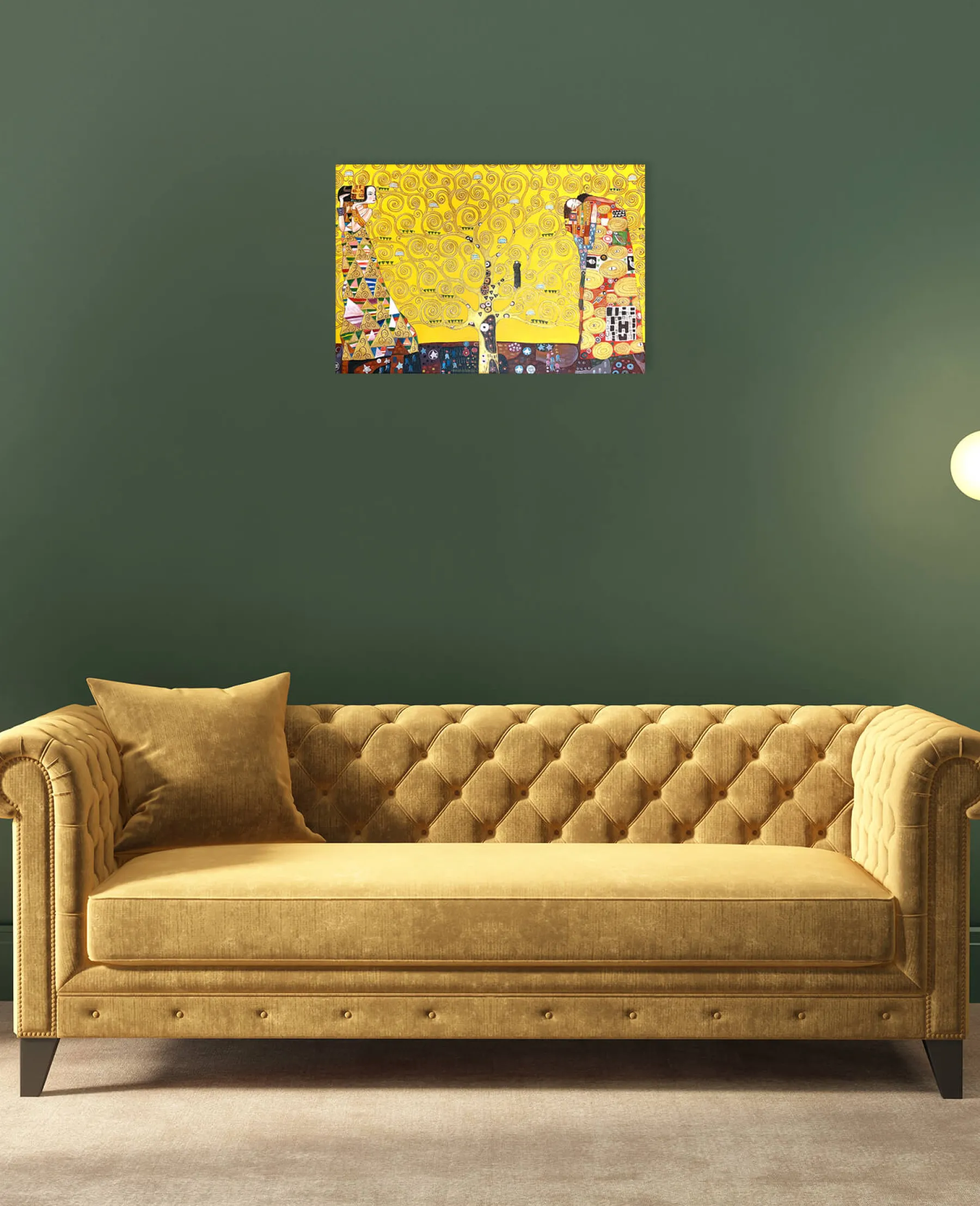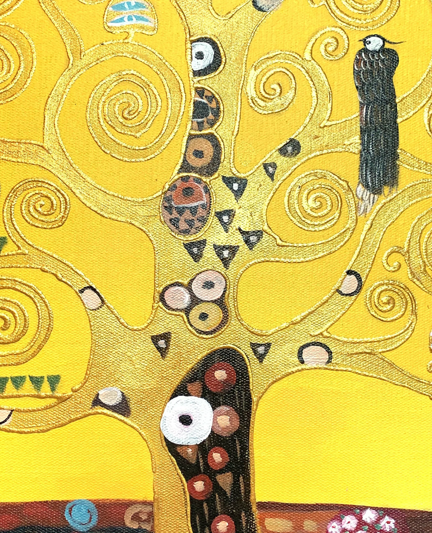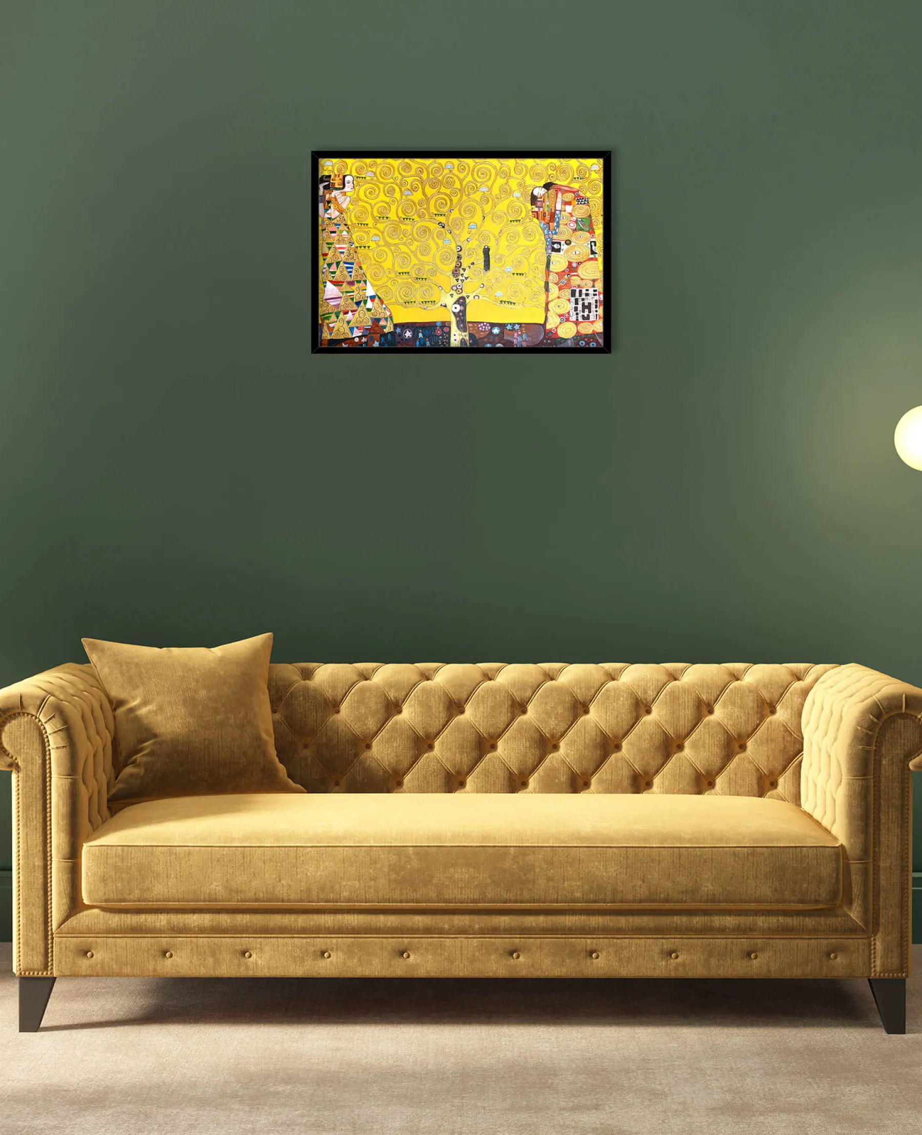 This painting is a mosaic mural by Gustav Klimt, commissioned in 1904 by a Belgian client. It is actually a triptych entitled: “The Waiting”, “The Tree of Life” and “The Fulfillment”. It represents the complexity of human feelings and is meant to be a symbol of love.u0026nbsp;The yellow background is often used by the artist in his works, as we see in The Kiss and Lady with Fan.