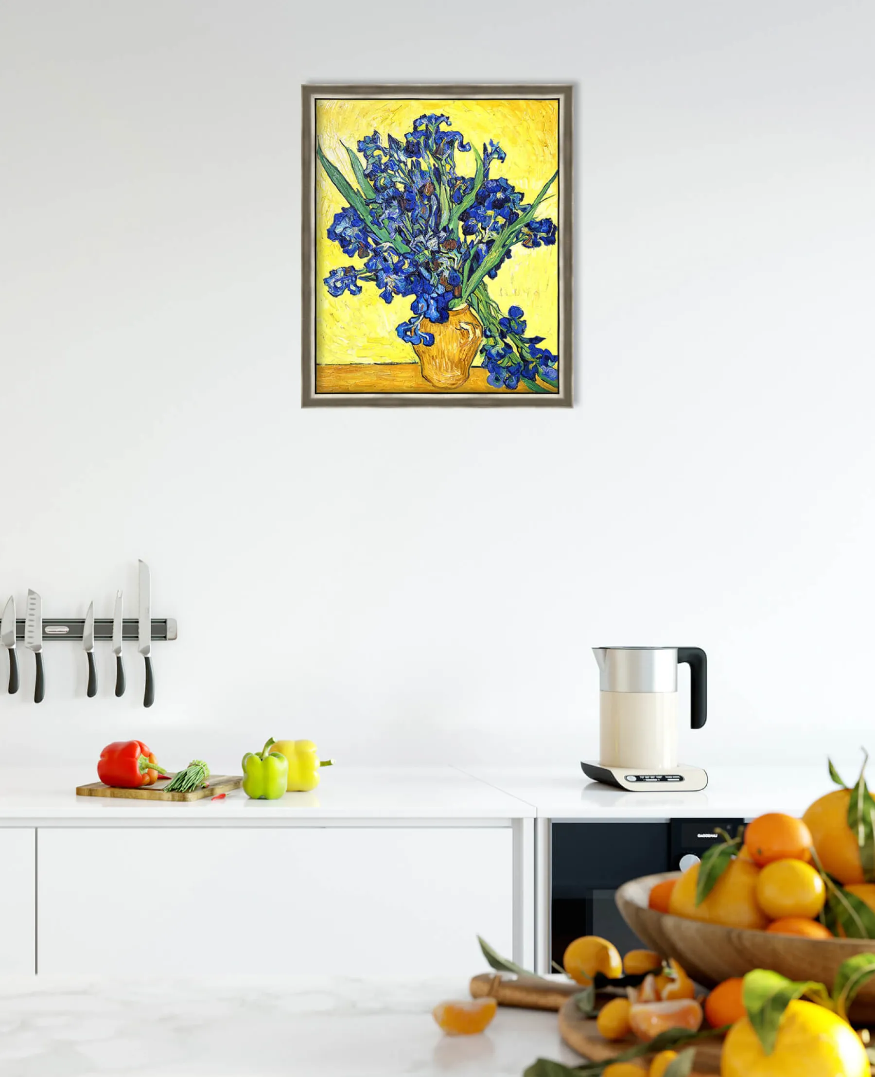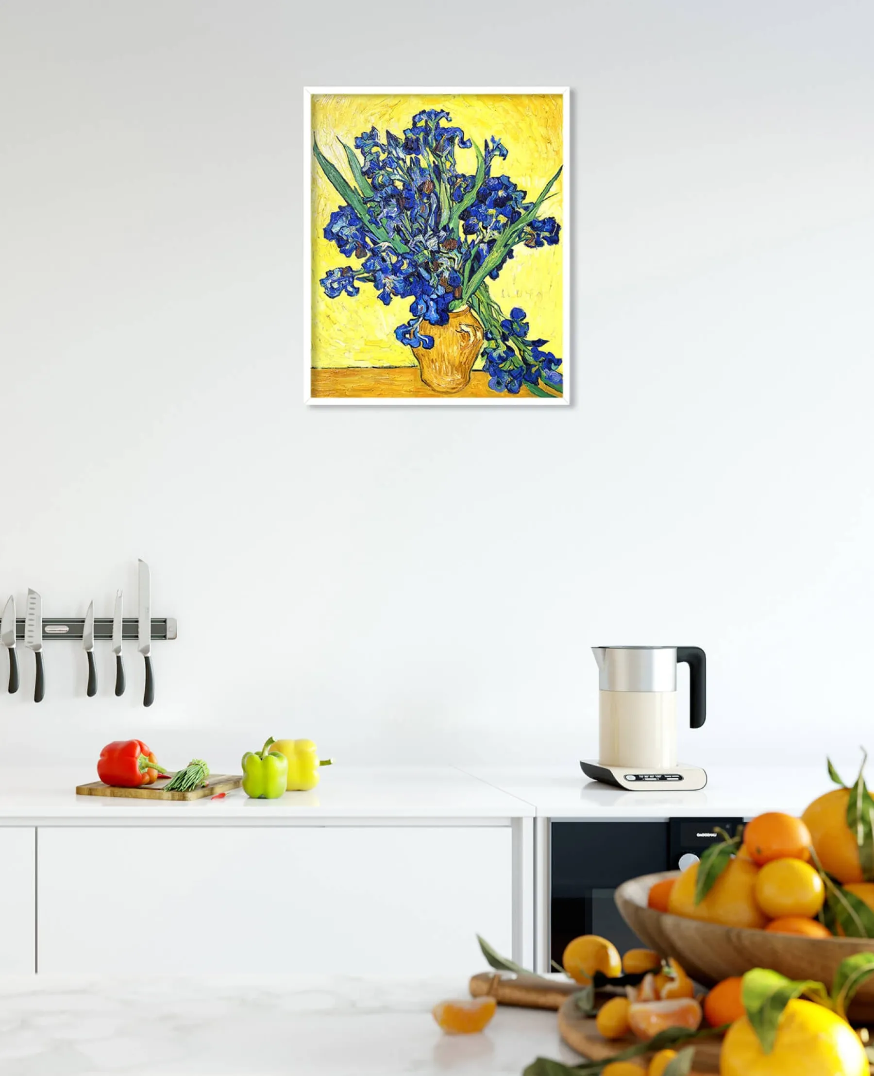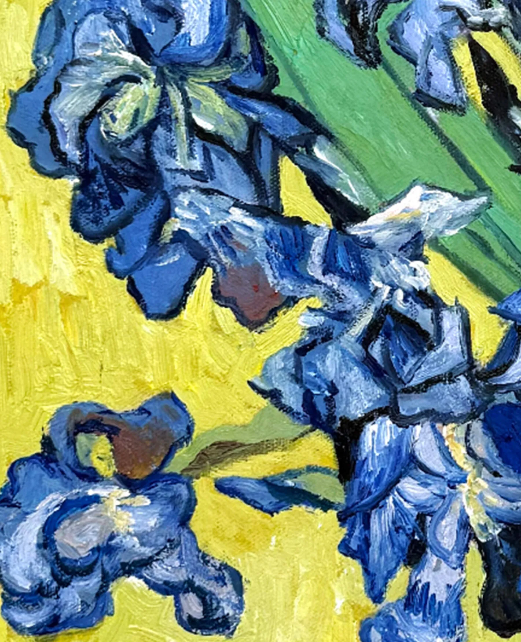 While Vincent Van Gogh had previously painted the sunflowers in very close tones, here he uses a composition in complementary colors. Indeed, the blue and violet of the irises contrast with the orange of the vase and its support as well as the yellow of the background. To break the too perfect symmetry of this post-impressionnist painting, the artist later added the broken branch on the right.