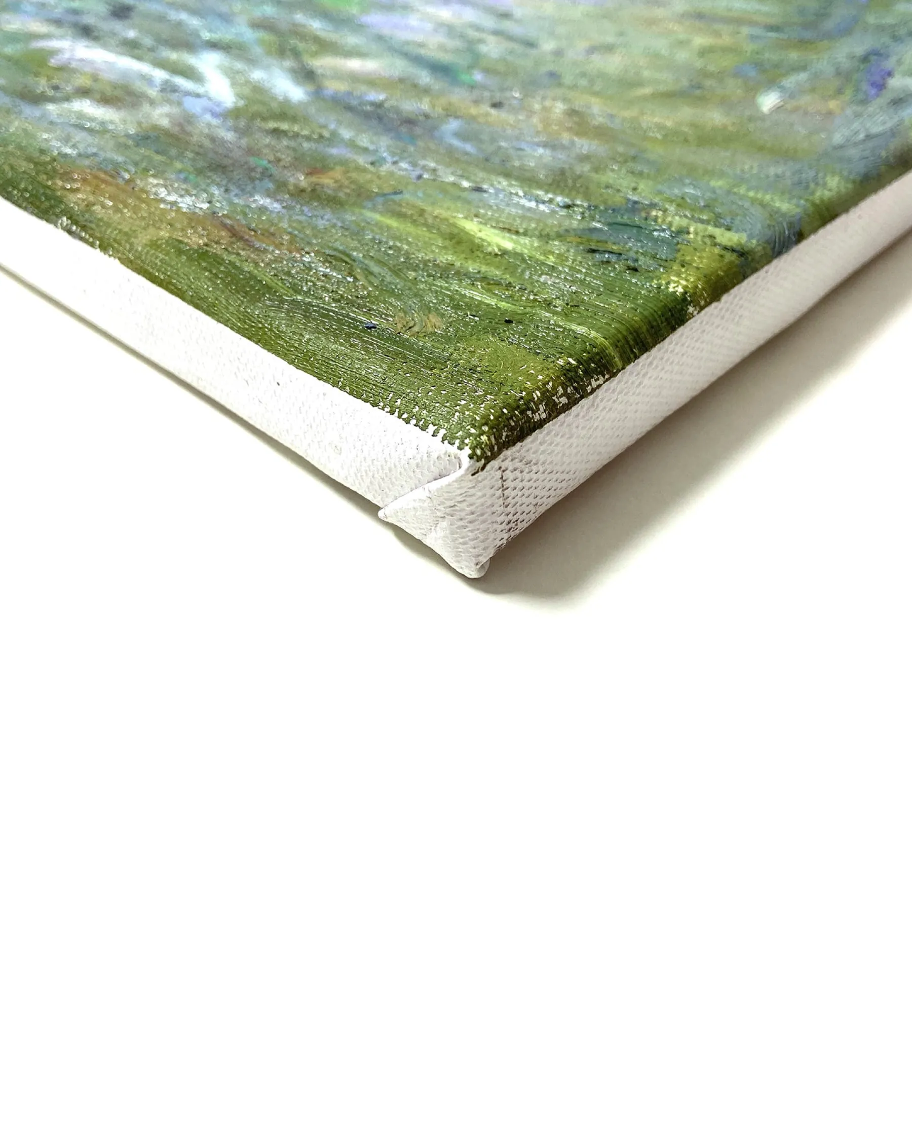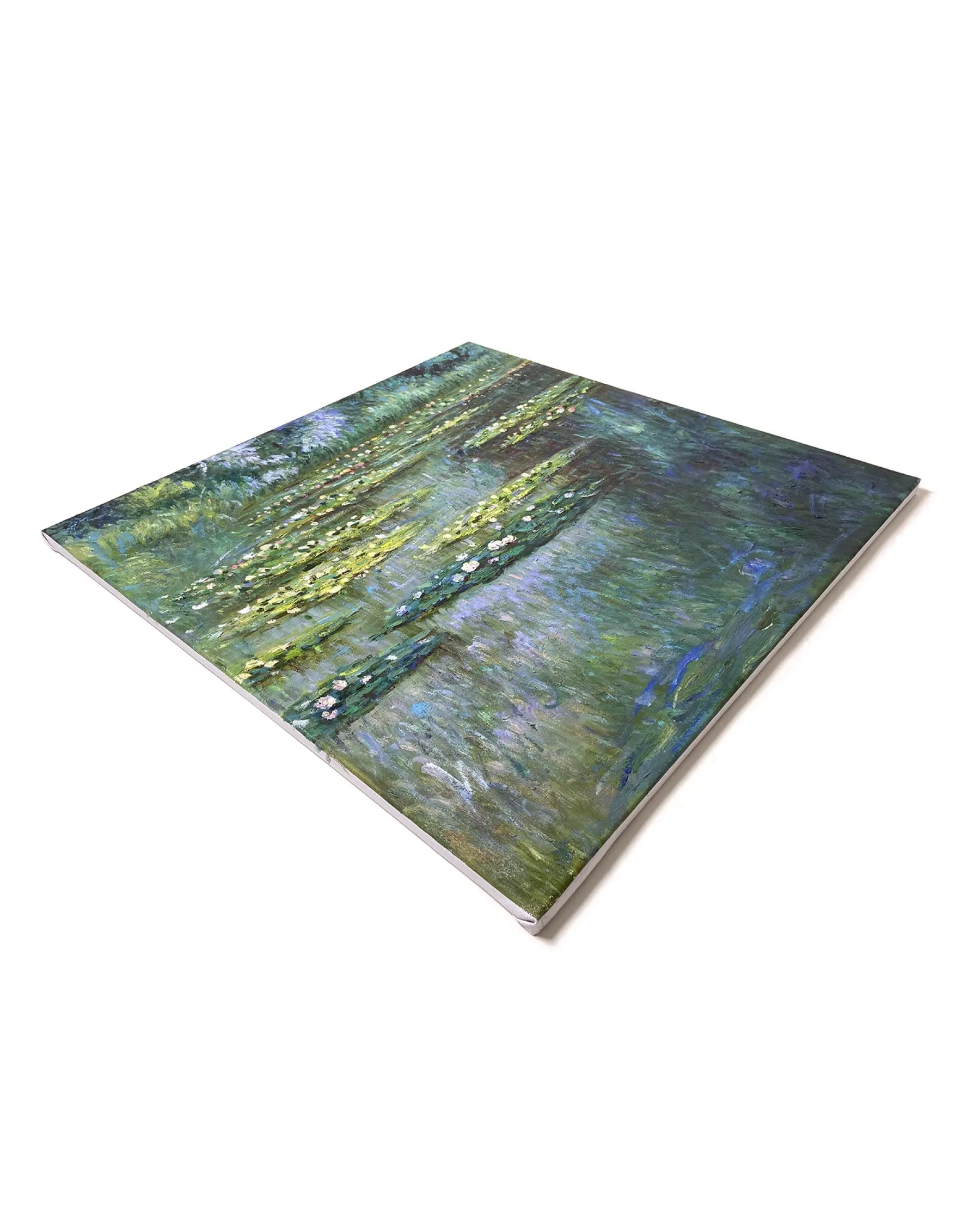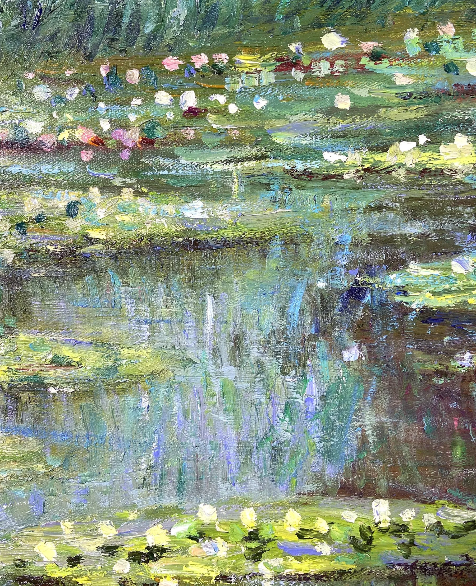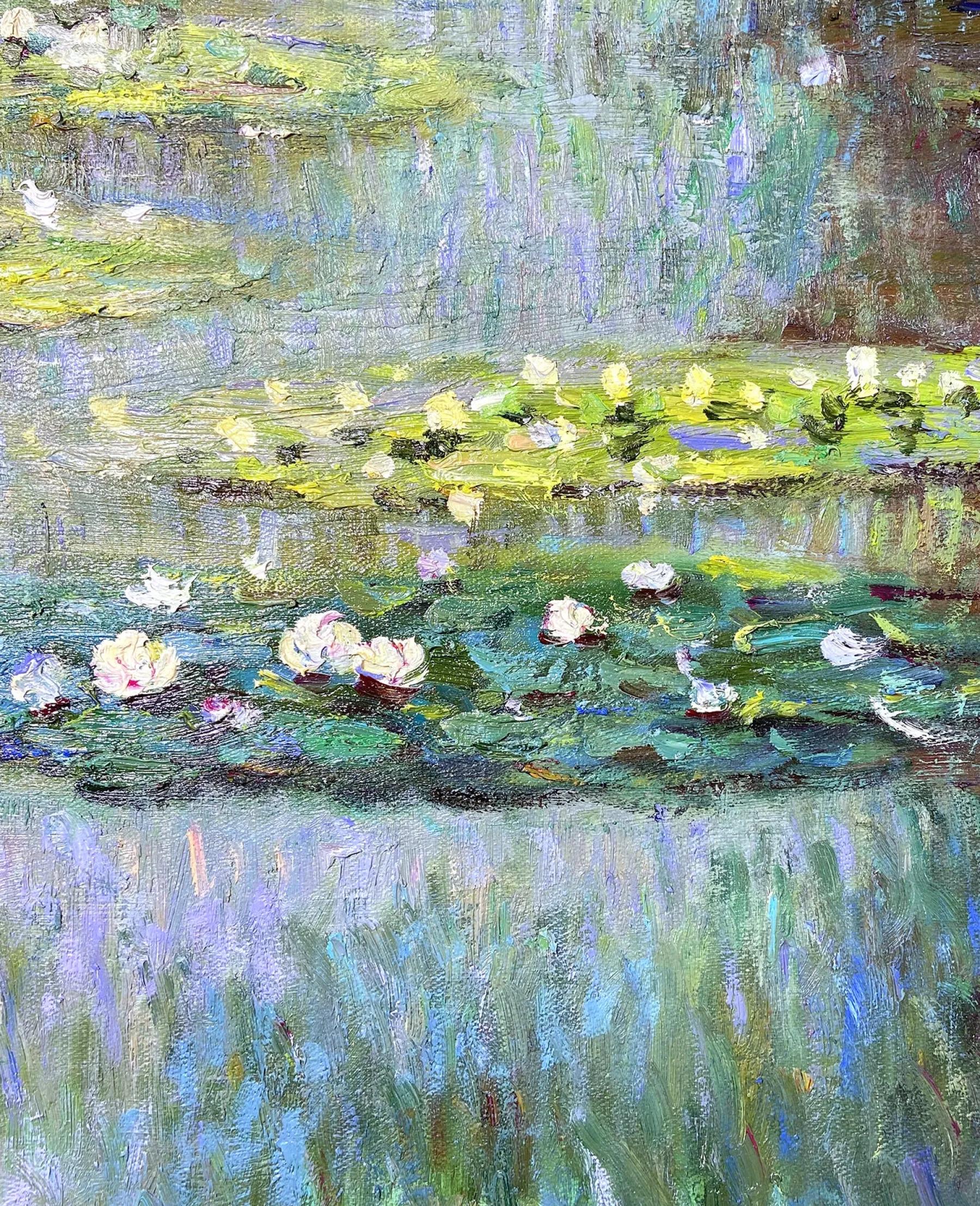 The Water Lilies is a series of approximately 250 paintings, depicting the water lily pond in the artist’s flower garden at Giverny. This work by Claude Monet is bathed in dark emerald green, punctuated by round, sulphurous and light purple touches. The concentration of the landscape in a small space allows the full intensity to be drawn. In a way, the artist operates a double focus, both on the abyssal depth of the water and on what floats on the surface.