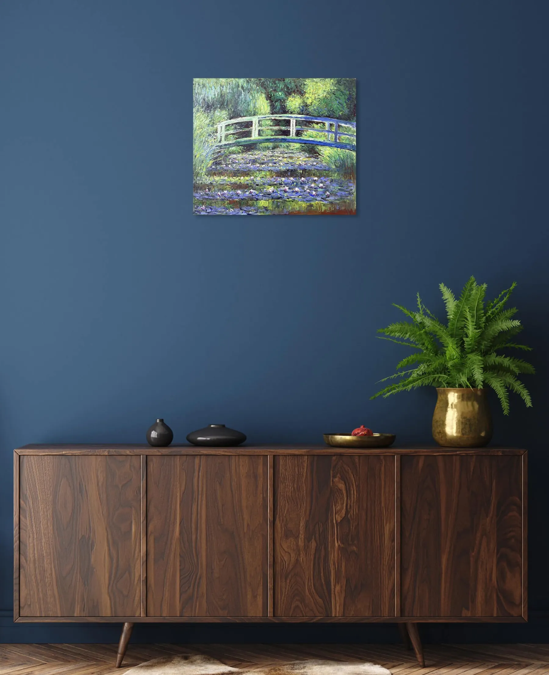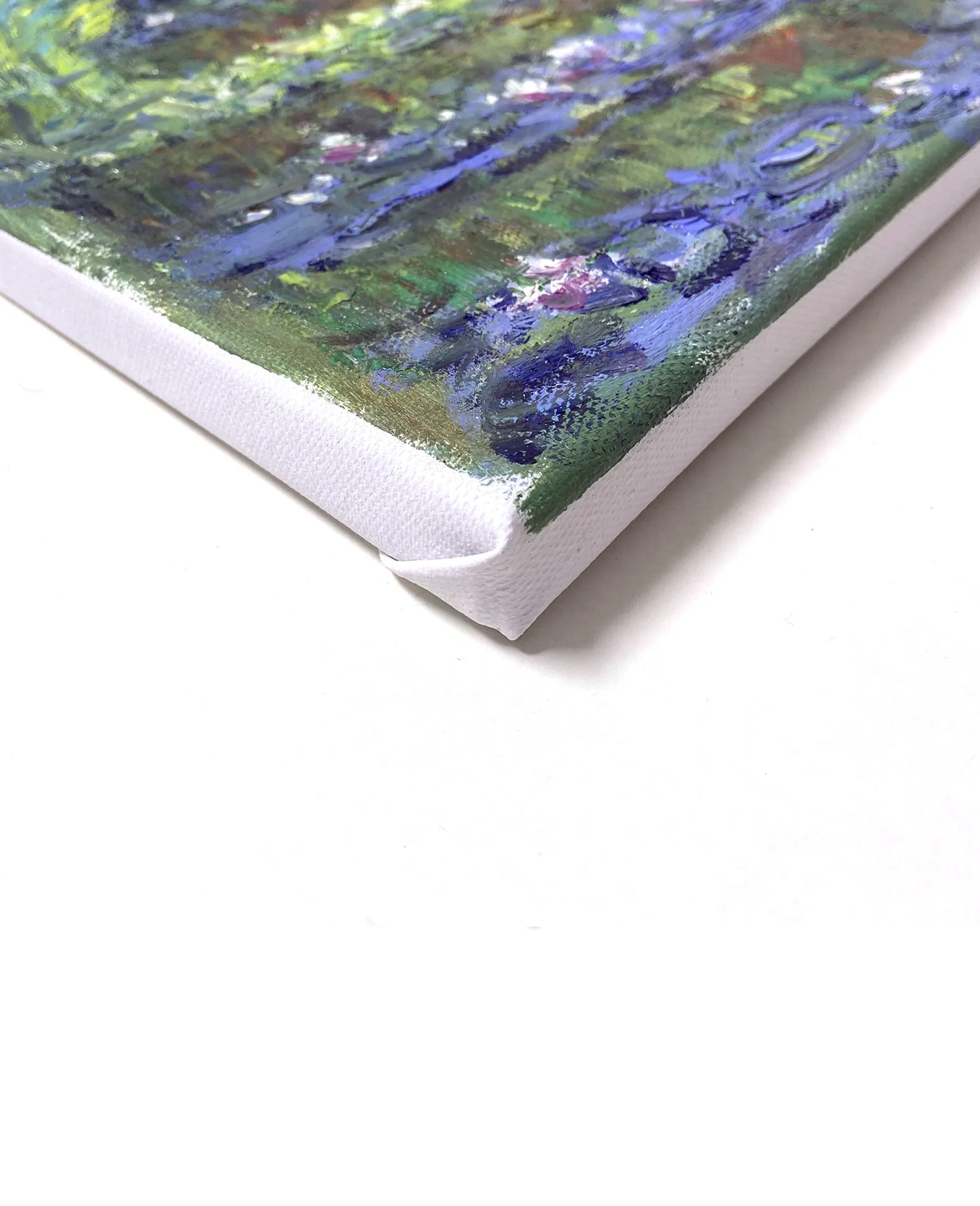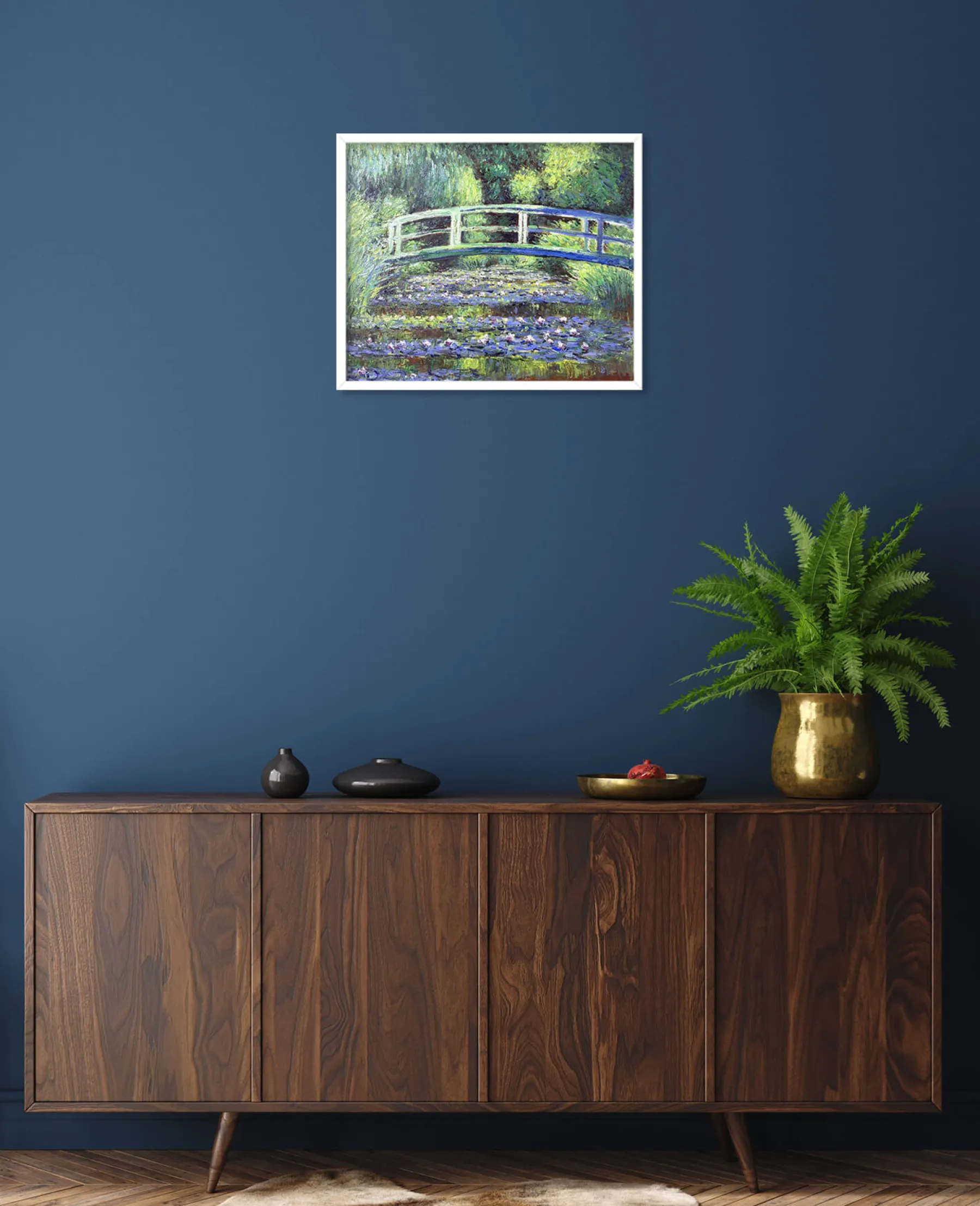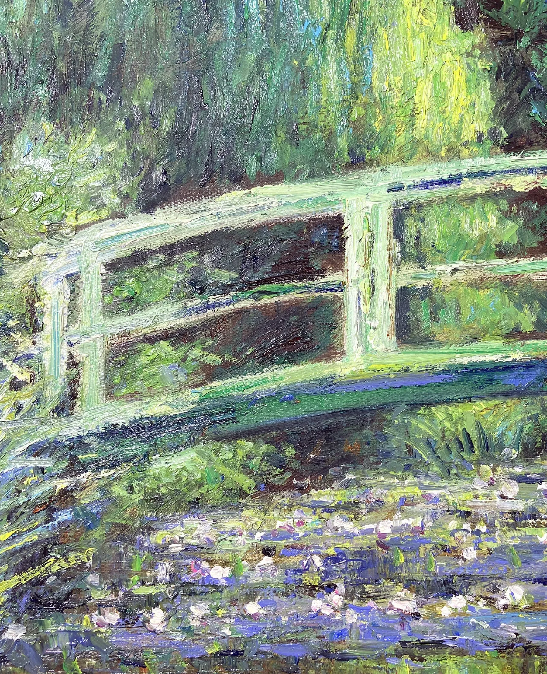 The arched shape of this bridge earned it the name “Japanese bridge”. Claude Monet was in fact inspired by one of the Japanese prints in his private collection. The exuberance of the vegetation, however, refers more to Mediterranean gardens. The painter emphasizes here a general harmony through the symmetry of the composition of the impressionnist painting by using the format of the canvas with the bluish-green cameo, aquatic plants, reeds, and irises on the banks.