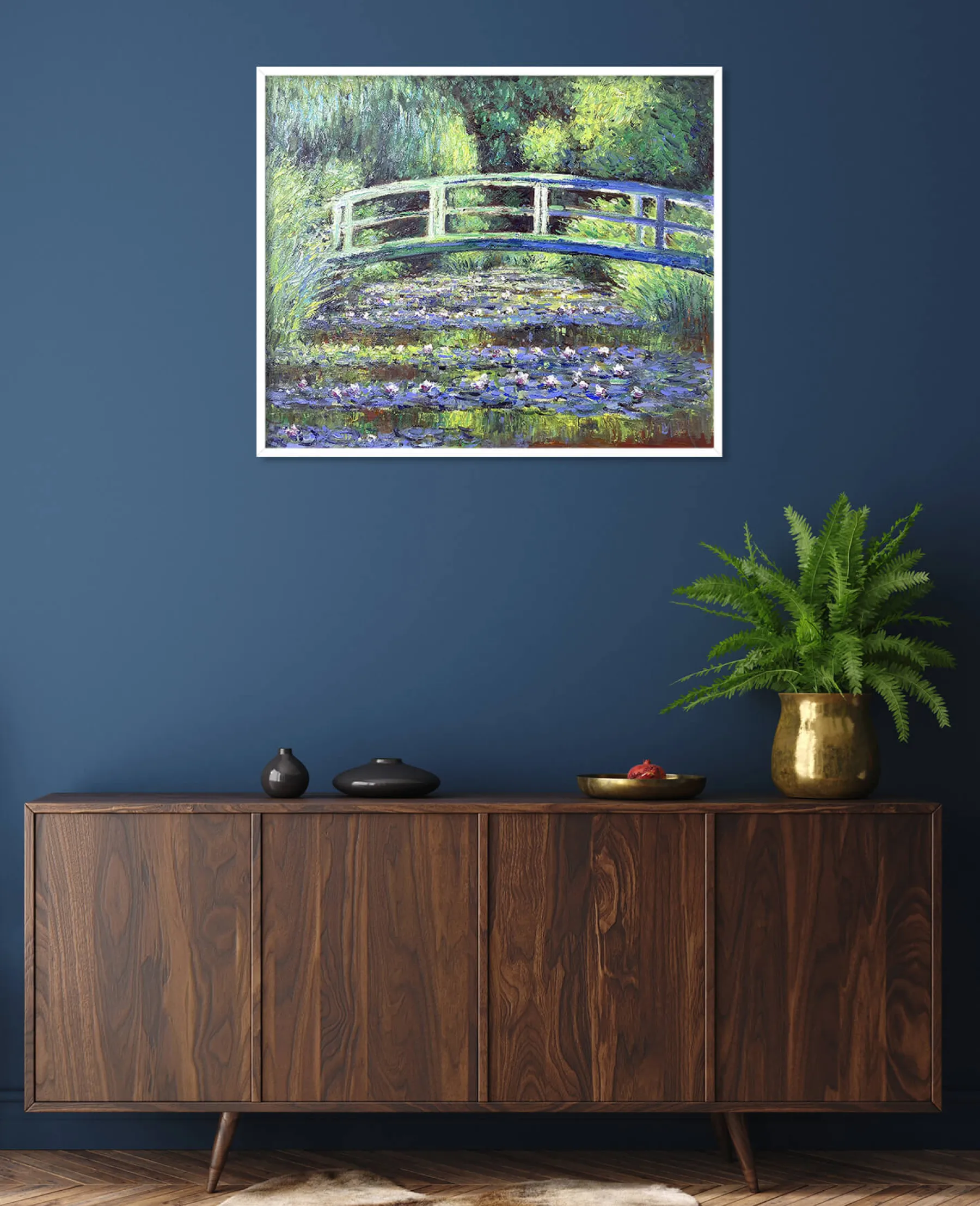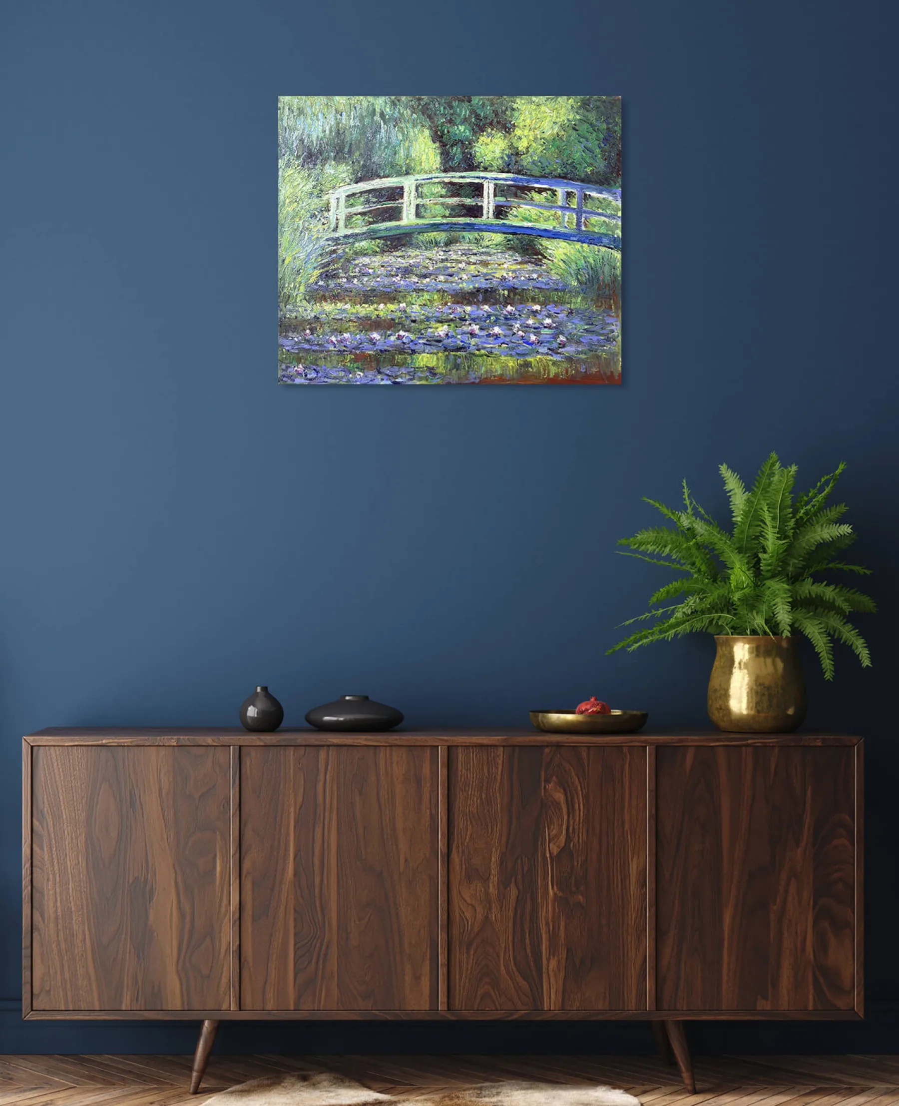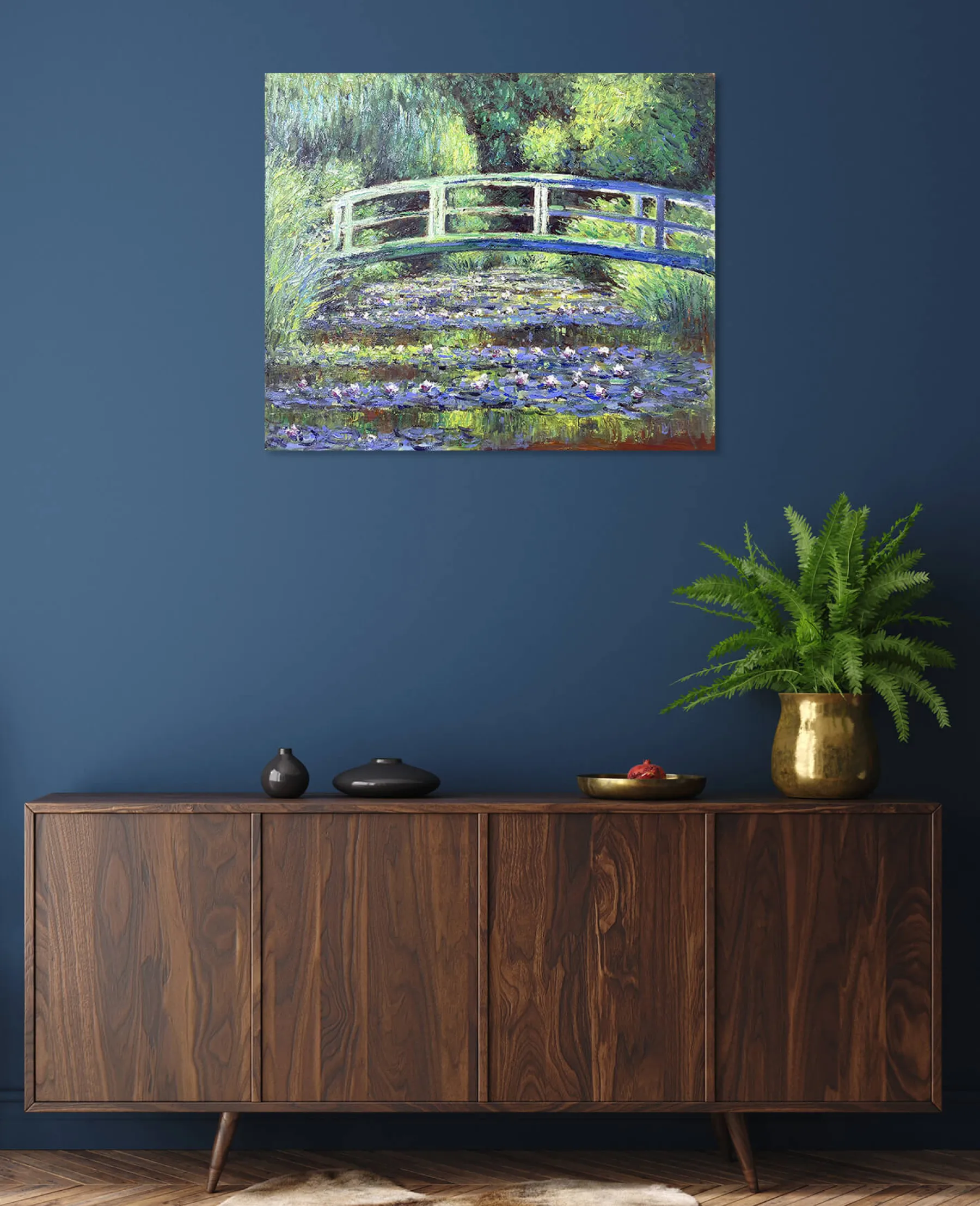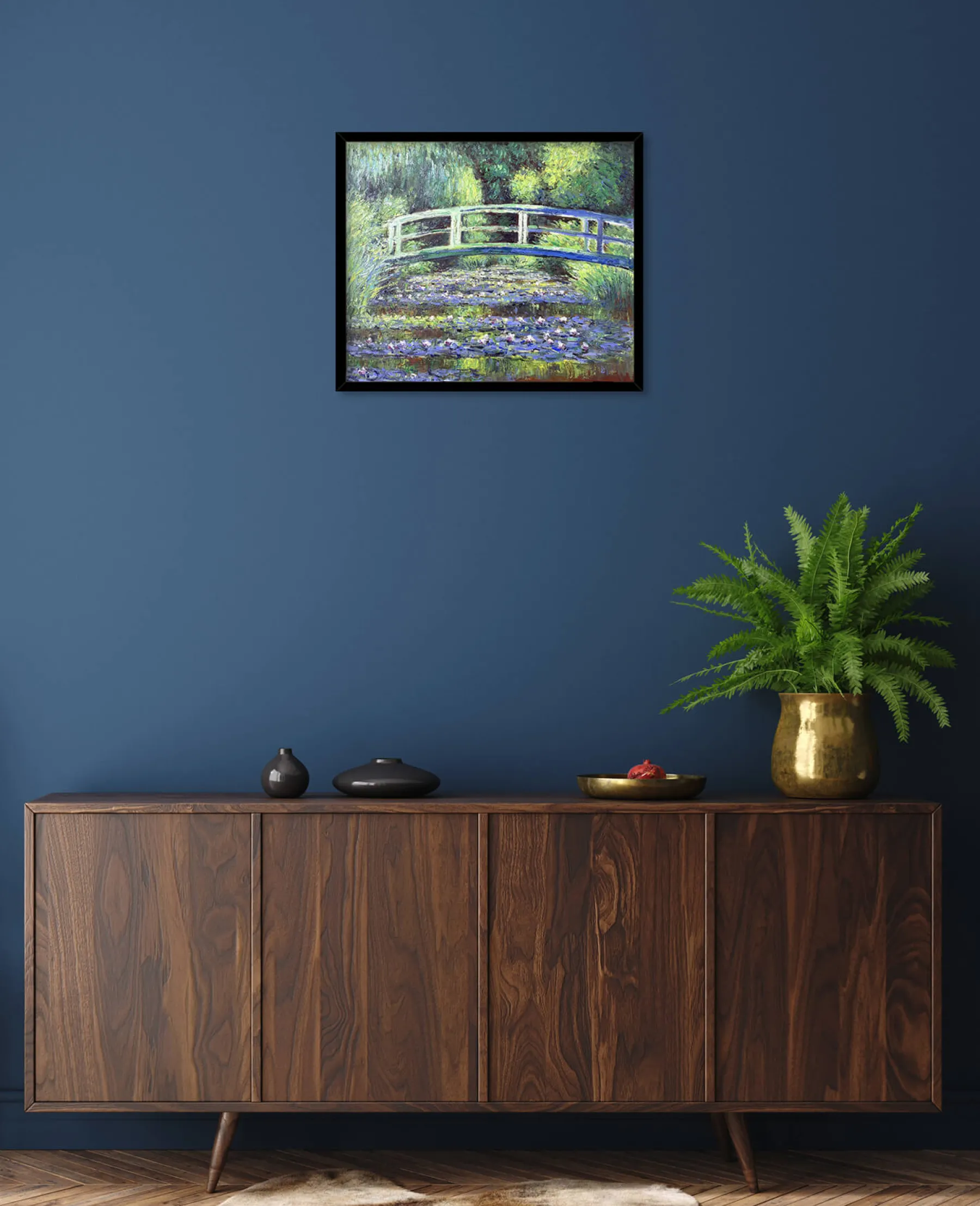 The arched shape of this bridge earned it the name “Japanese bridge”. Claude Monet was in fact inspired by one of the Japanese prints in his private collection. The exuberance of the vegetation, however, refers more to Mediterranean gardens. The painter emphasizes here a general harmony through the symmetry of the composition of the impressionnist painting by using the format of the canvas with the bluish-green cameo, aquatic plants, reeds, and irises on the banks.