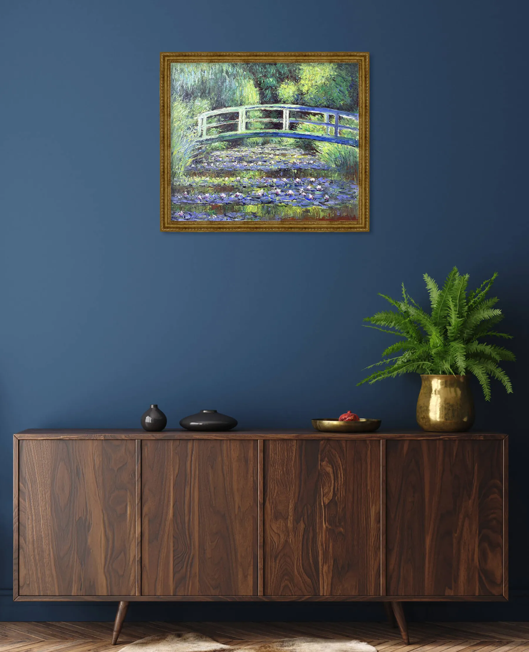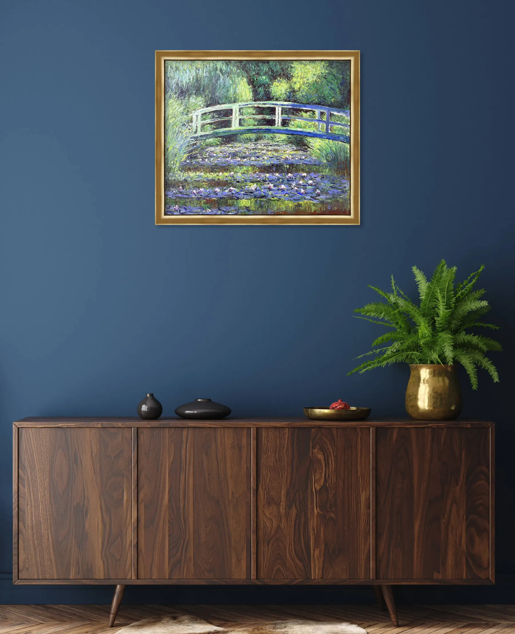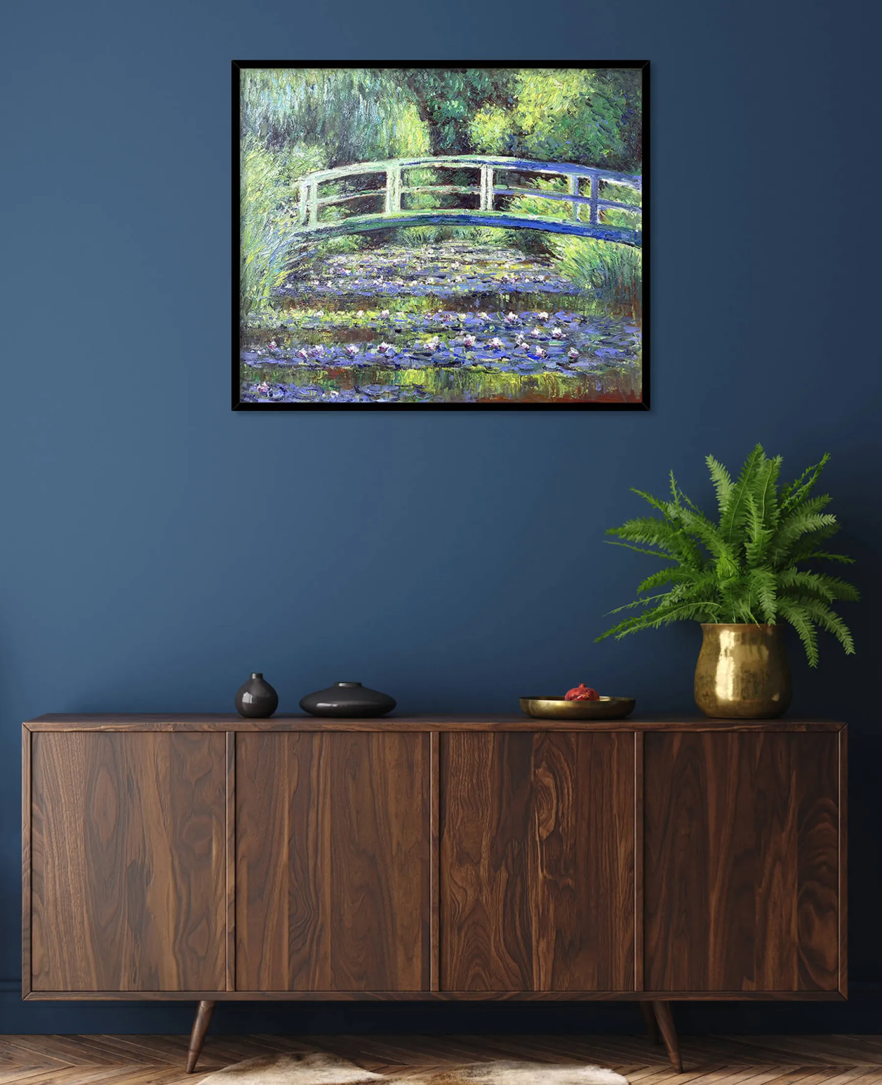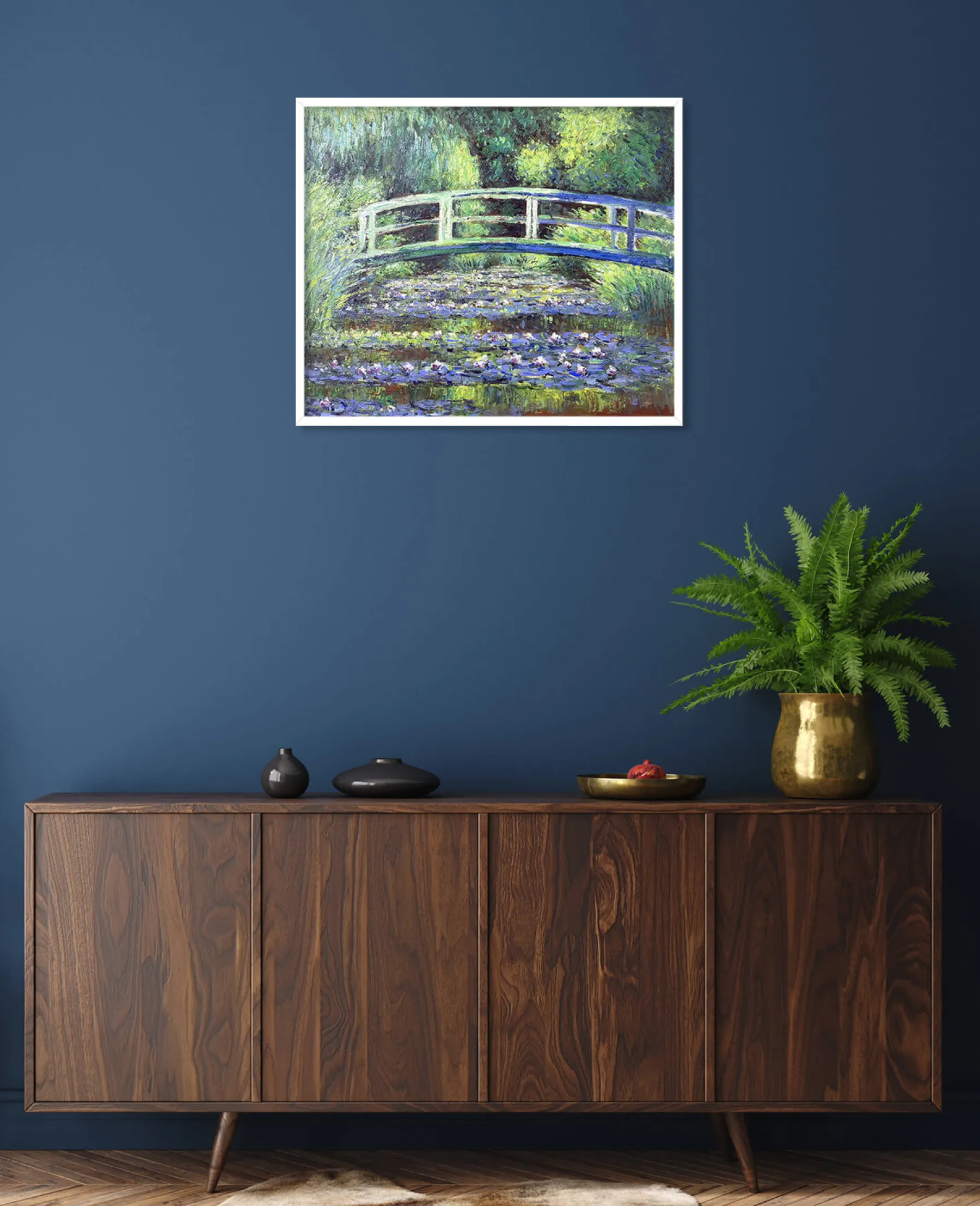 The arched shape of this bridge earned it the name “Japanese bridge”. Claude Monet was in fact inspired by one of the Japanese prints in his private collection. The exuberance of the vegetation, however, refers more to Mediterranean gardens. The painter emphasizes here a general harmony through the symmetry of the composition of the impressionnist painting by using the format of the canvas with the bluish-green cameo, aquatic plants, reeds, and irises on the banks.