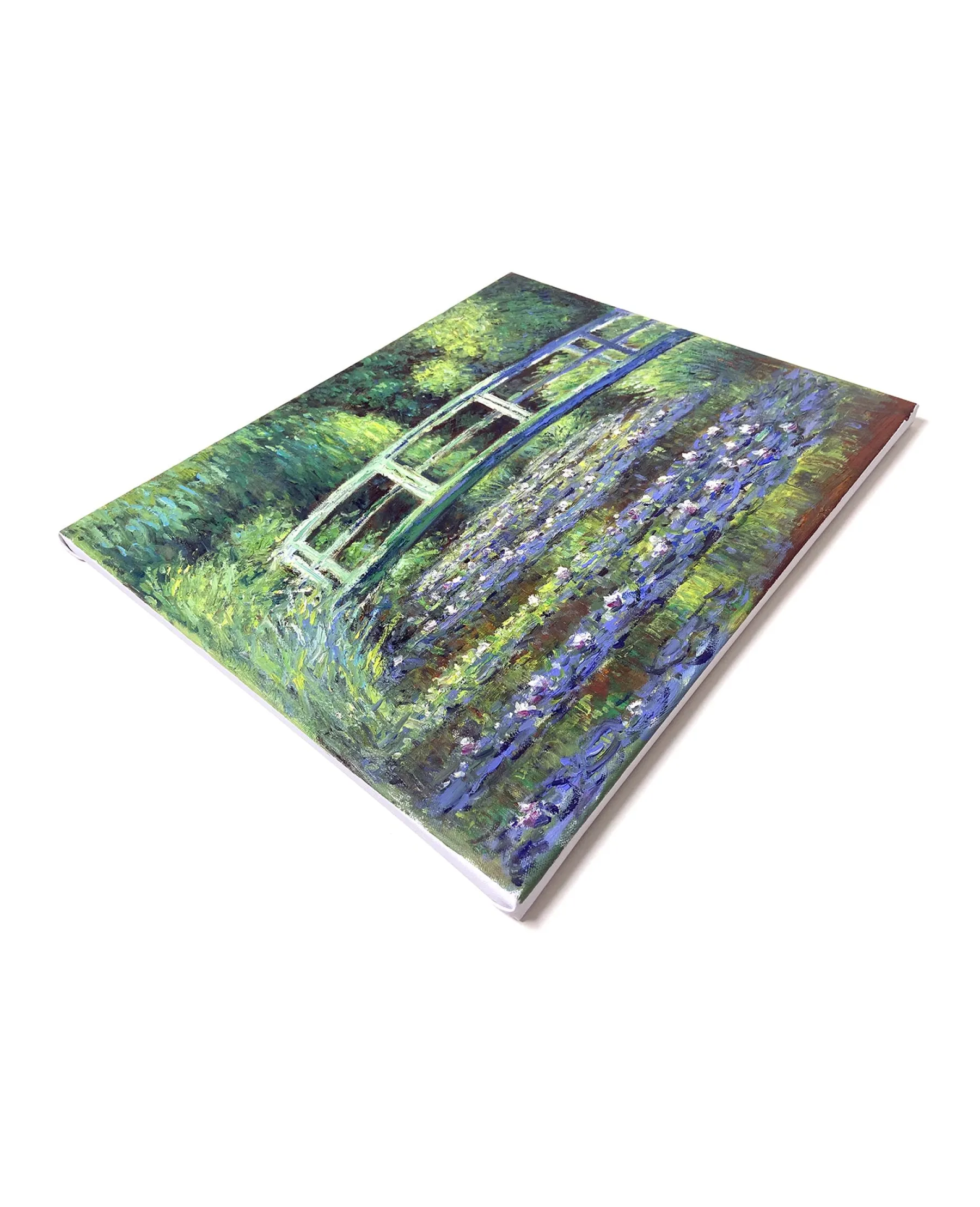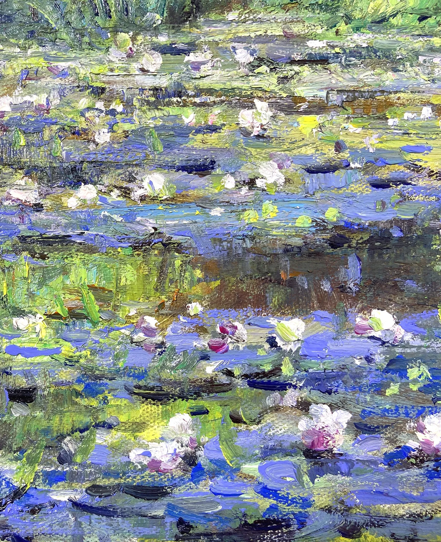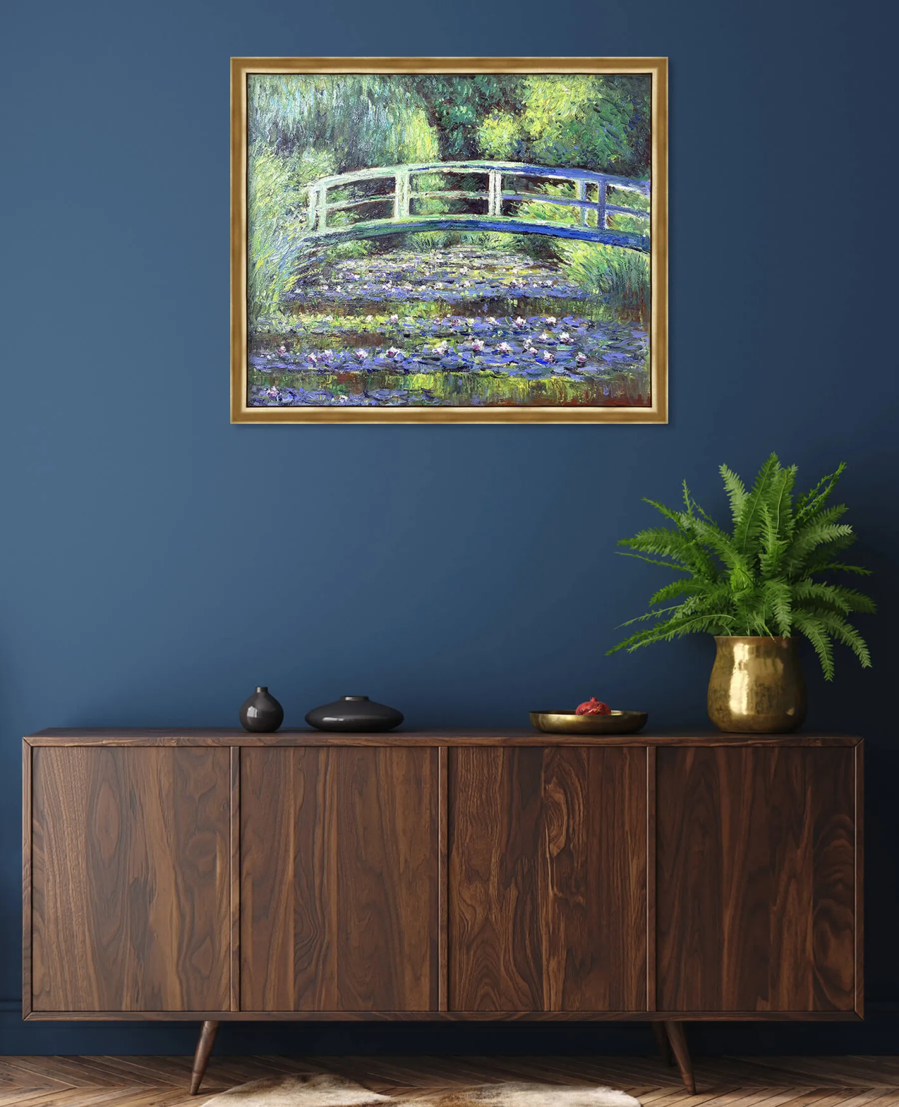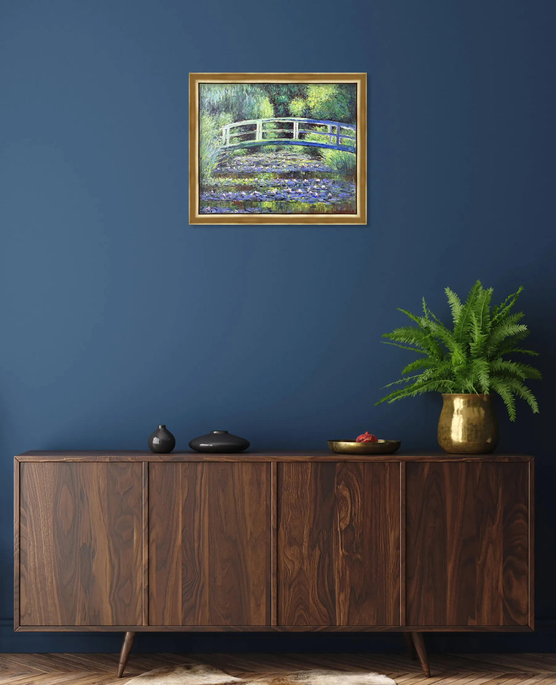 The arched shape of this bridge earned it the name “Japanese bridge”. Claude Monet was in fact inspired by one of the Japanese prints in his private collection. The exuberance of the vegetation, however, refers more to Mediterranean gardens. The painter emphasizes here a general harmony through the symmetry of the composition of the impressionnist painting by using the format of the canvas with the bluish-green cameo, aquatic plants, reeds, and irises on the banks.